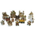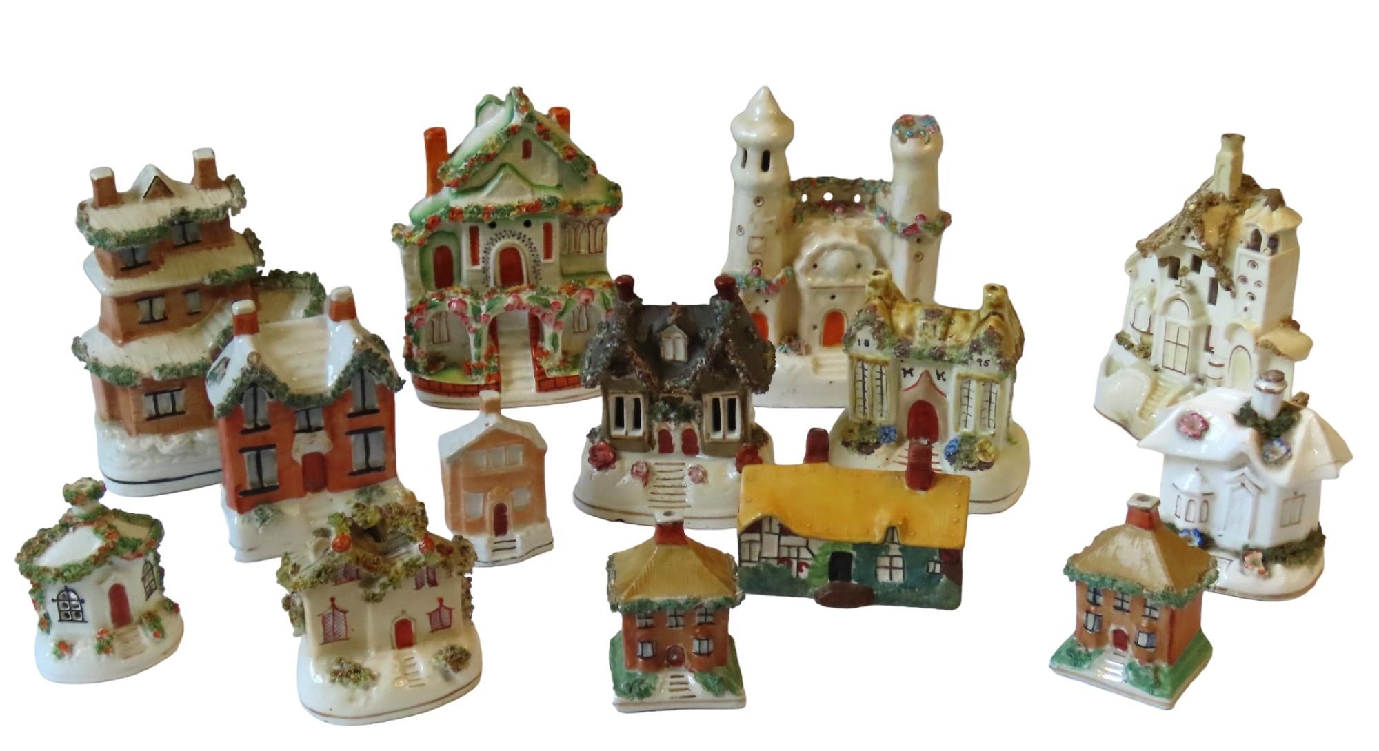 A STAFFORDSHIRE MONEY BOX IN THE FORM OF A 3-STOREY COTTAGE, another money box, Three smaller Staffordshire cottage money boxes and various other pastille burners and buildings. 18 cms max