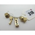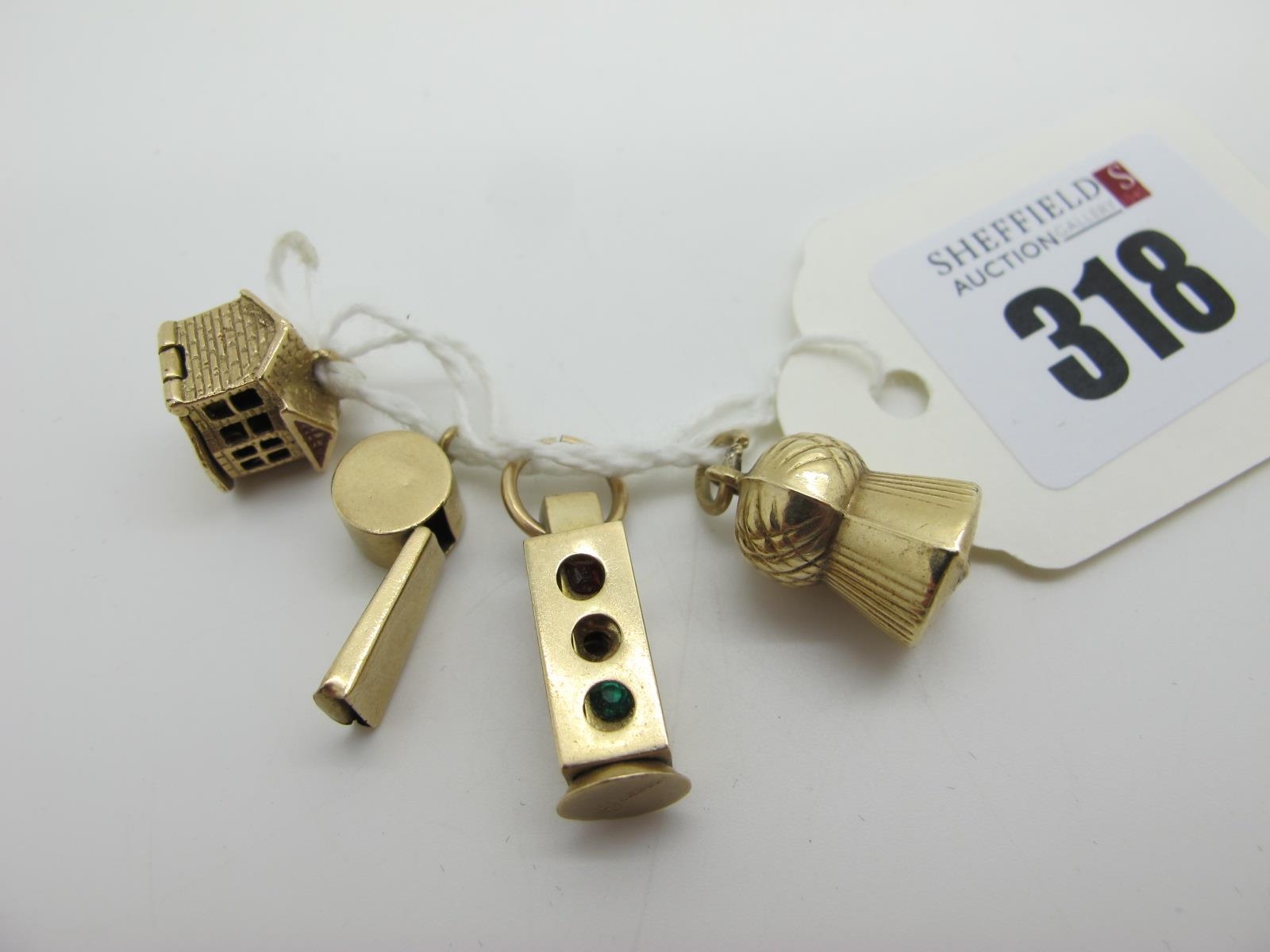 Four 9ct Gold Novelty Pendant / Charms, including a whistle, house, etc (total weight 6grams). (4)
