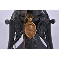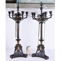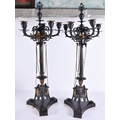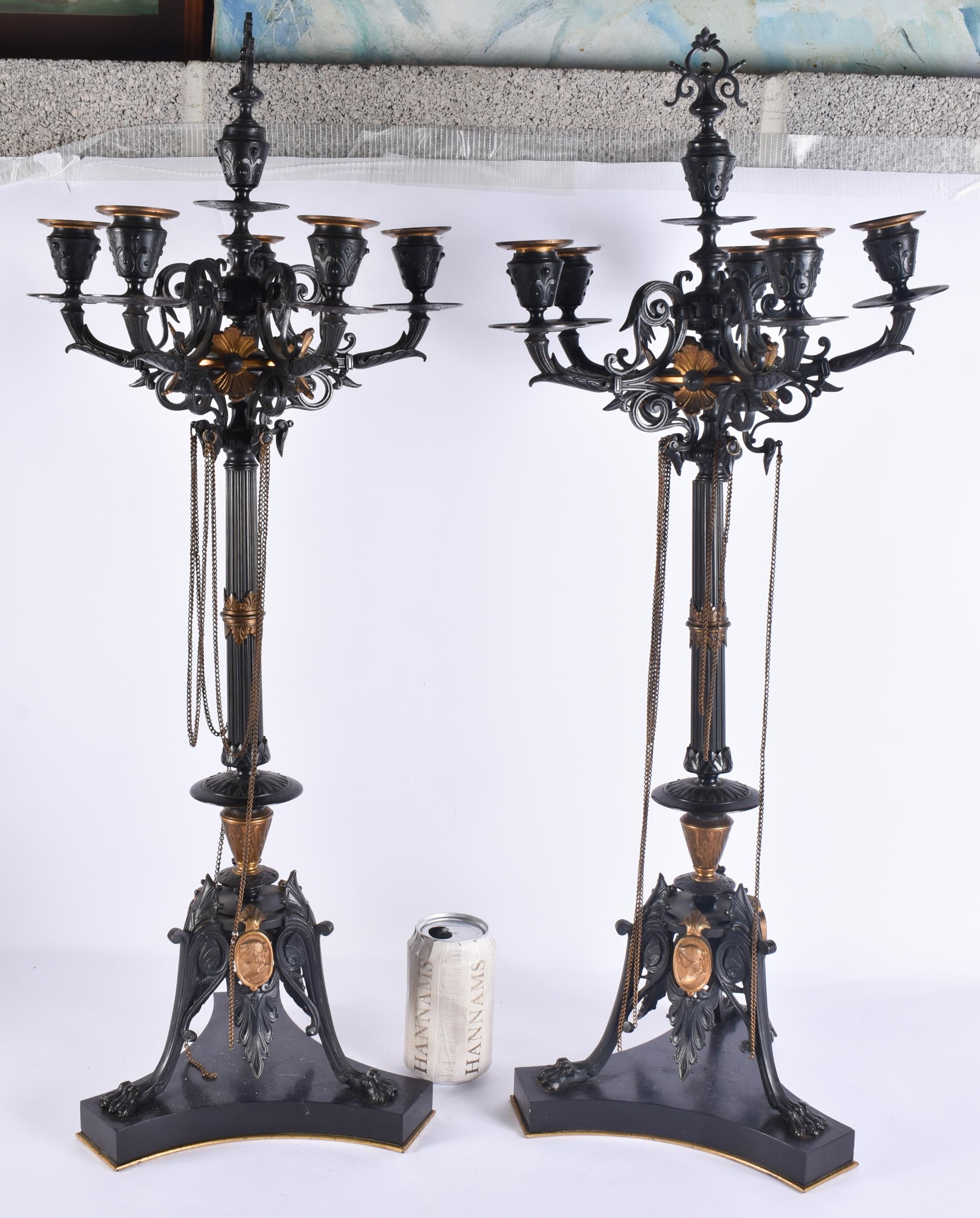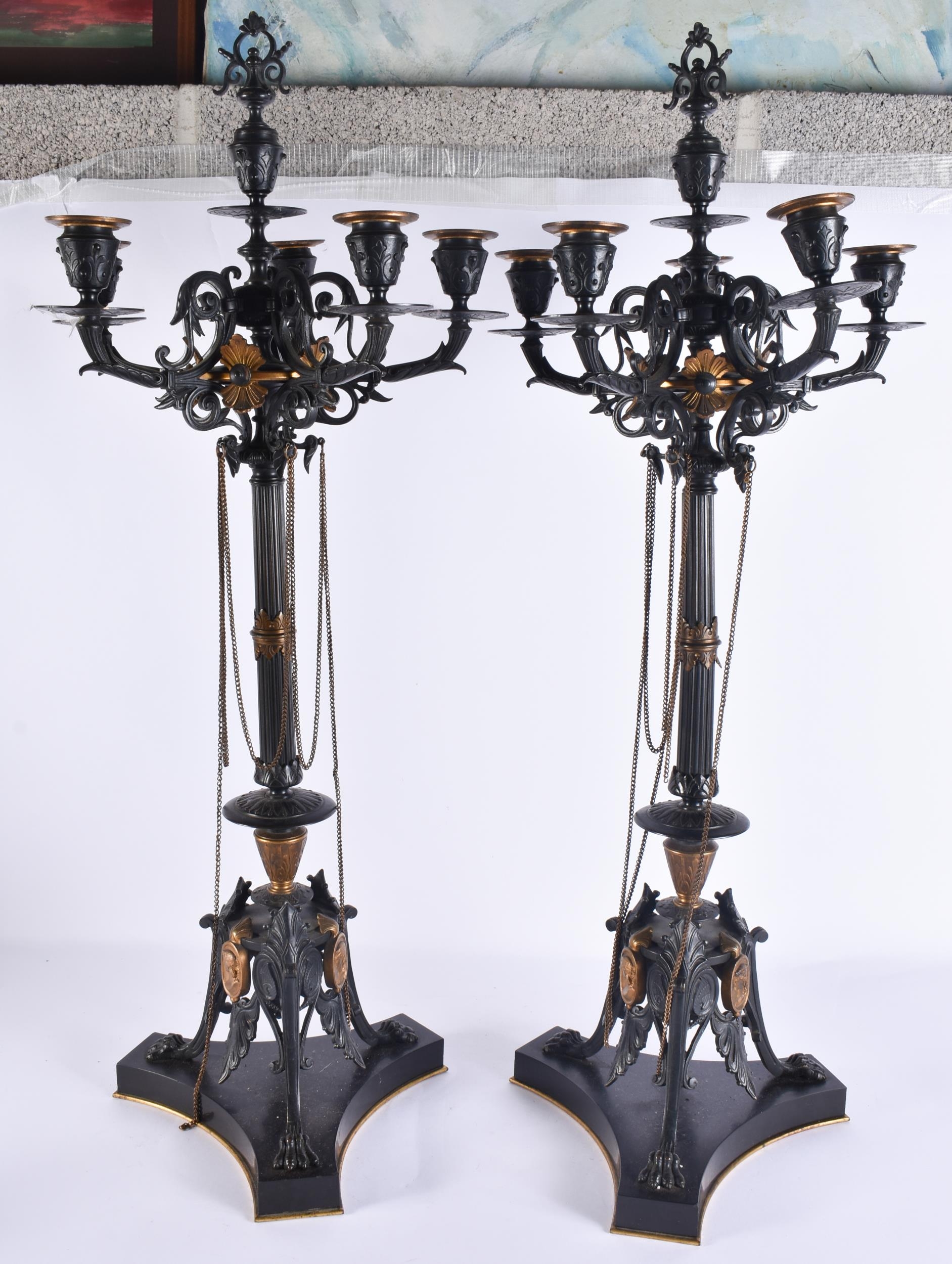 A LARGE PAIR OF 19TH CENTURY FRENCH BRONZE AND GILT BRONZE CANDLESTICKS formed with classical mask heads. 77 cm x 25 cm.