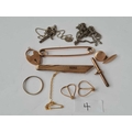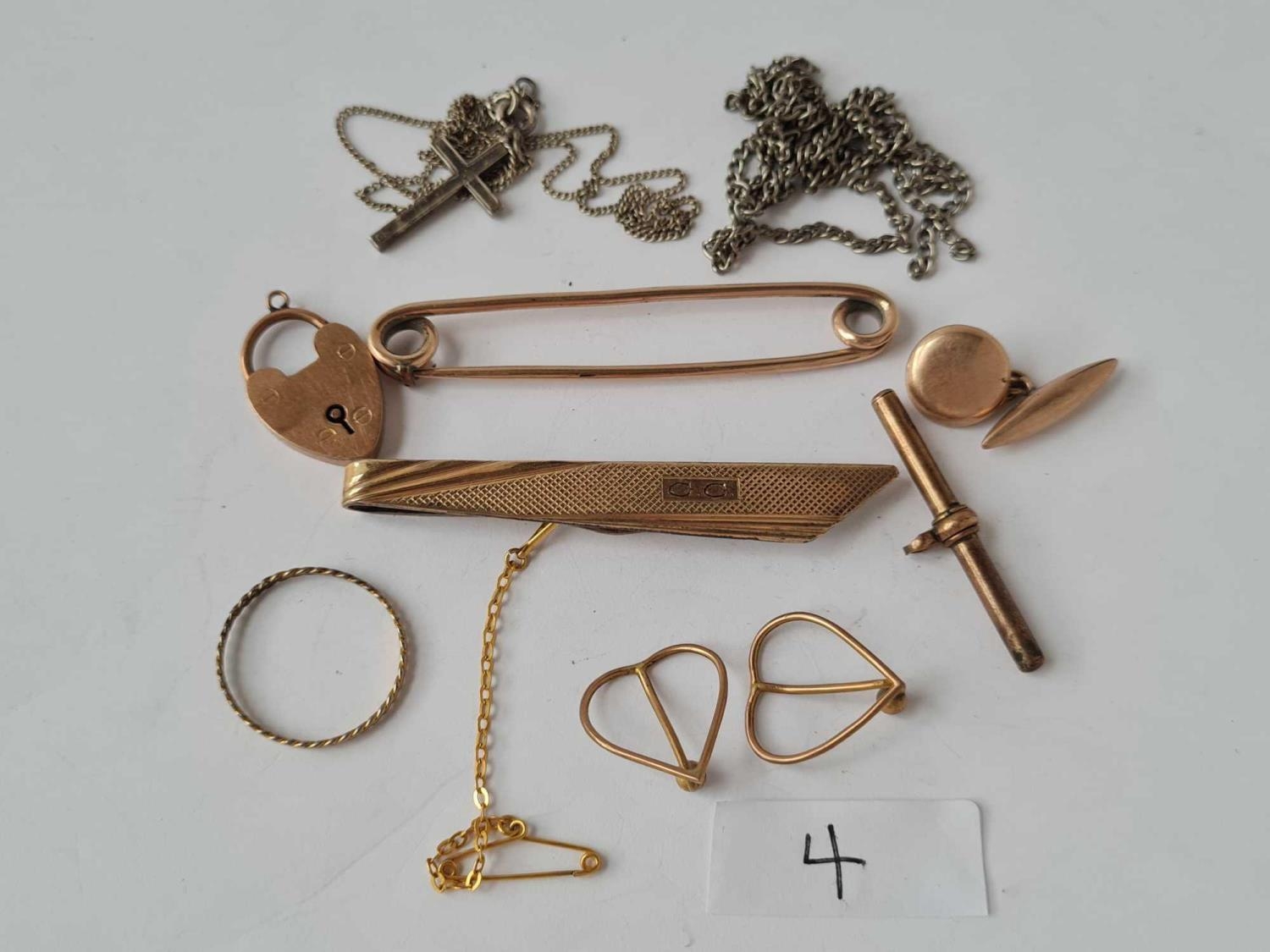 A 9ct heart padlock a single torpedo cufflink 9ct and T bar and other plated and other metal items jewellery gold weight - 7.3 gms