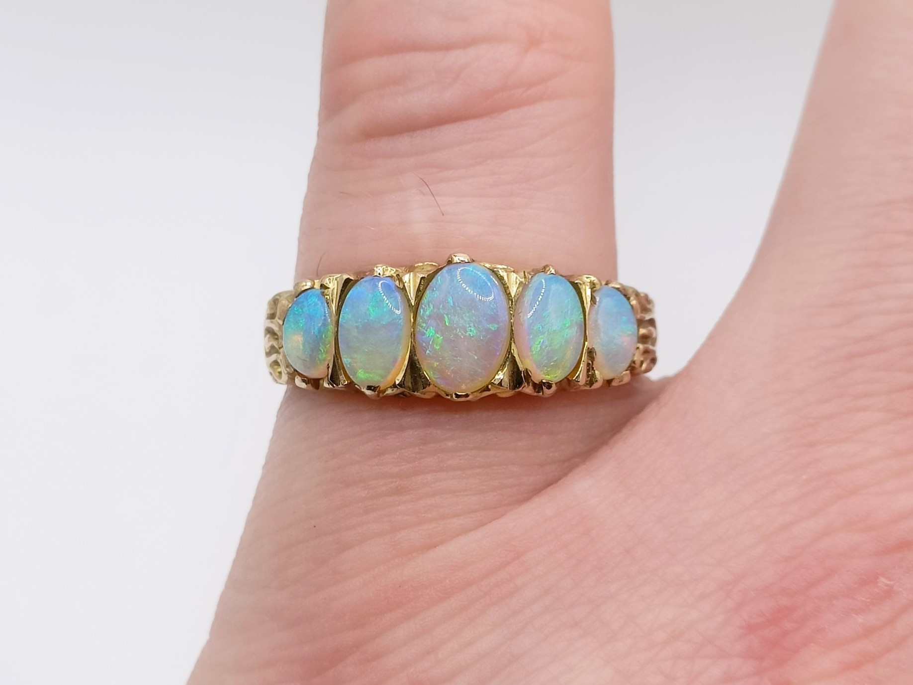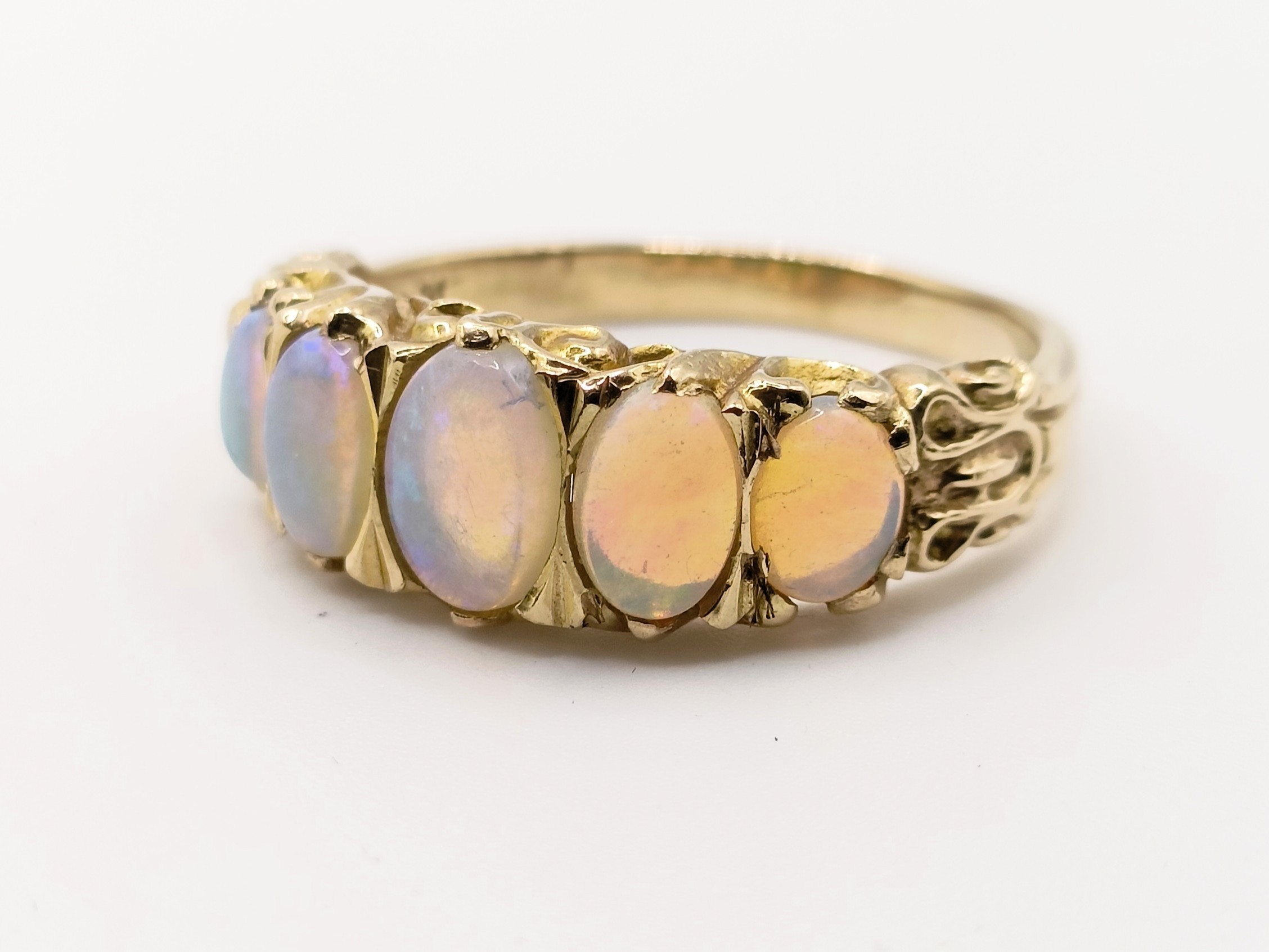 A 9ct gold and five stone opal ring, ring size R