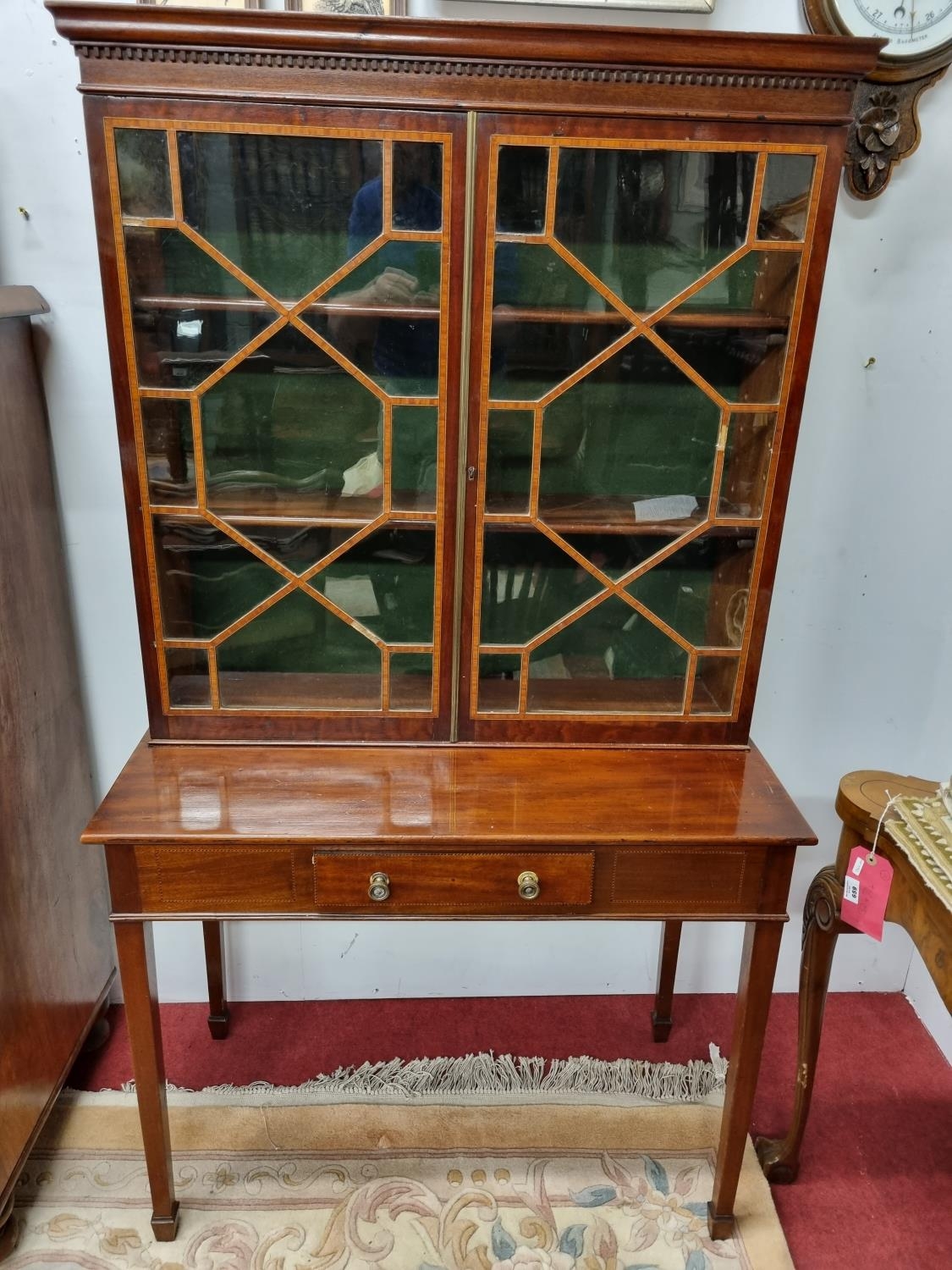 A good 19th Century Cabinet on stand with inlaid panel doors and single drawer frieze on square tapered supports. With dental cornice top. W 90 x D 47 x H 162 cm approx.