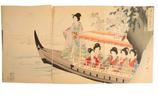 YOSHU CHIKANOBU (1838-1912) Boat Trip, from the series of The Inner Palace of Chiyoda 1896, woodblock prints on paper, across three separate pages, 35.5cm x 24cm (3).