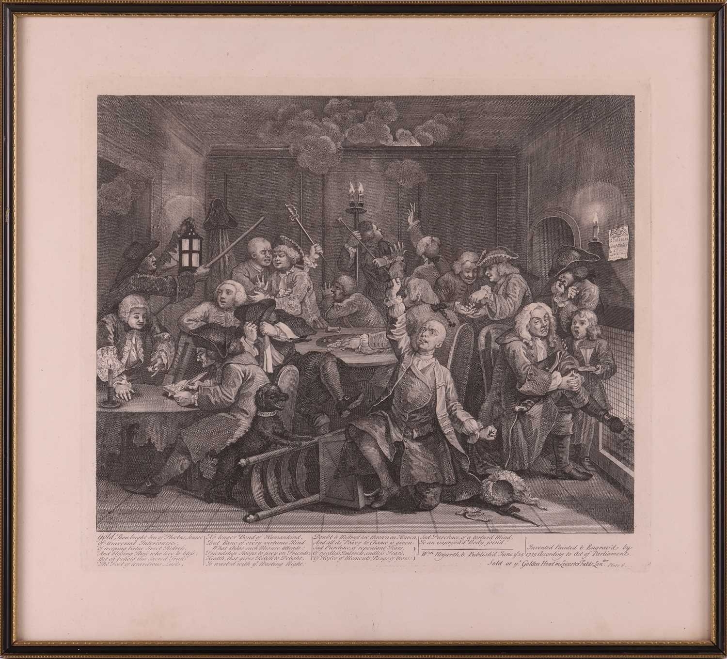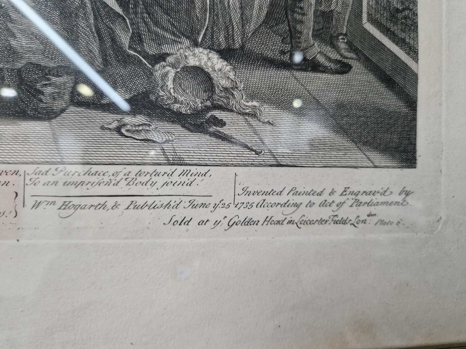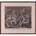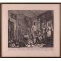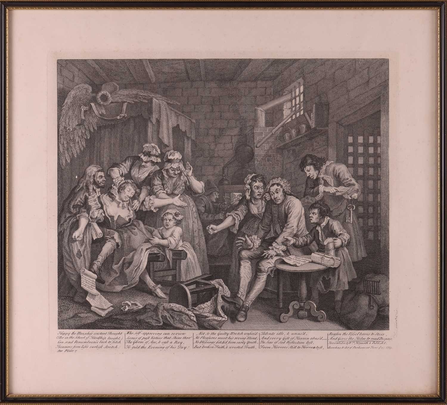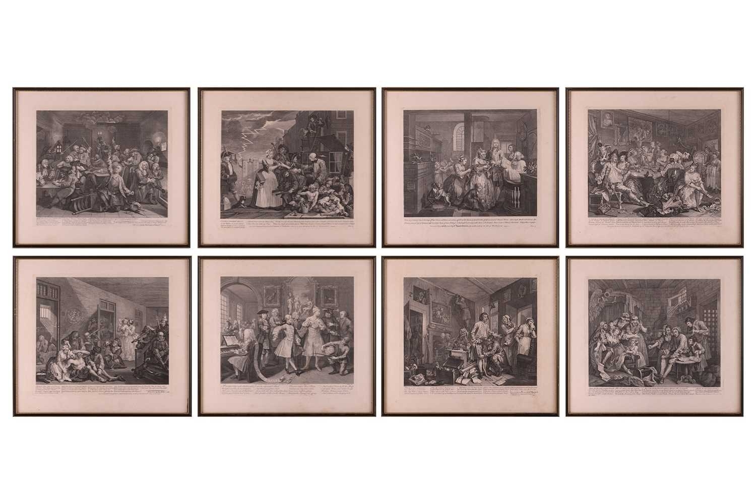 After William Hogarth (1697 - 1764), The Rake's Progress, a set of eight engravings, plate 8 retouched by the author 1763 (third state of three), plate 35.5 x 41 cm, sheet 45 x 50 cm, framed and glazed 47 x 52 cm Qty: (8) All plates have a publication date of June 25 1735, Plate 6 - 'Sold at Ye Golden Head in Leicester Fields London'. Double impression of text on plates 1 and 5. Foxing and discolouring of paper throughout commensurate with age. Some slight creases visible but no signs of tears. The prints have not been inspected out of the frames.