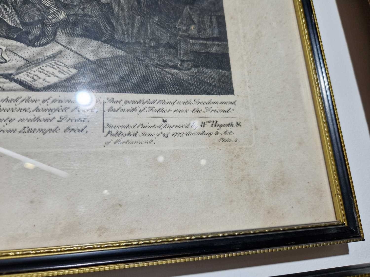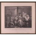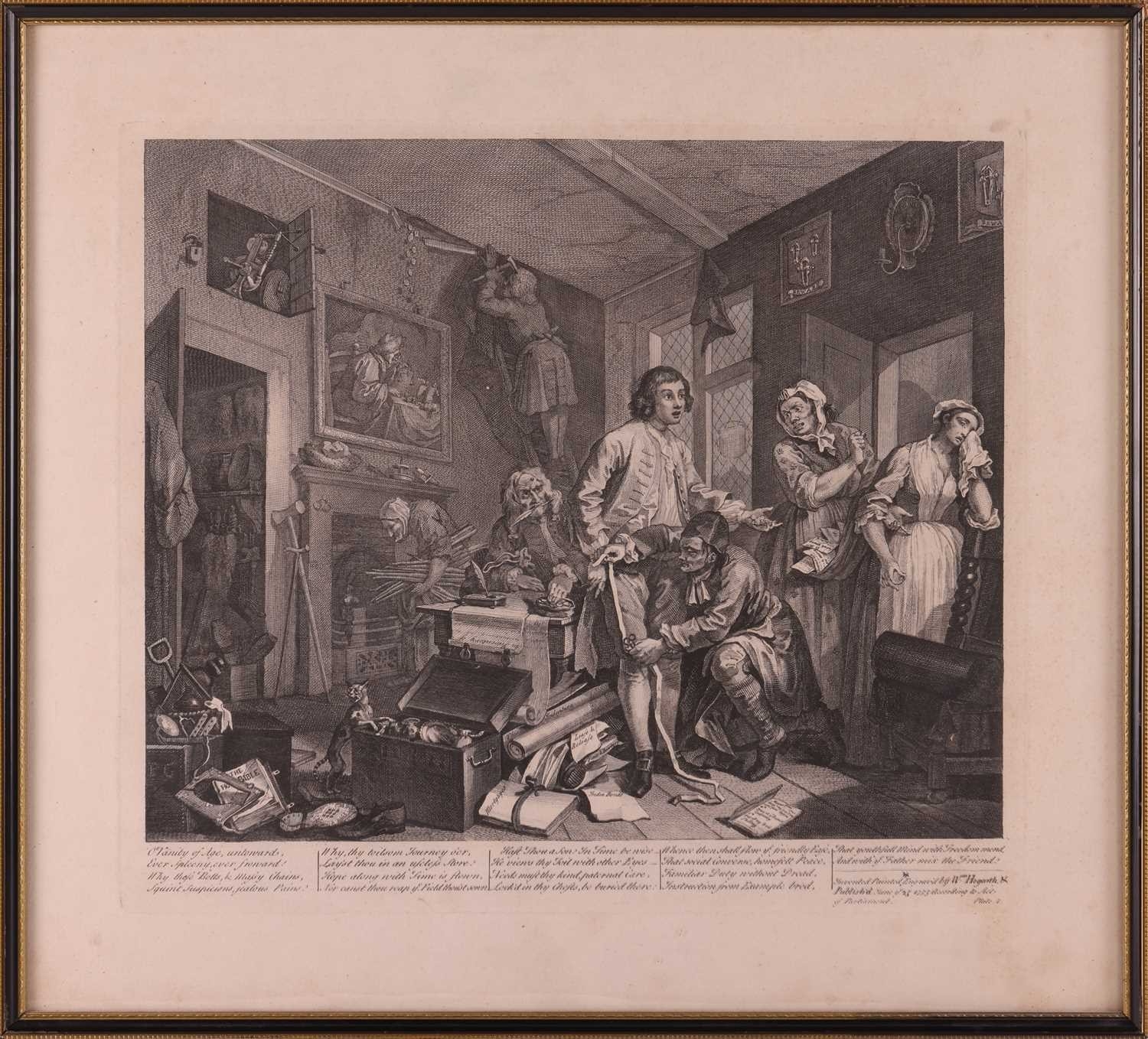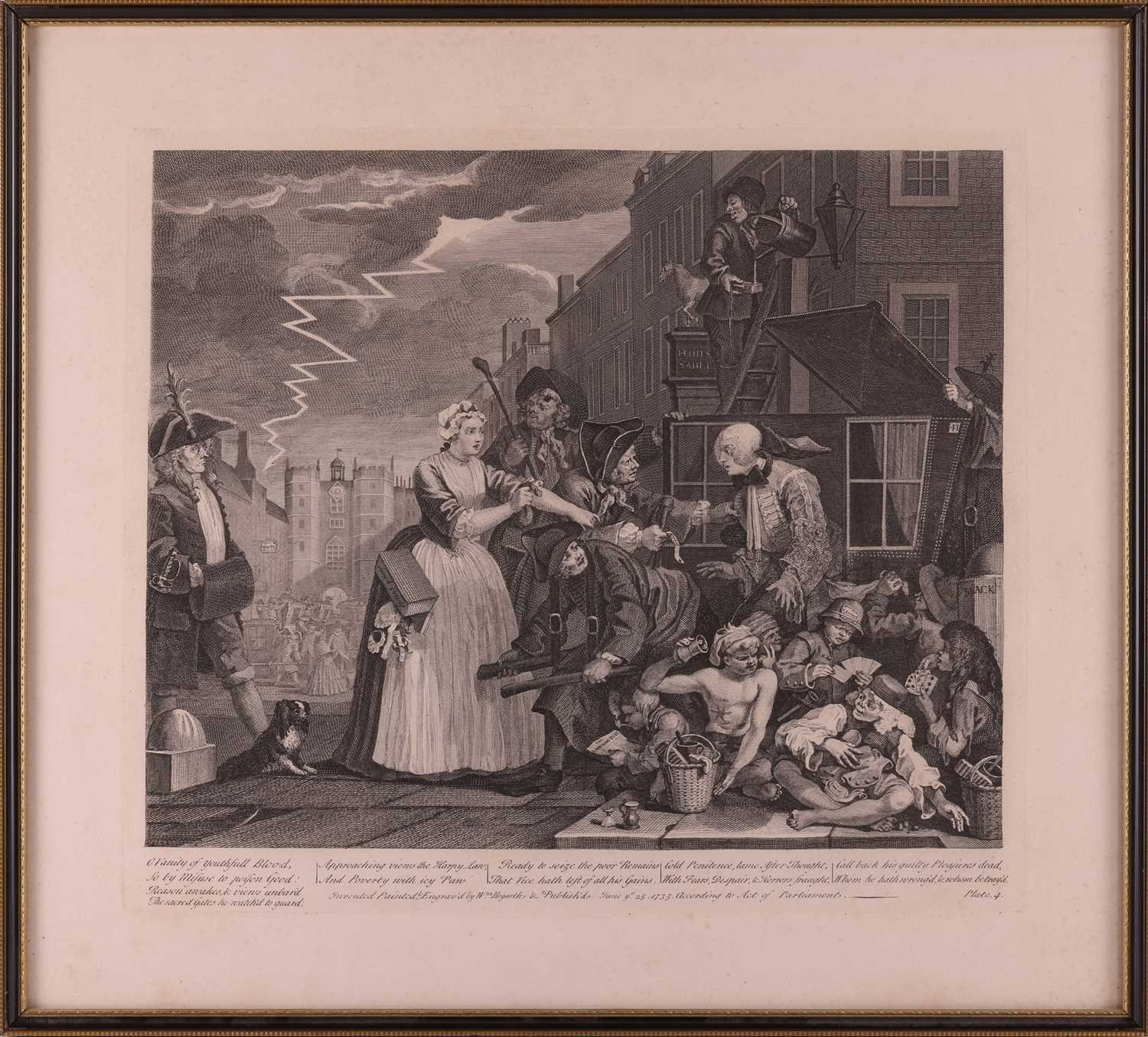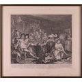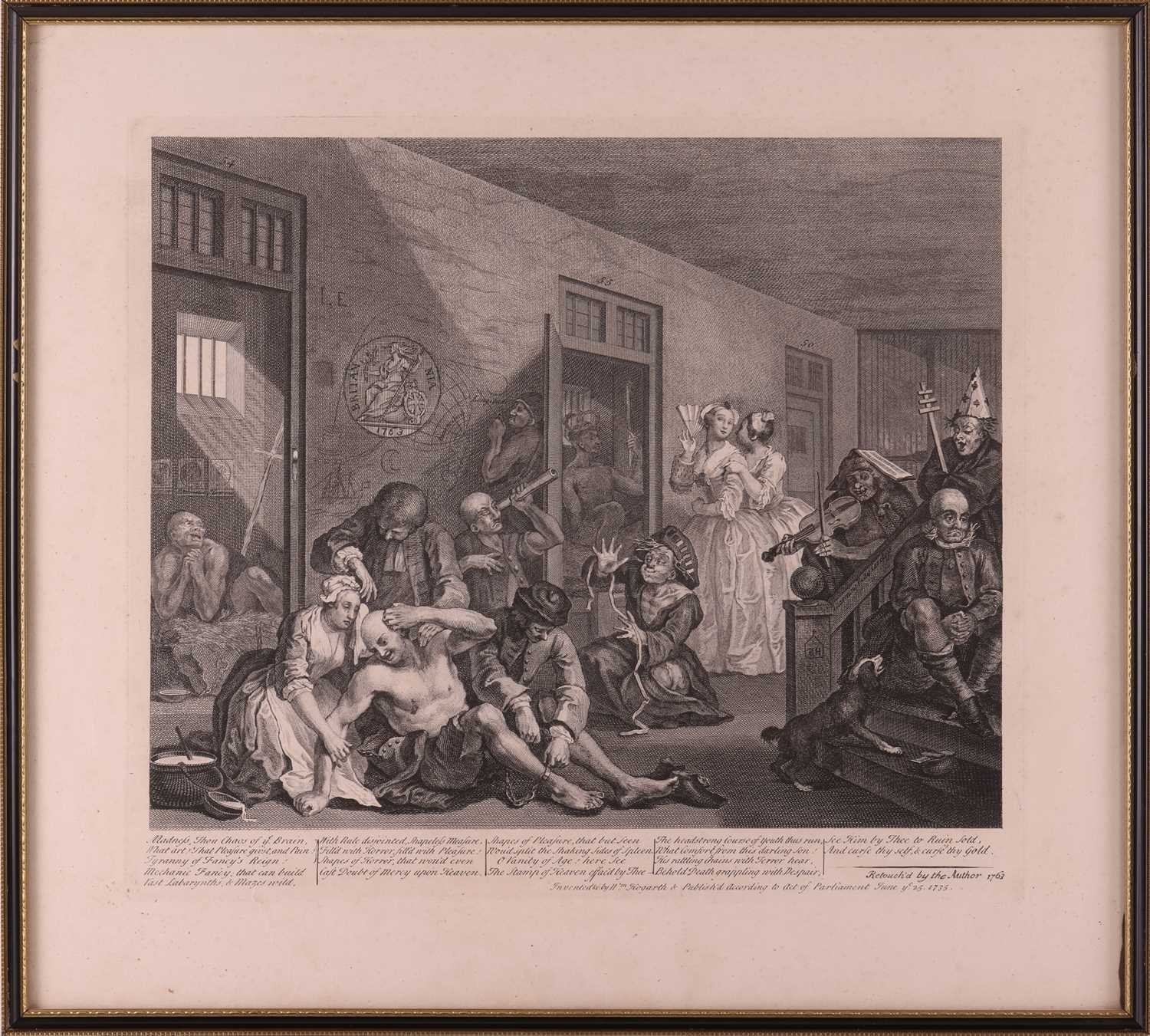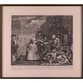 After William Hogarth (1697 - 1764), The Rake's Progress, a set of eight engravings, plate 8 retouched by the author 1763 (third state of three), plate 35.5 x 41 cm, sheet 45 x 50 cm, framed and glazed 47 x 52 cm Qty: (8) All plates have a publication date of June 25 1735, Plate 6 - 'Sold at Ye Golden Head in Leicester Fields London'. Double impression of text on plates 1 and 5. Foxing and discolouring of paper throughout commensurate with age. Some slight creases visible but no signs of tears. The prints have not been inspected out of the frames.