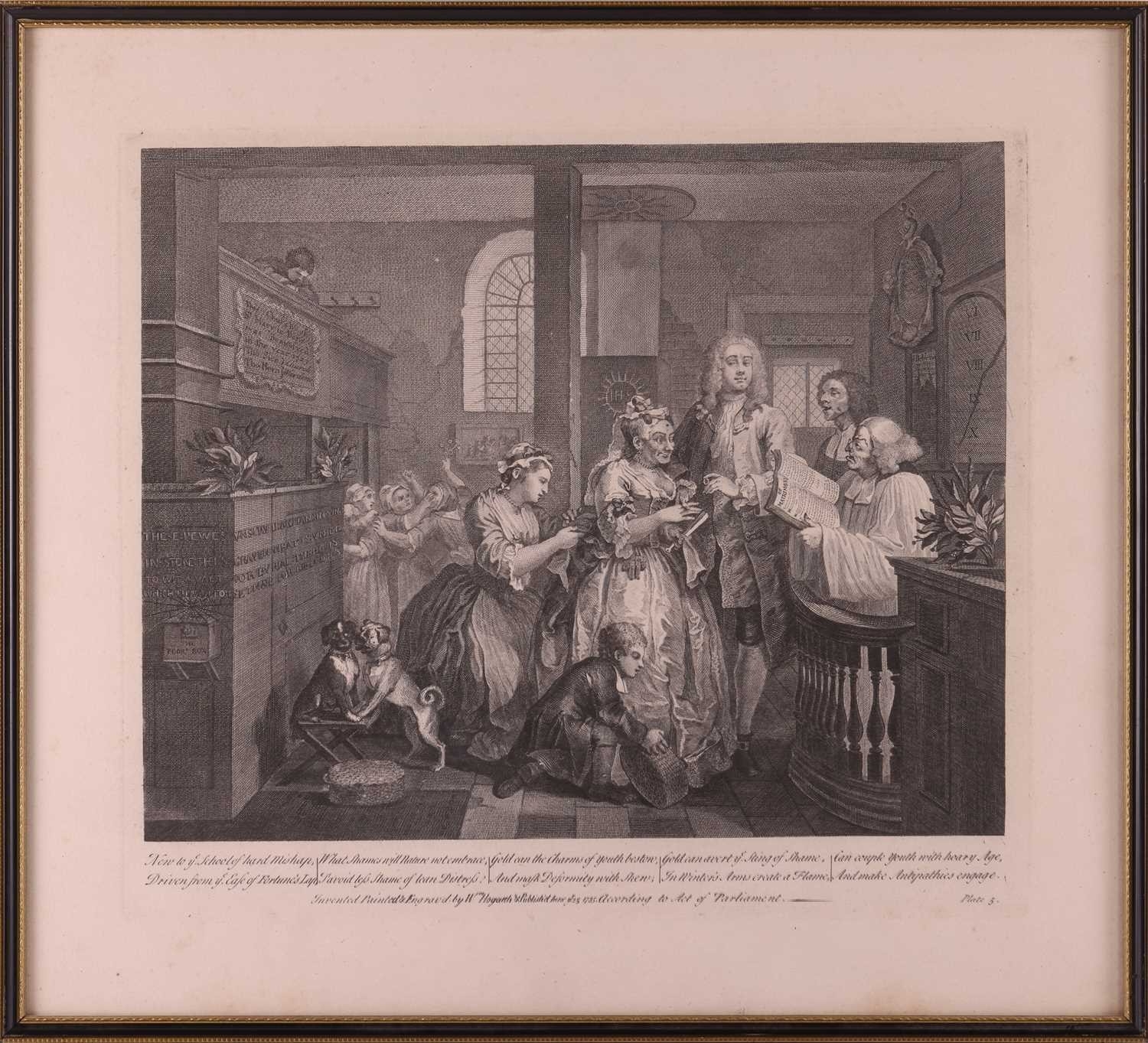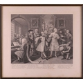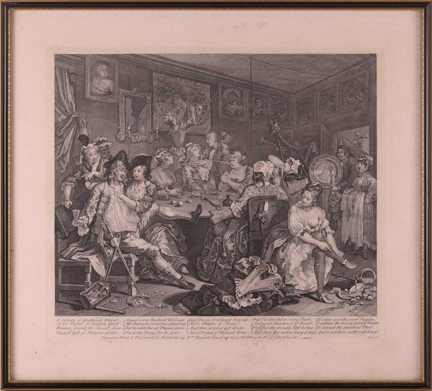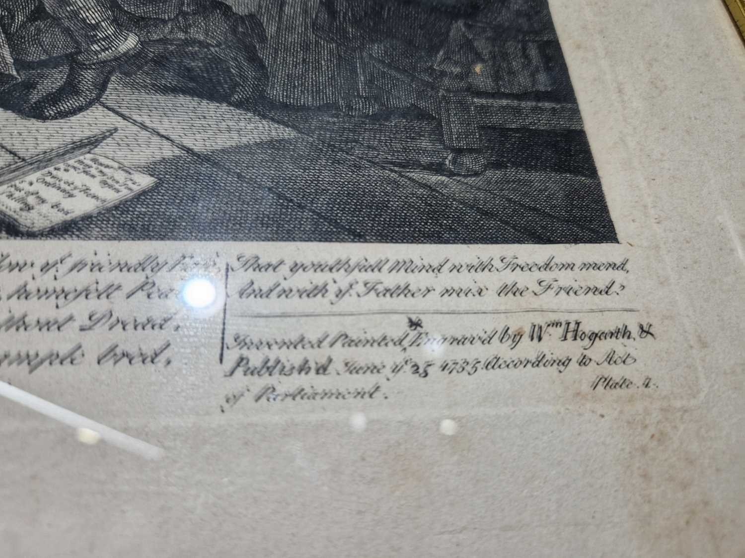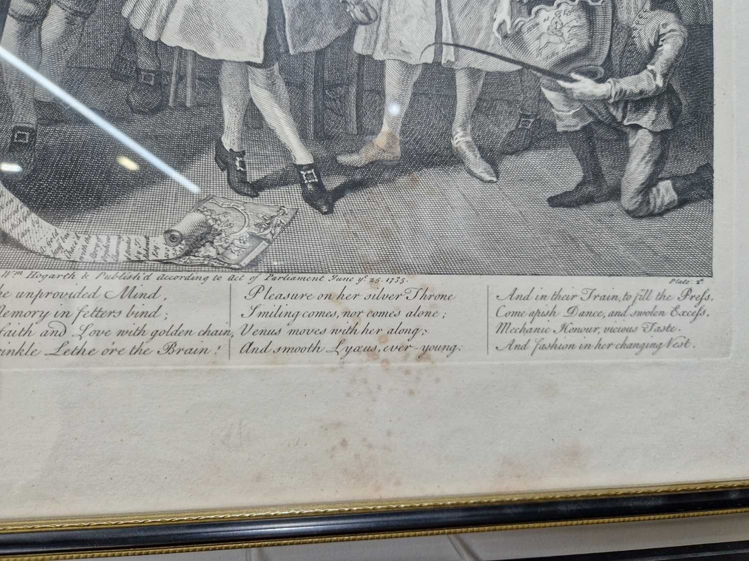 After William Hogarth (1697 - 1764), The Rake's Progress, a set of eight engravings, plate 8 retouched by the author 1763 (third state of three), plate 35.5 x 41 cm, sheet 45 x 50 cm, framed and glazed 47 x 52 cm Qty: (8) All plates have a publication date of June 25 1735, Plate 6 - 'Sold at Ye Golden Head in Leicester Fields London'. Double impression of text on plates 1 and 5. Foxing and discolouring of paper throughout commensurate with age. Some slight creases visible but no signs of tears. The prints have not been inspected out of the frames.