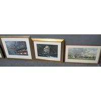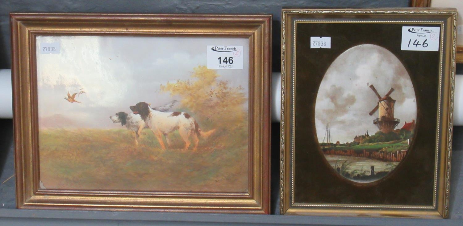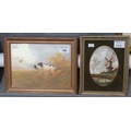 R Hinton (British 20th century), pair of spaniels flushing pheasants. Signed oils on a Crown Devon Fieldings ceramic panel. 18 x 24cm approx. Together with a printed panel on ceramic 'The Mill' by Van Ruysdale. (2)