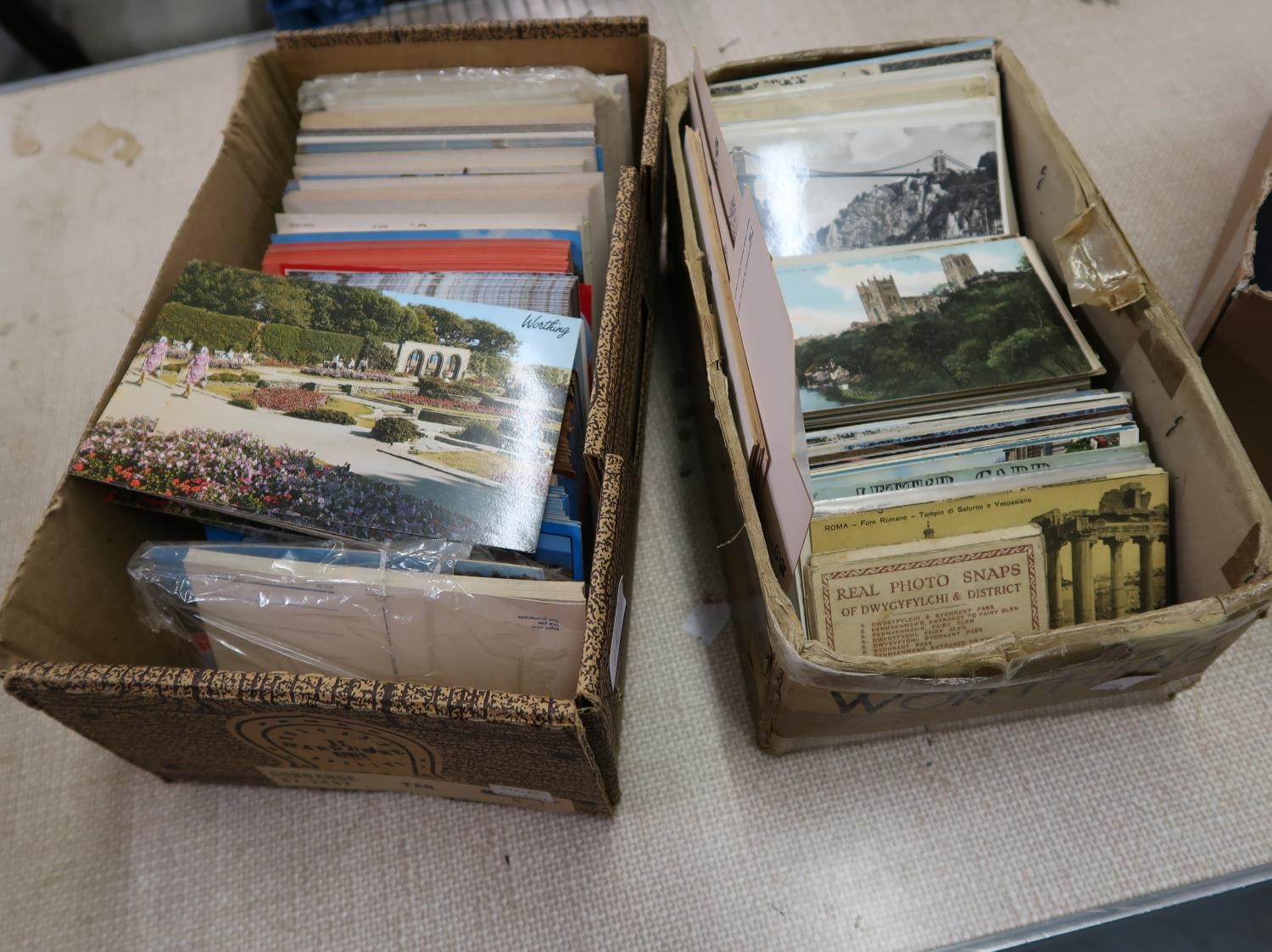 Two boxes containing a large quantity of mid 20th Century postcards