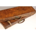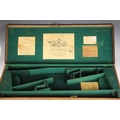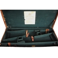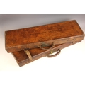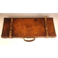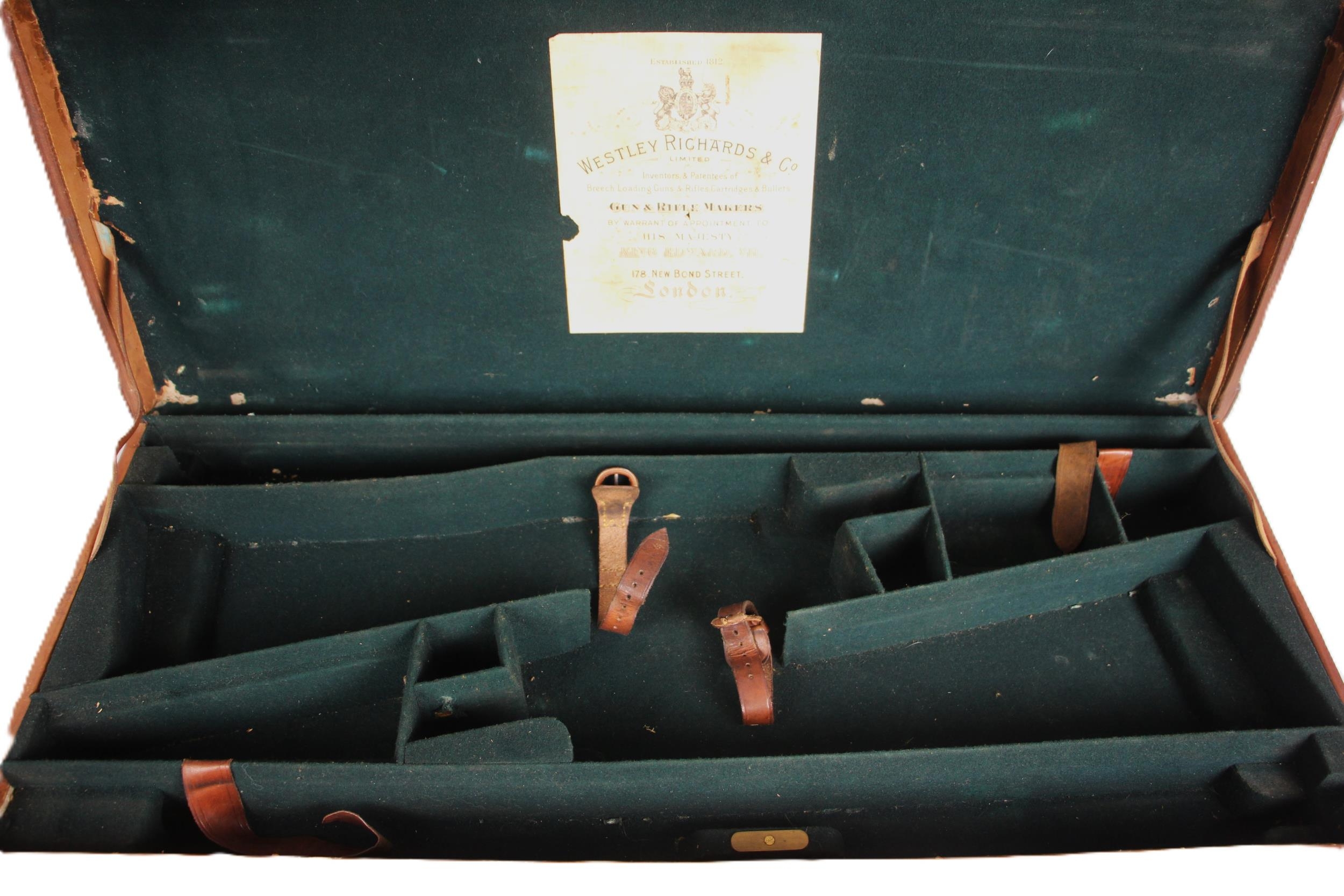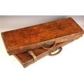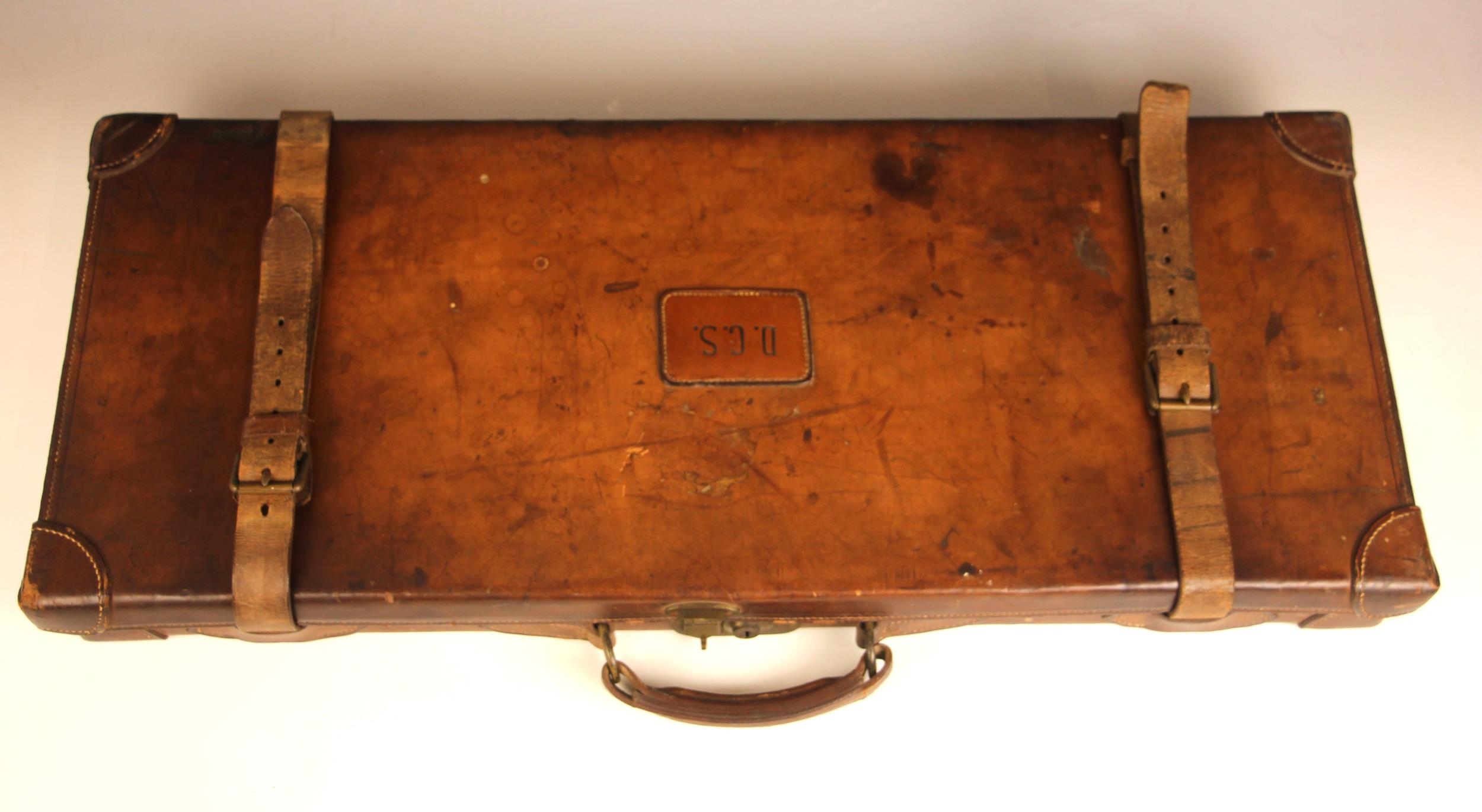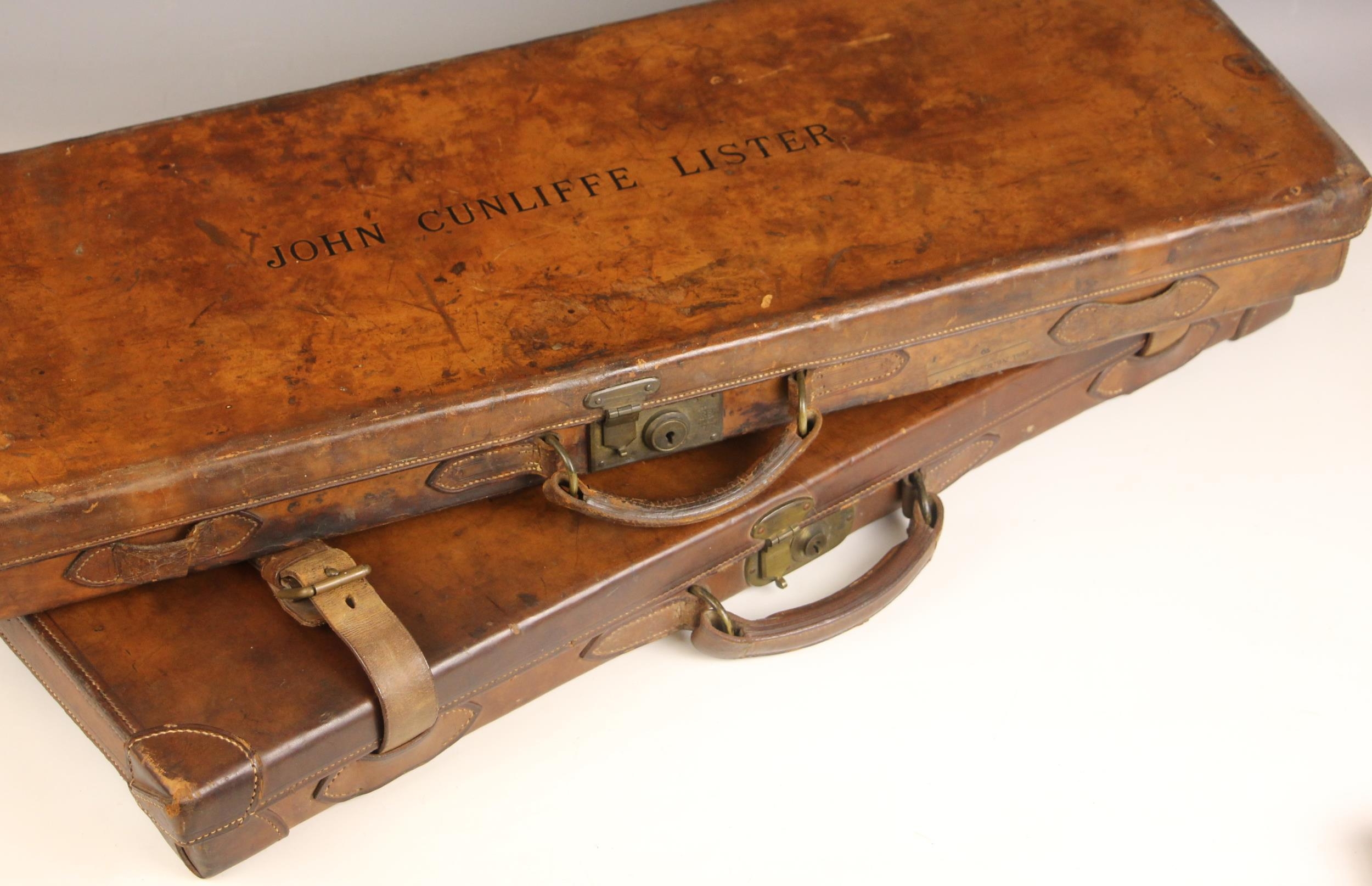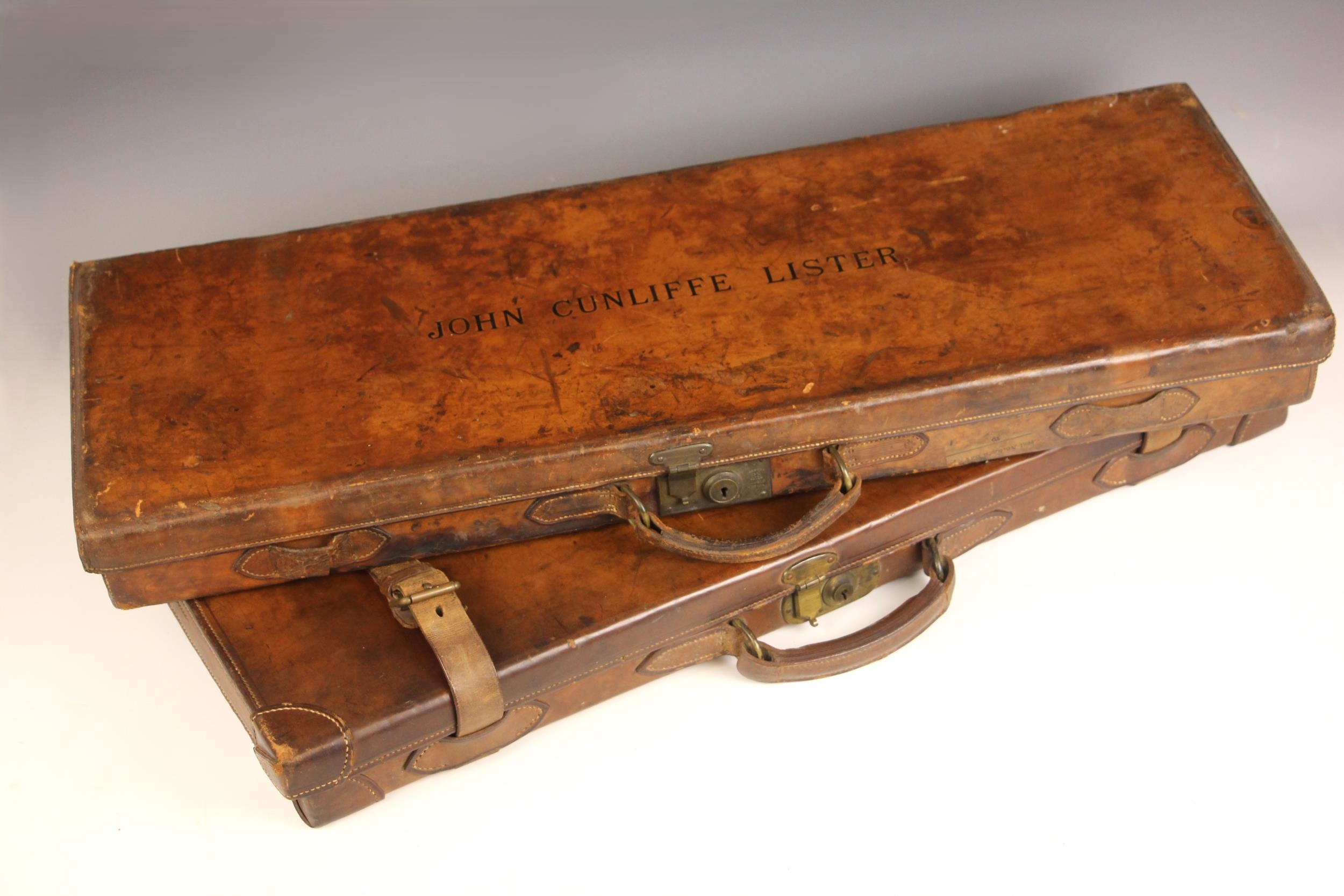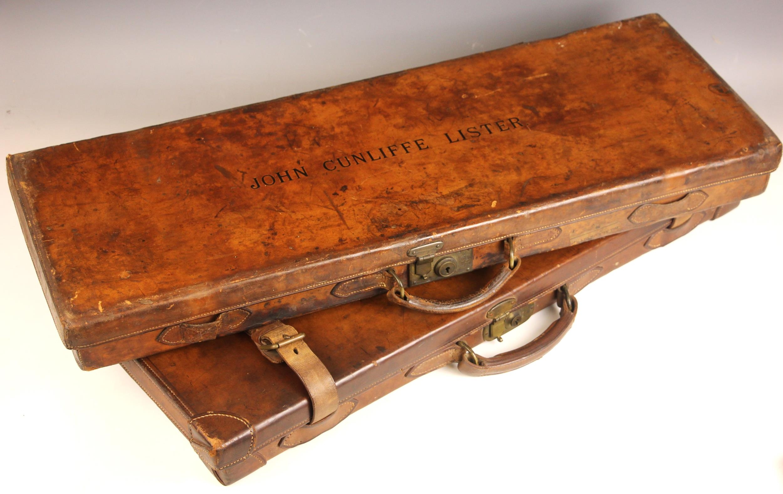 A shotgun case by Charles Lancaster of London, 19th century, the wooden framed leather bound case with green baize-lined fitted interior, paper maker's and instruction labels to the hinged cover interior, the exterior embossed 'John Cunliffe Lister', lacking straps, 83cm W x 31cm D x 8cm H; with a further similar shotgun case by Westley Richards & Co, the hinged cover embossed 'D.C.S.', 79cm W x 34cm D x 8cm H (2)