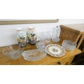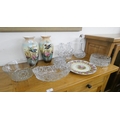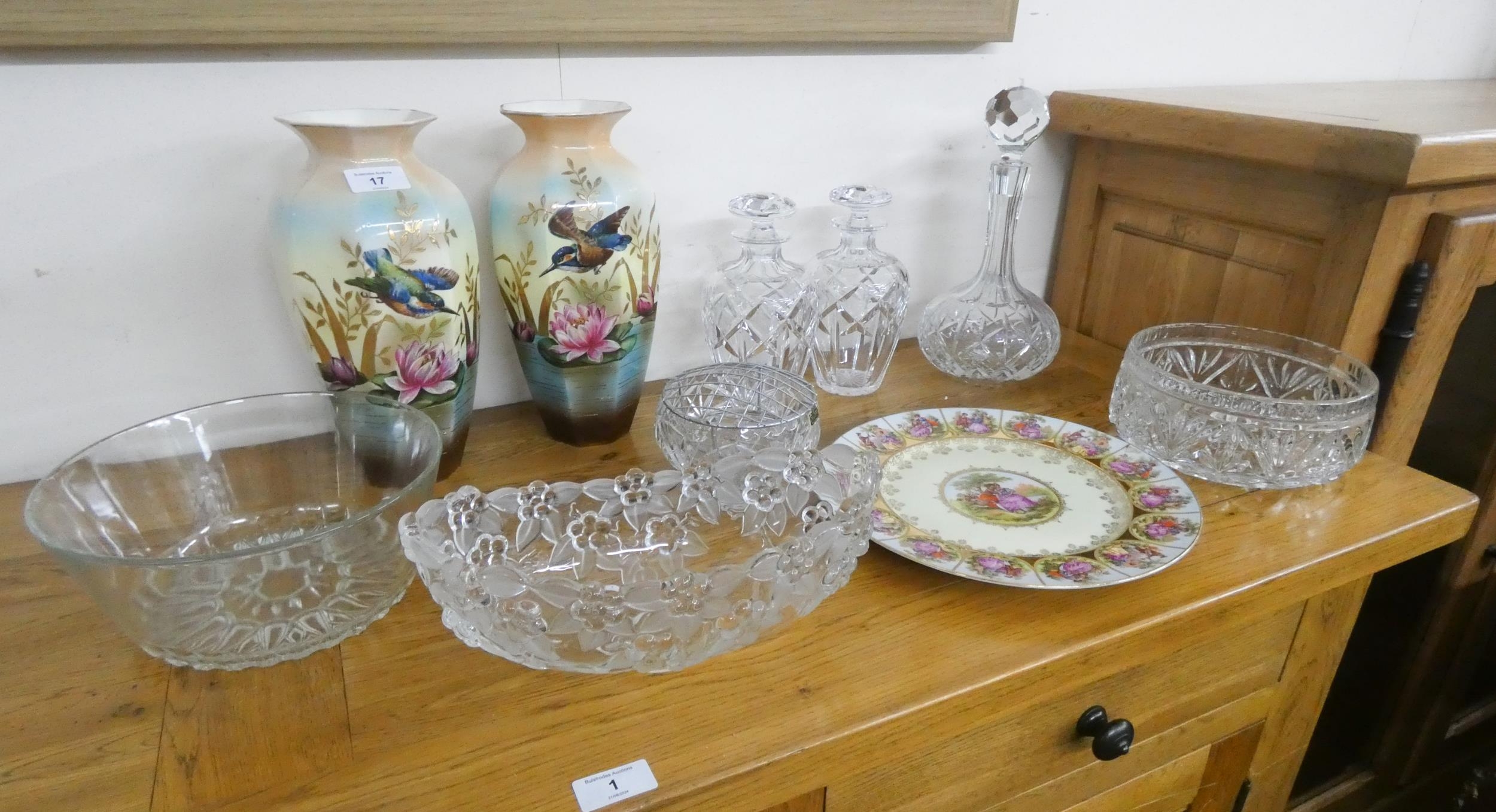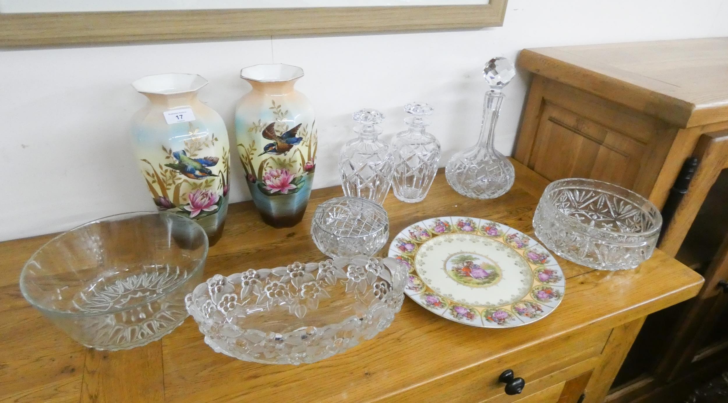 A pair of vintage Octagonal bodied vases painted with Kingfishers, China plate, good quality cut glass decanters and other glass ware