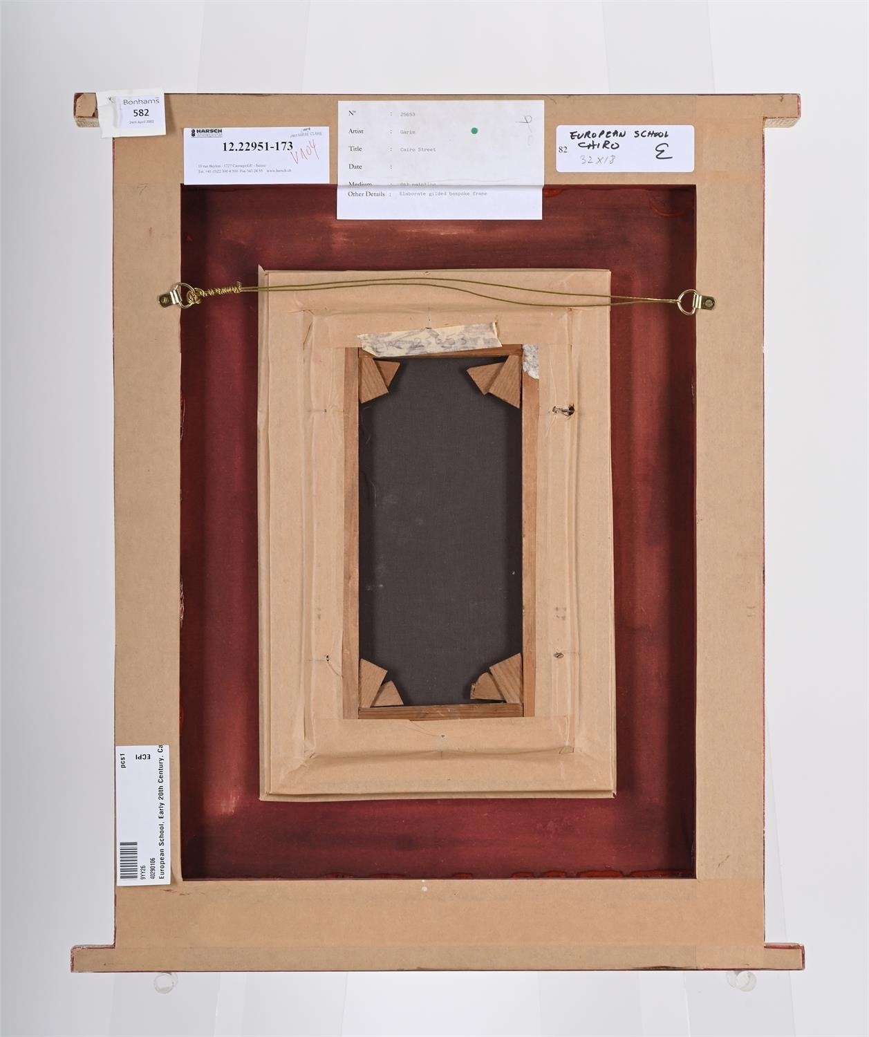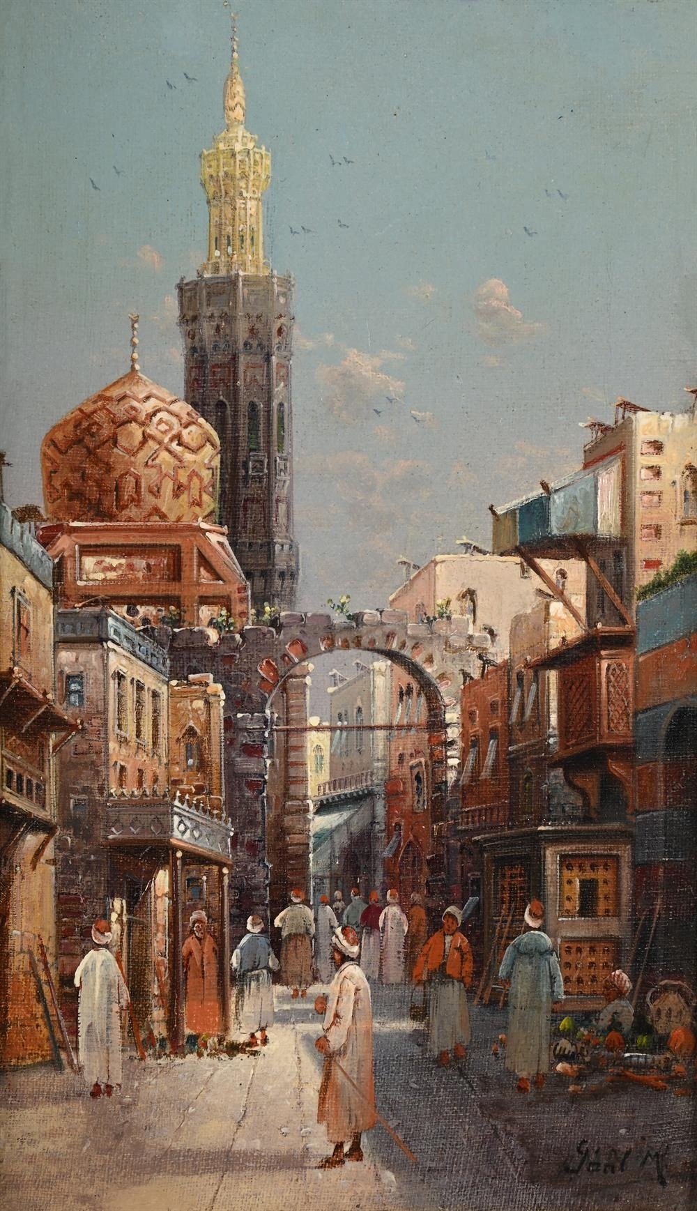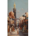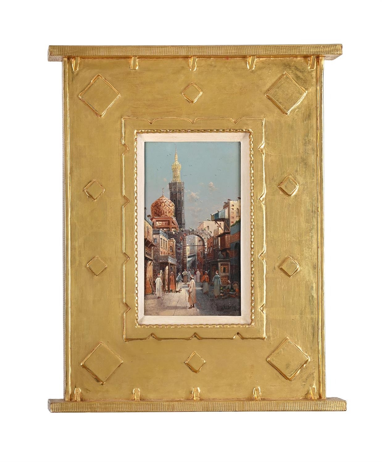 CONTINENTAL SCHOOL ( 20TH CENTURY)CAIRO STREET SCENEOil on canvasIndistinctly signed (lower right)32 x 18.5cm (12½ x 7¼ in.)In elaborate gilded frame. Provenance:Bonhams, 24 April 2002, lot 582Measurements do not include the frame unless specified.Please note Dreweatts are not liable for damage to frames or mounts.