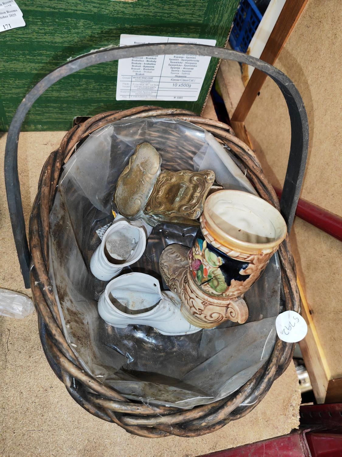Small Wicker Basket With 3 Crumb And Brushes Plus A Small Amount Of China