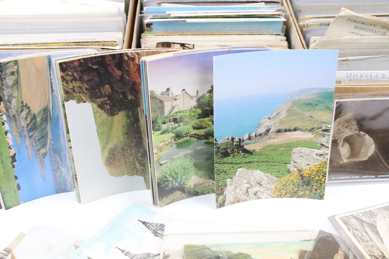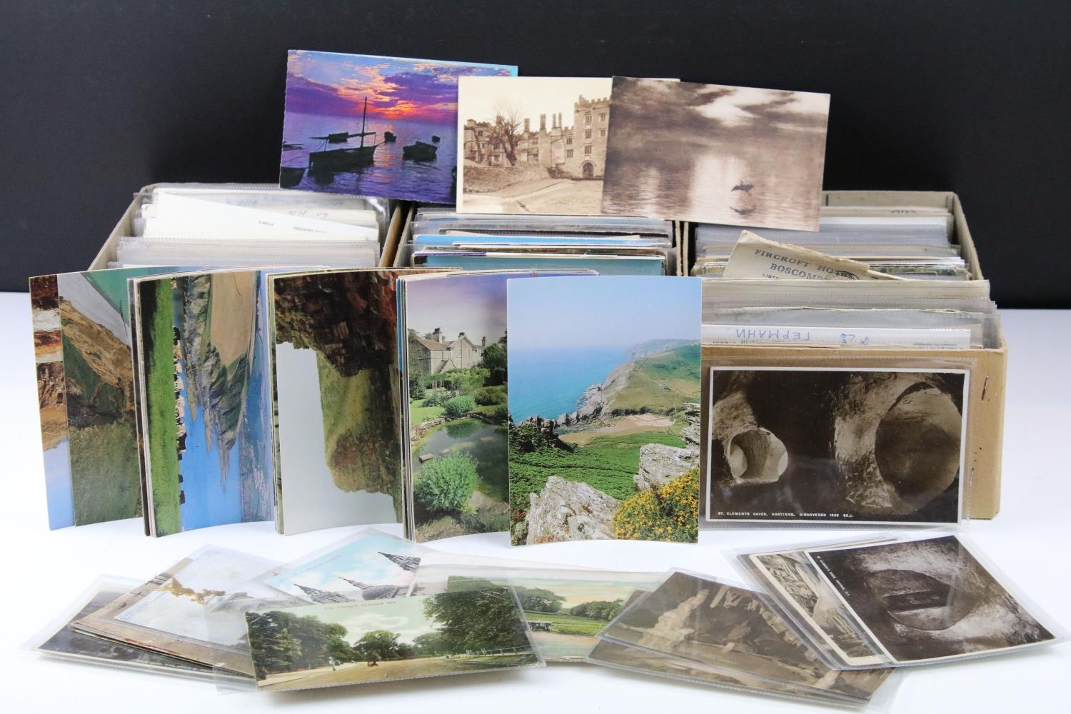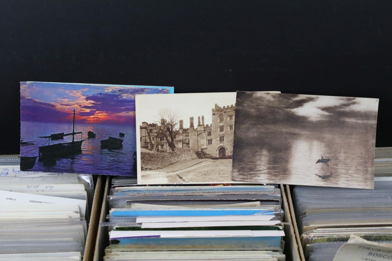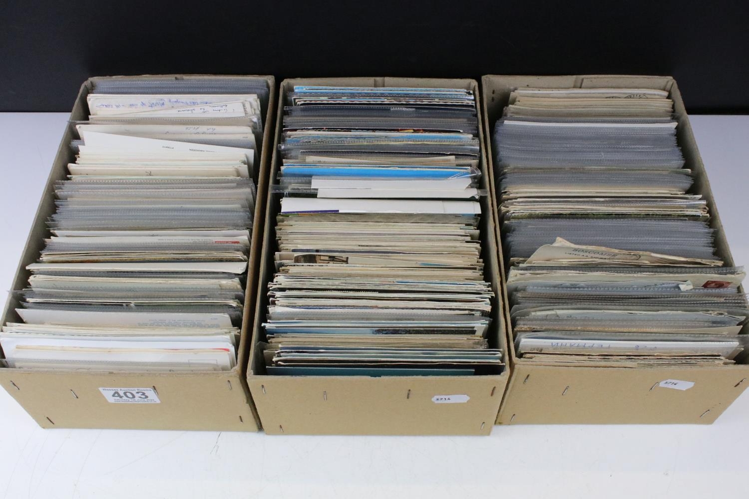 Collection of postcards & stamped envelopes housed within three boxes, early 20th century onwards, the postcard subjects to include topographical, animals, military, photographic, etc