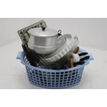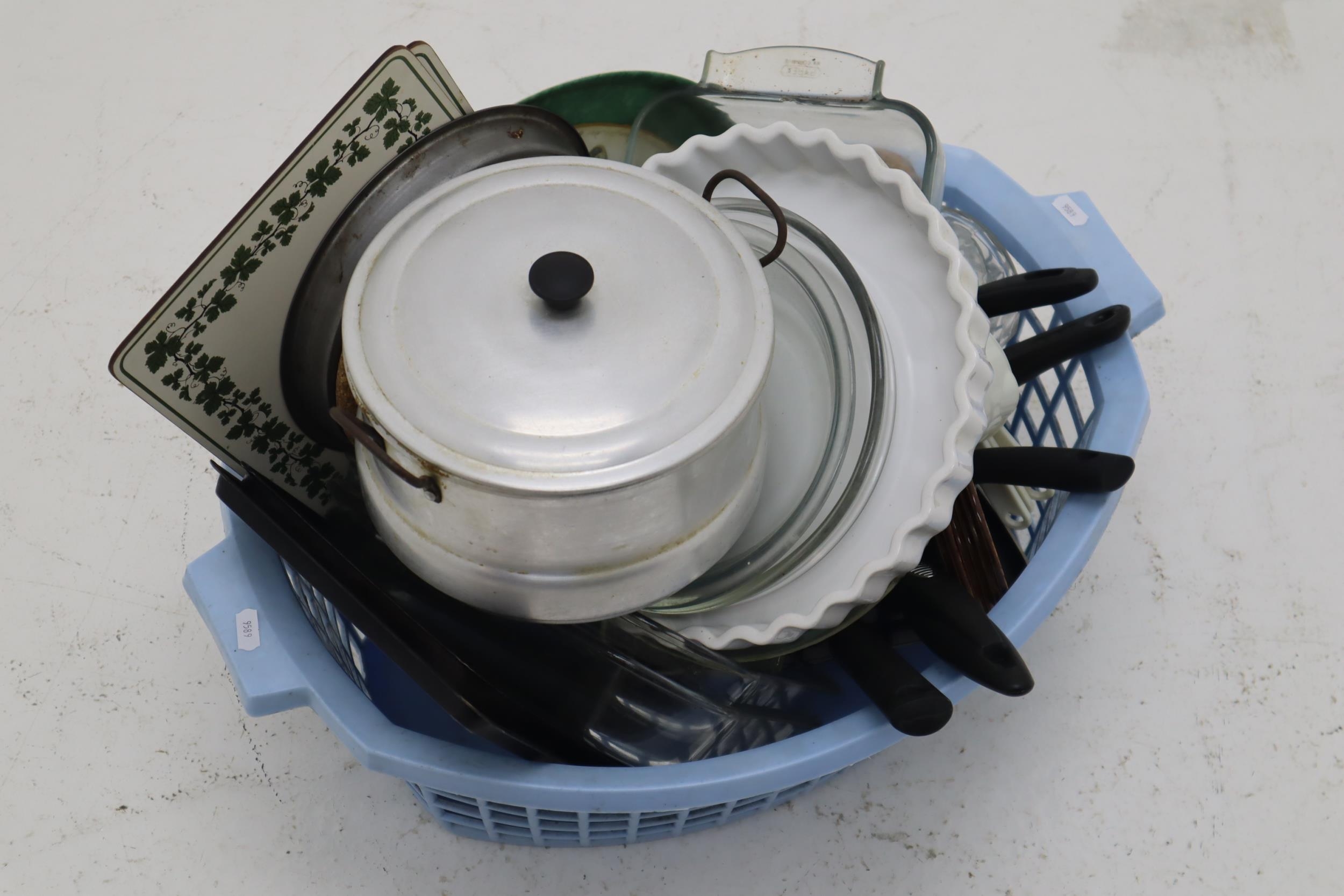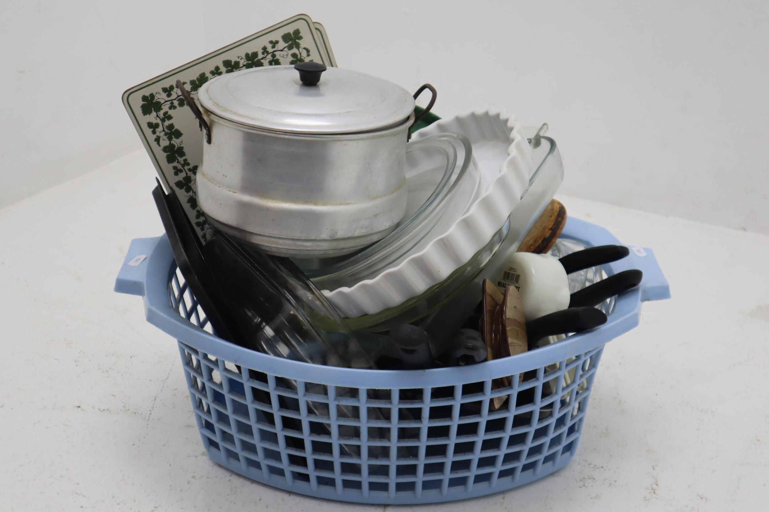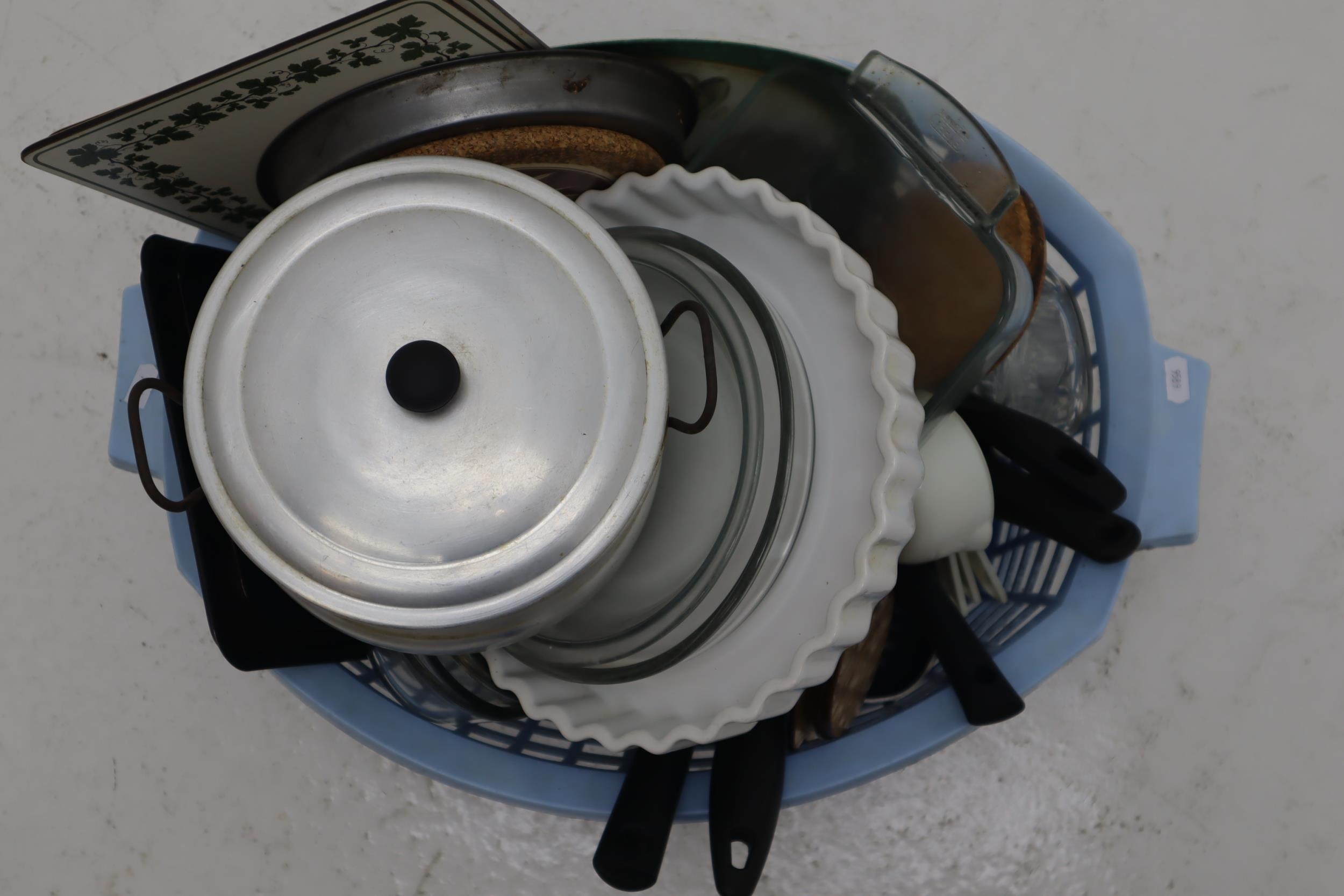 Collection of Kitchenalia to Include Griddle Pan, Saucepan, Valira and Tefal Frying Pan, JAJ and Pyrex Glass Cookware, Vintage Strainer and more With Laundry Basket