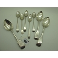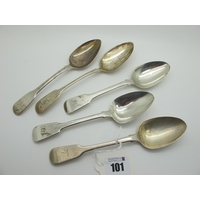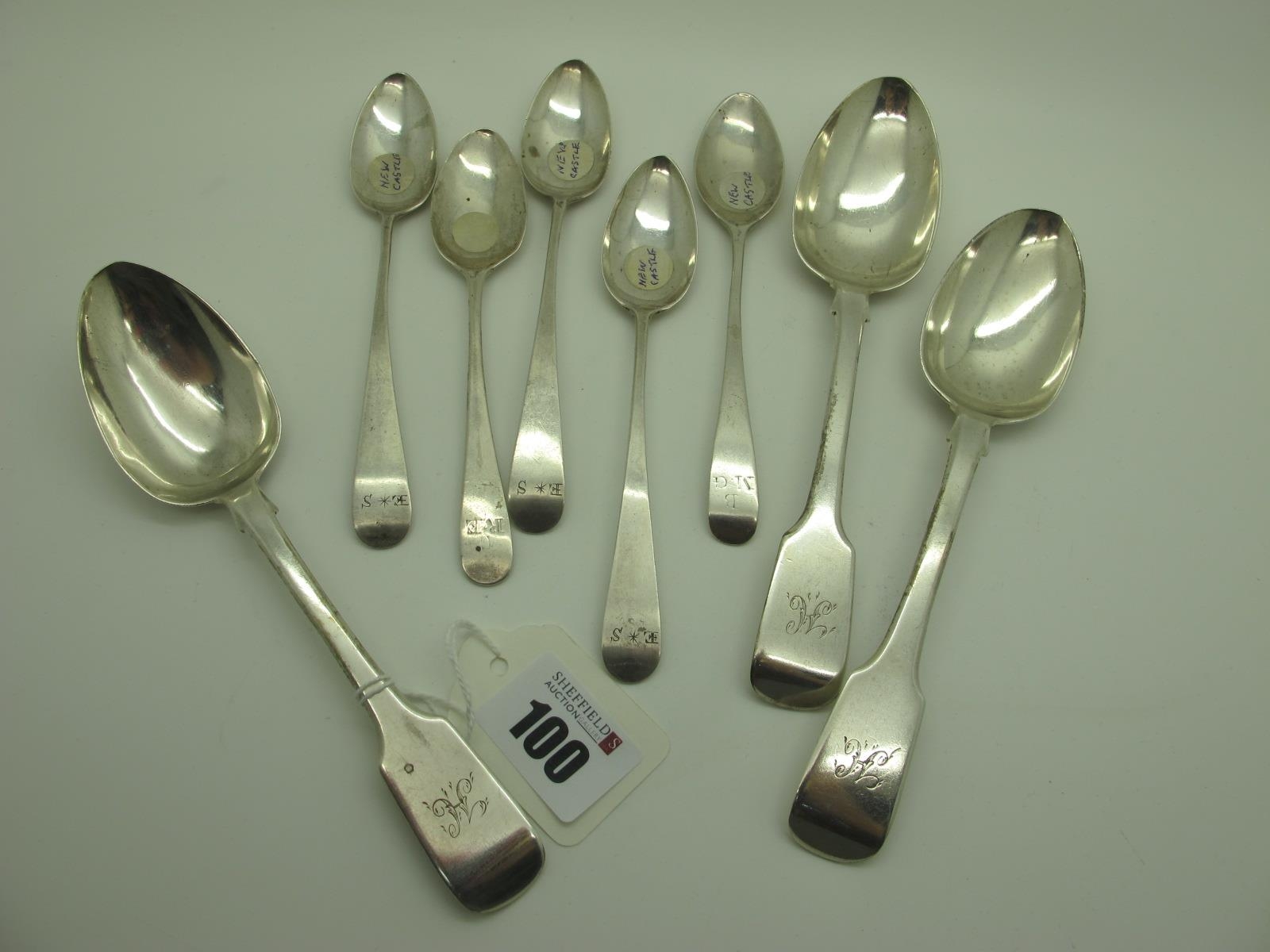 Newcastle Hallmarked Silver Teaspoons, (marks rubbed); together with a set of three Exeter hallmarked silver fiddle pattern spoons, John Stone, 1845, initialled (170grams). (8)