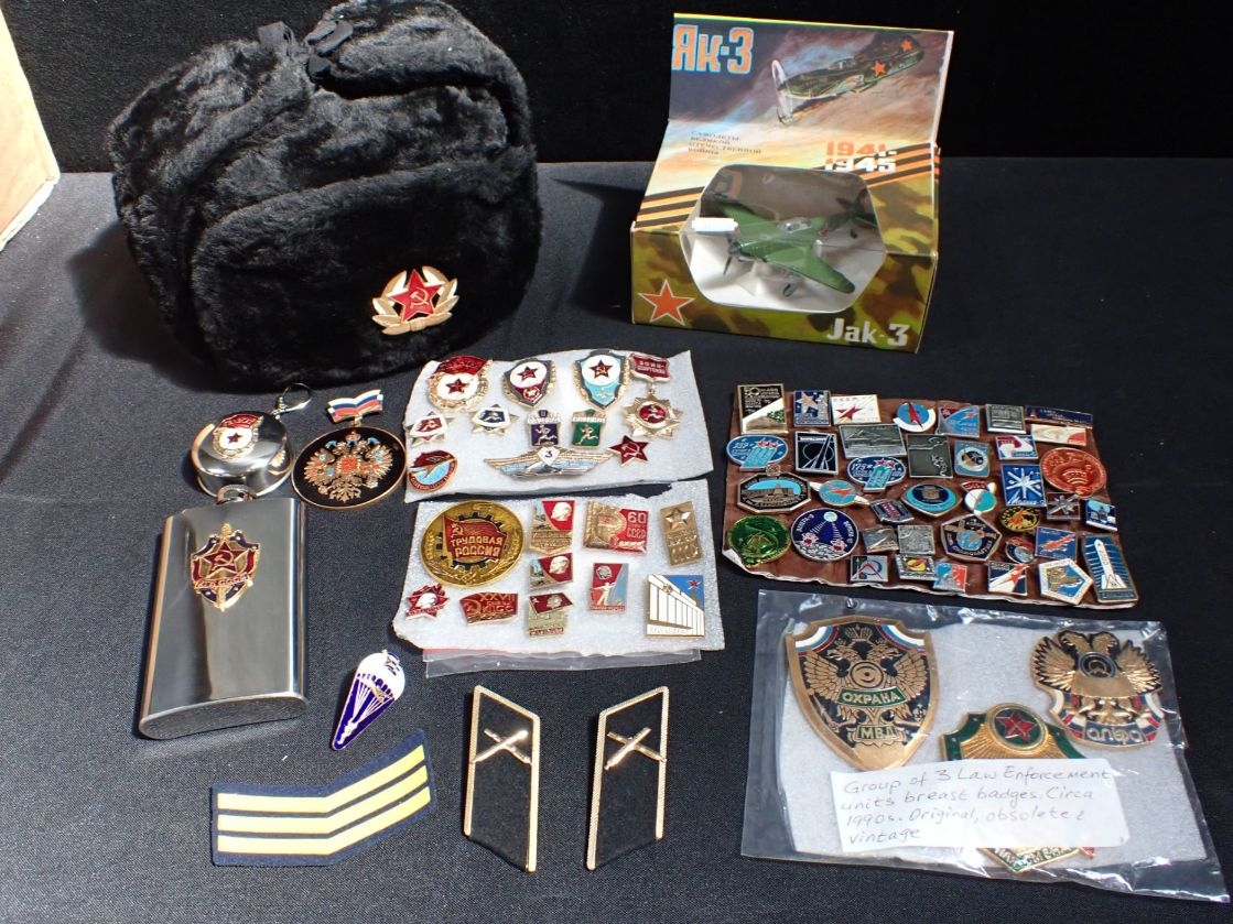 A SOVIET NAVY WINTER HAT a Cuban airborne troop jump badge; a Russian Imperial crest pin back; a Soviet Advance Guard collapse cup with key chain; a group of Law Enforcement Unit breast badges including police, KGB, Special Forces, Alpha Group, Armed Security Unit; a mixture of Soviet Military Excellence badges, various Soviet Space Programme pins and other items.