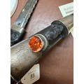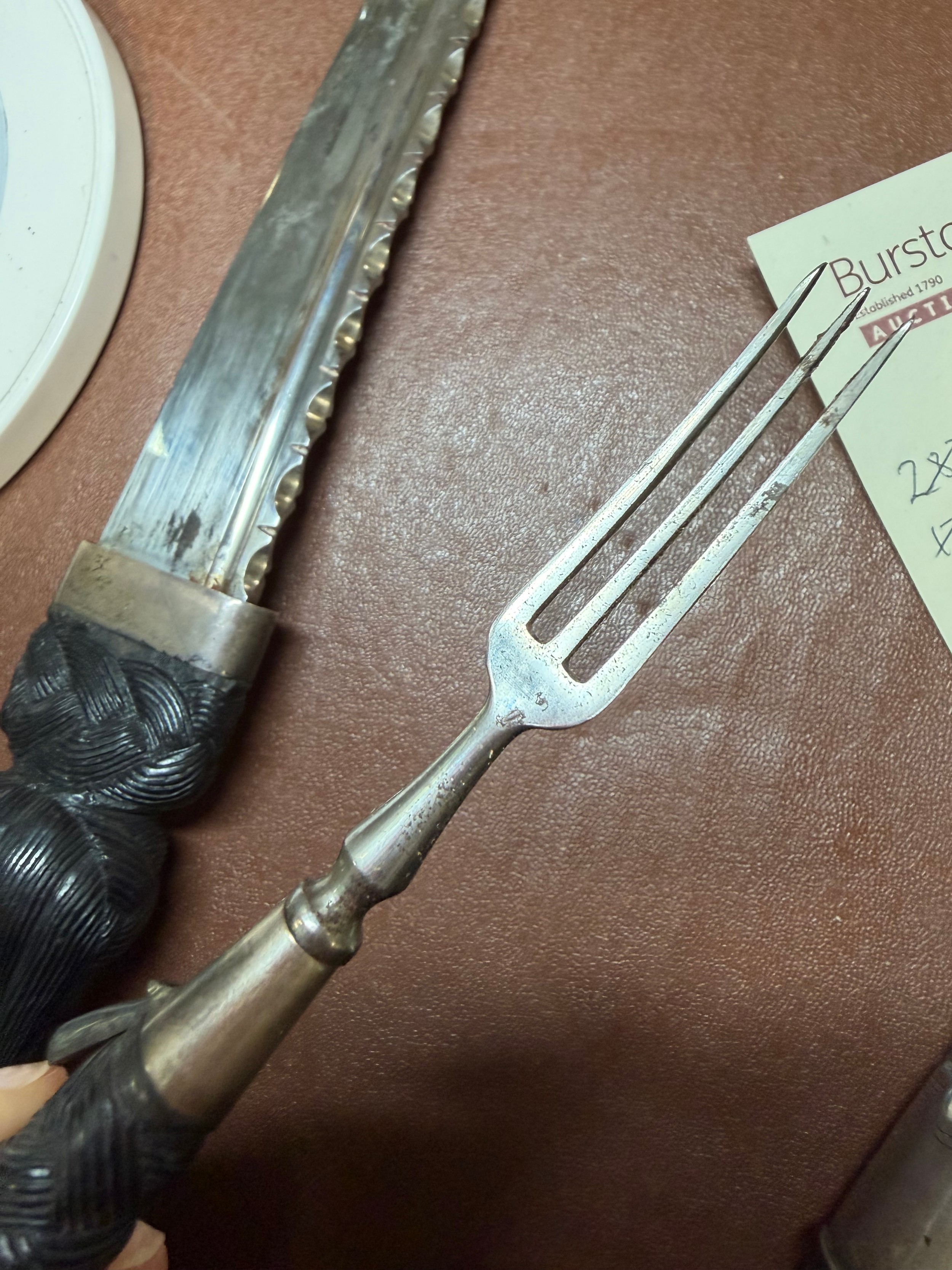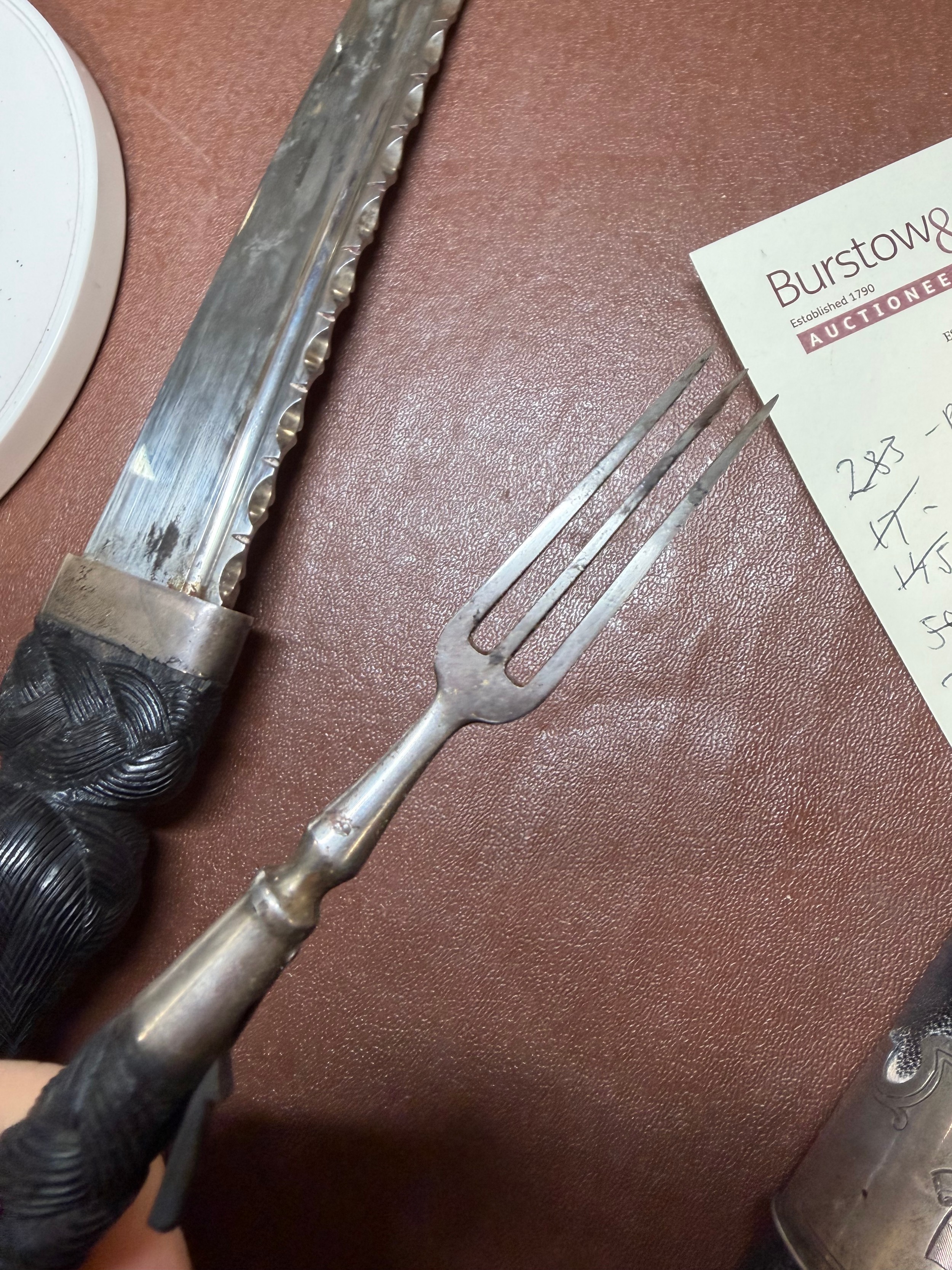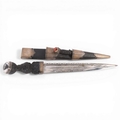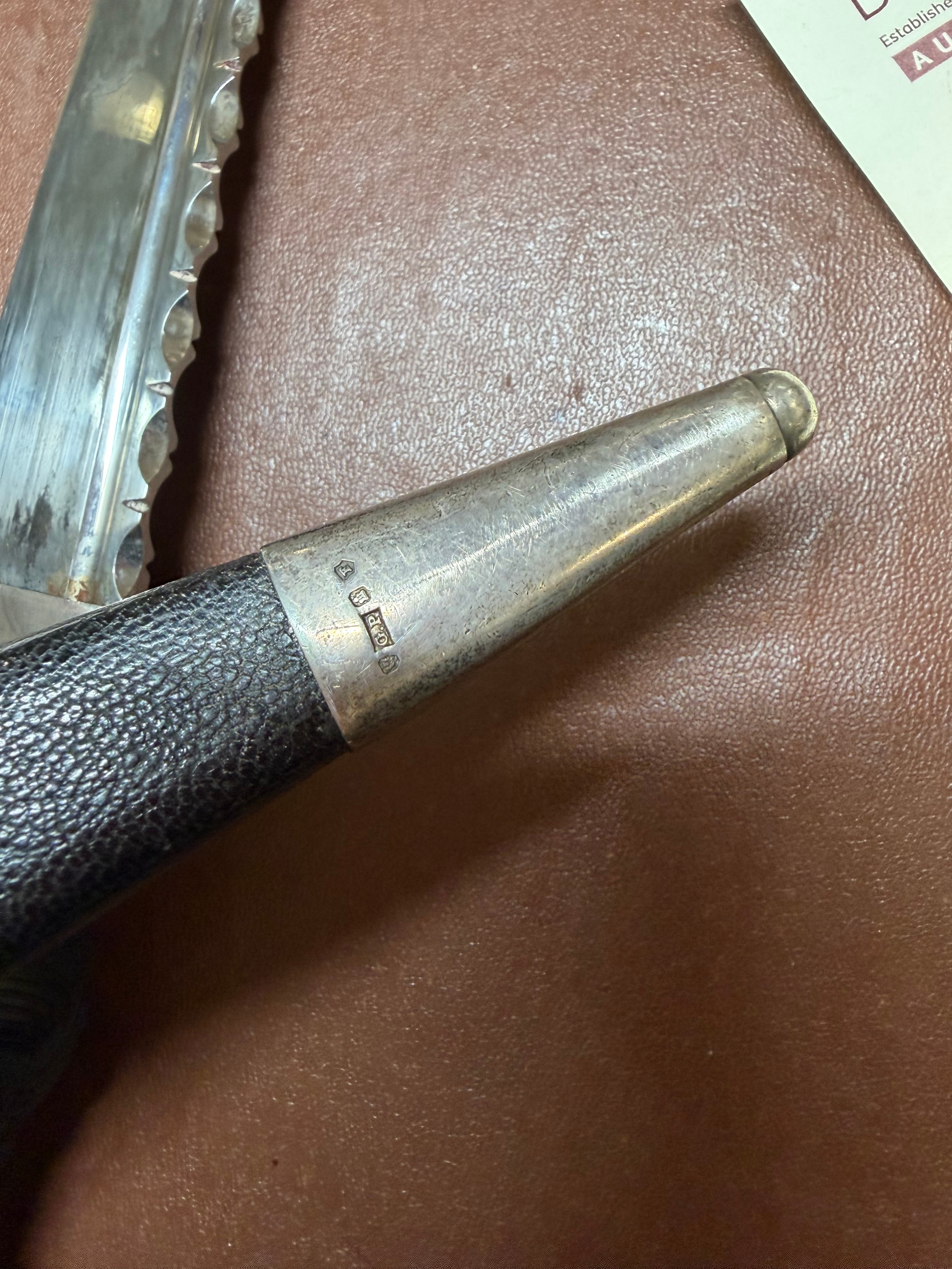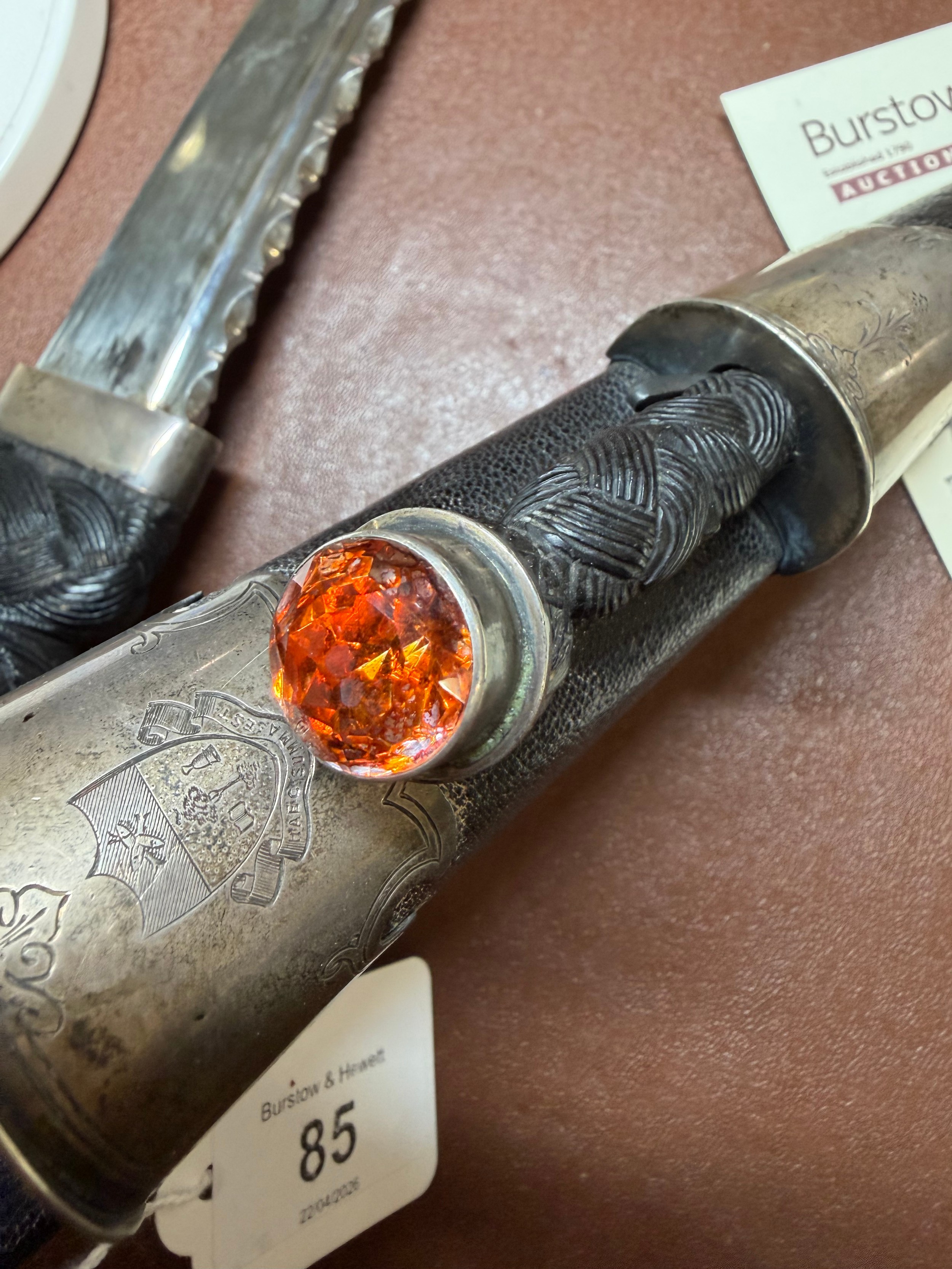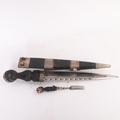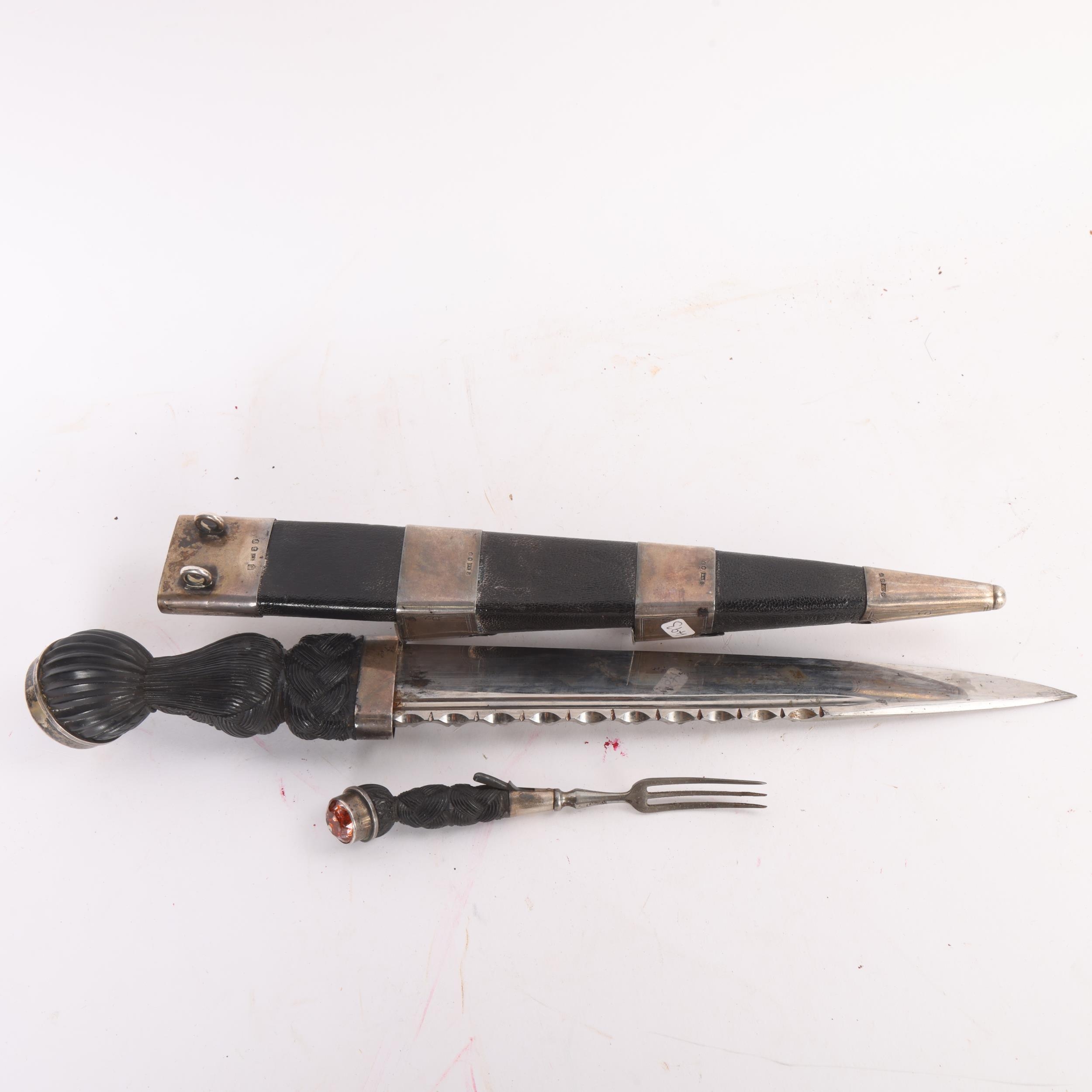 A George V Scottish silver-mounted dirk, with ebonised basket-weave hilt, the pommel set with a cut-glass Cairngorm, leather-covered scabbard, with companion fork (knife missing), hallmarks 1911, length 44cm