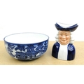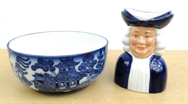 Doulton Burslem willow patterned bowl and a Wood and Sons Quaker character jug