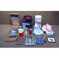 A set of white sectioned shelves and a selection of pictures, an oil painting and copper craft pictures.