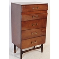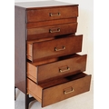 Meredew Furniture - A retro 20th Century 1970's walnut veneered pedestal upright chest of drawers having five drawers with shaped drawer fronts and angular brass handles. All raised on tapering supports. Measures approx; 117x66x45cm