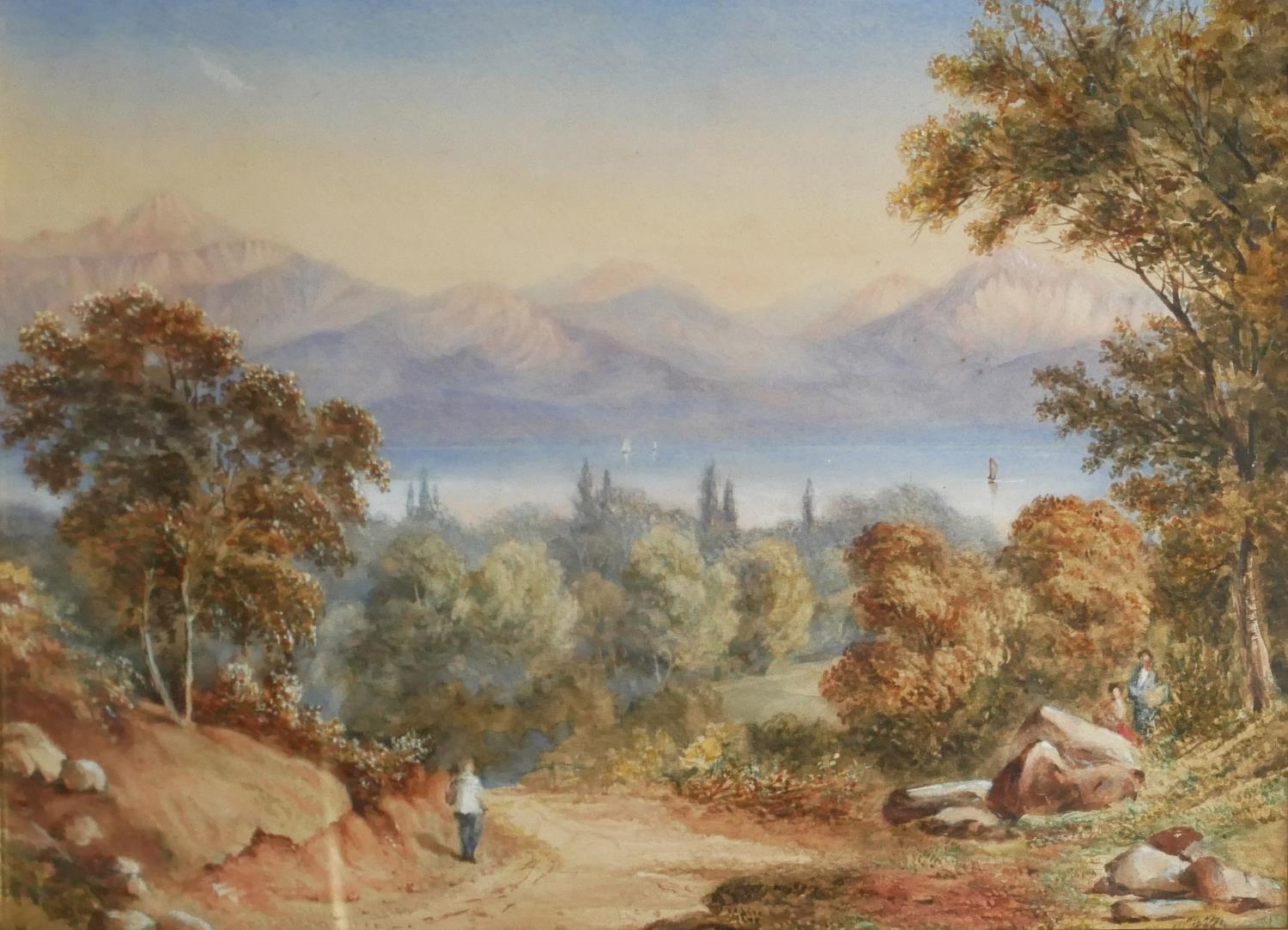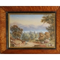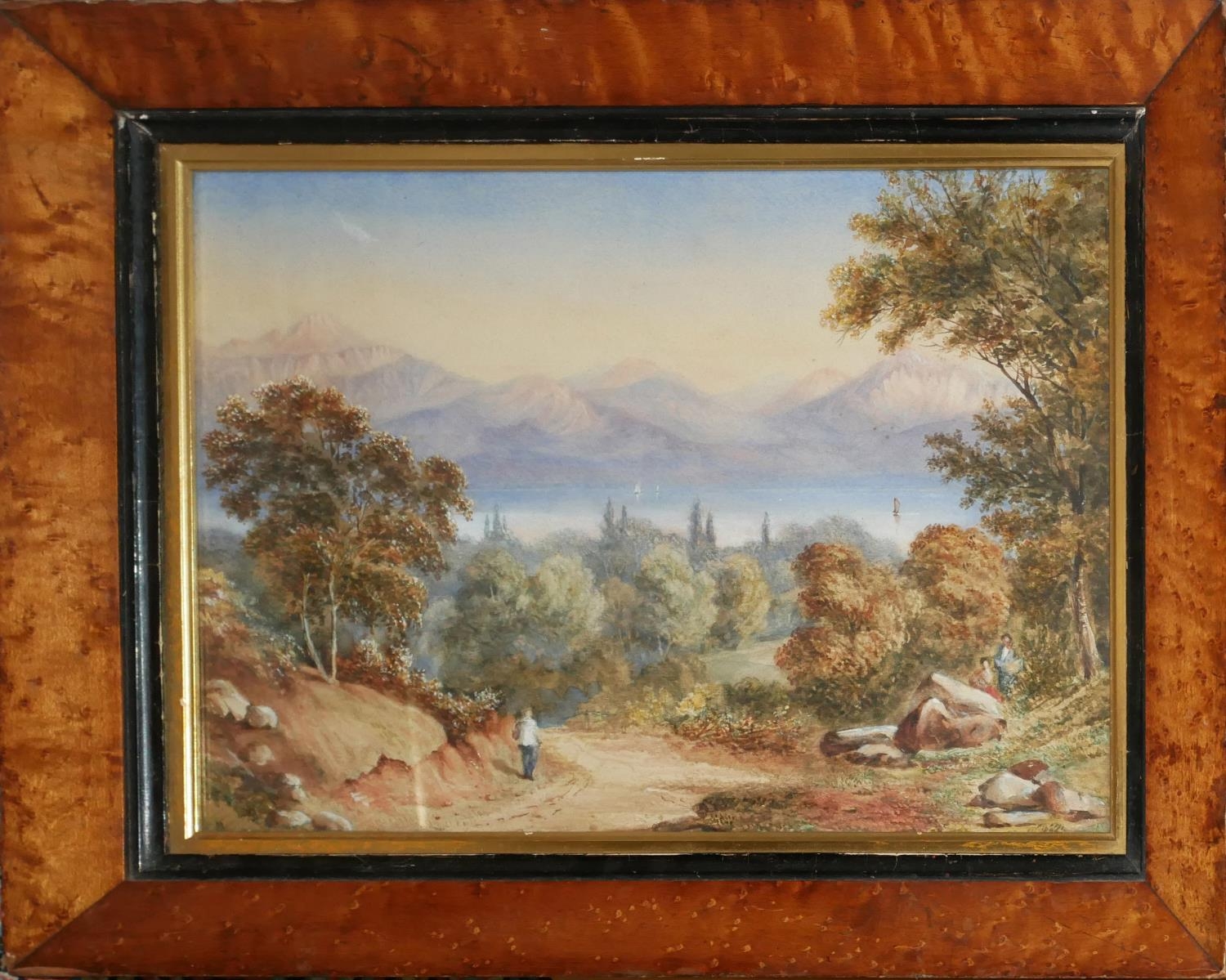 A solitary figure on a lakeside path with onlookers, bearing label verso ‘The Alton Gallery, 76 Church Road, London’, in a birdseye maple frame.