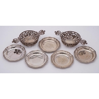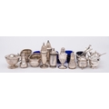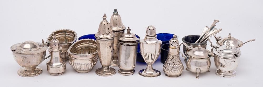 A collection of assorted silver condiments, various makers and dates:, includes pepperettes, mustard pots and salts, weighable silver 590gms, 18.97ozs.