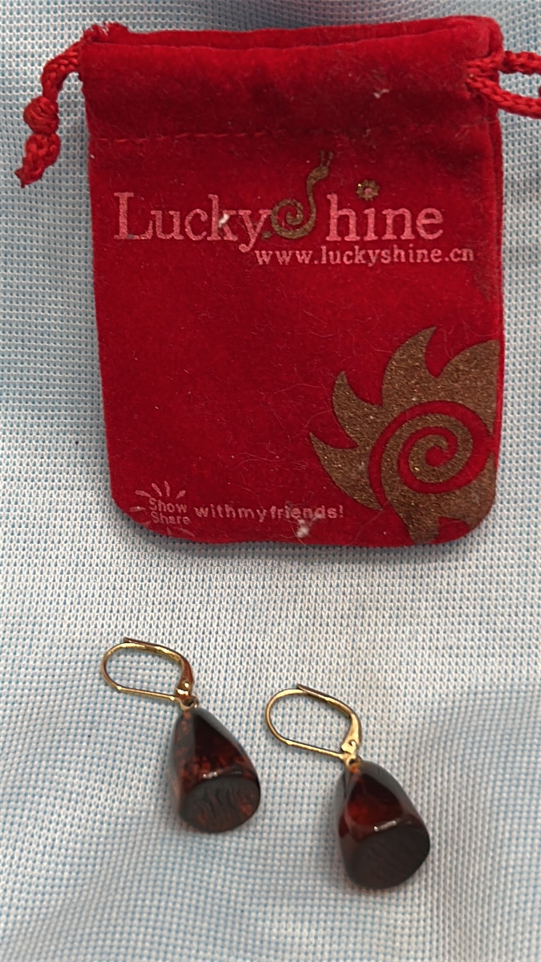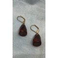 Pair of teardrop amber-tone resin drops on gold-colour leverback hooks, contemporary costume earrings.
