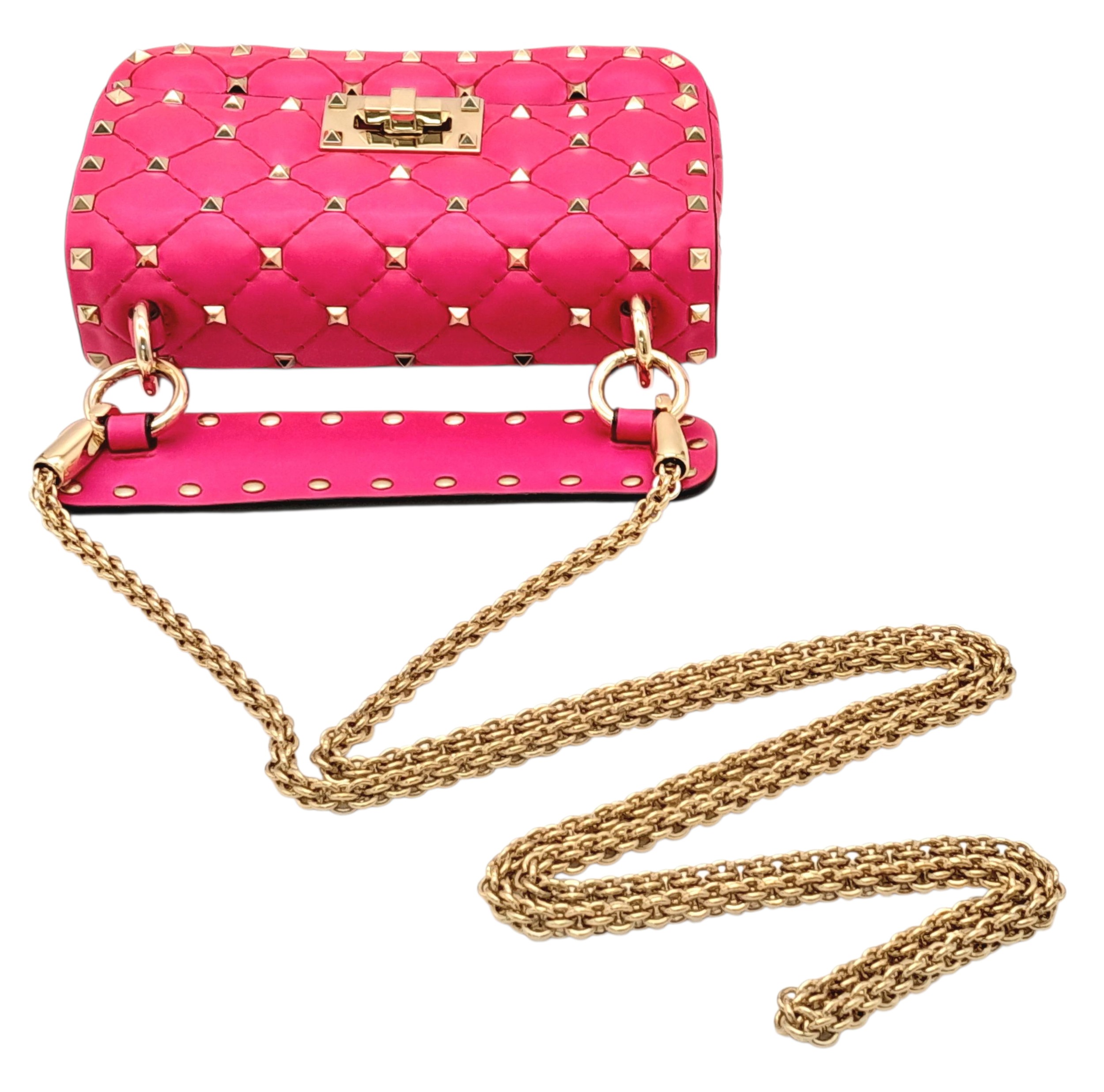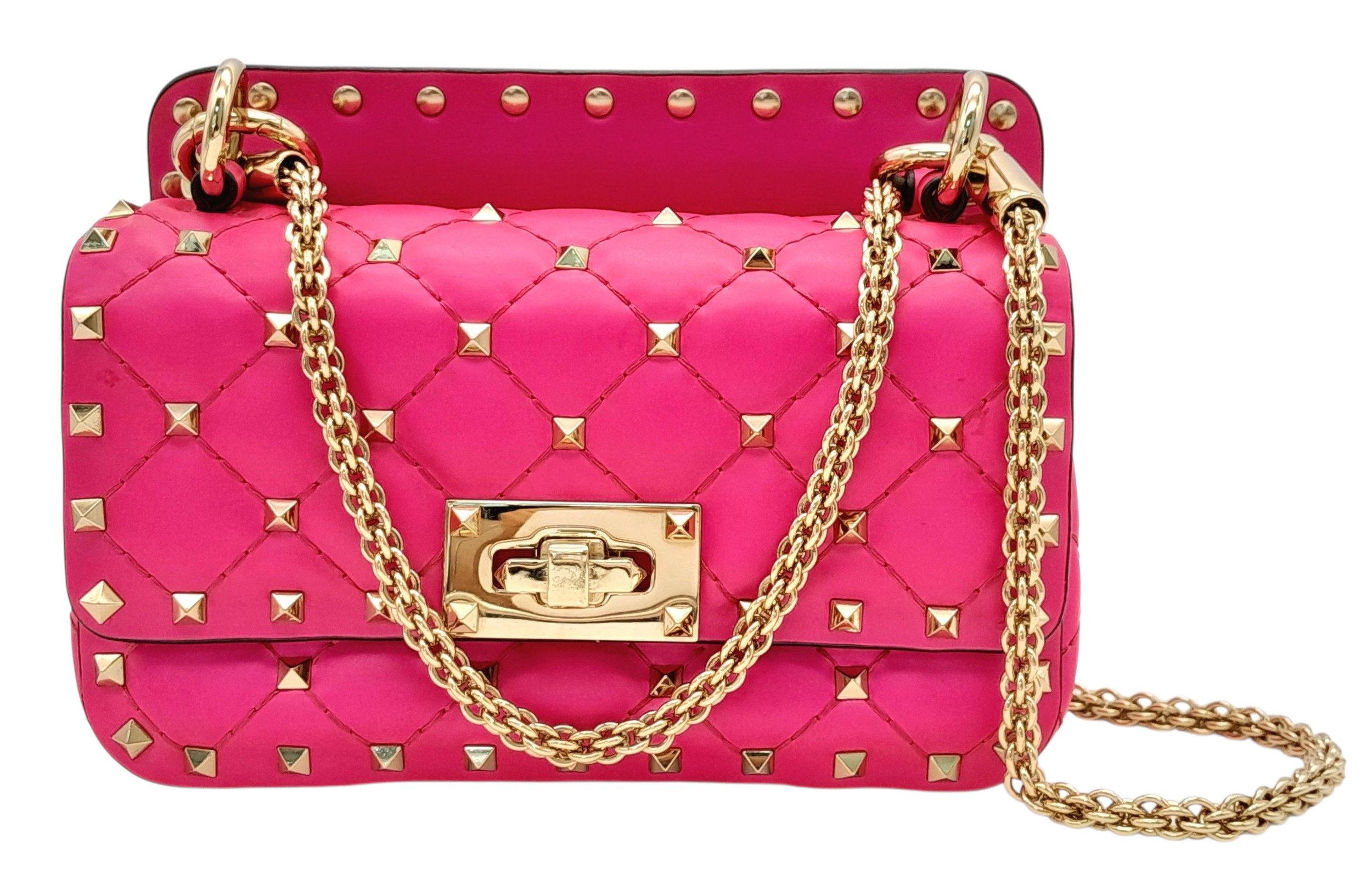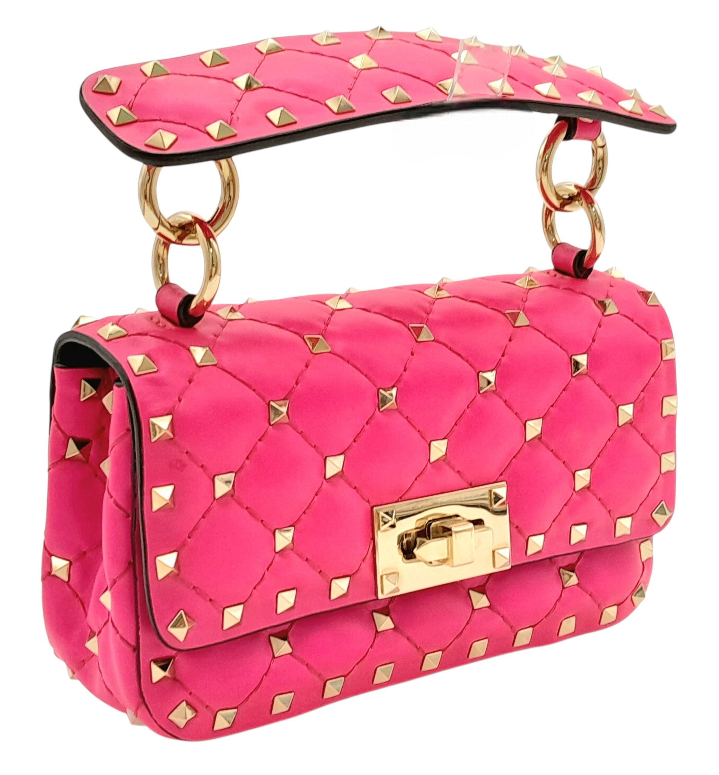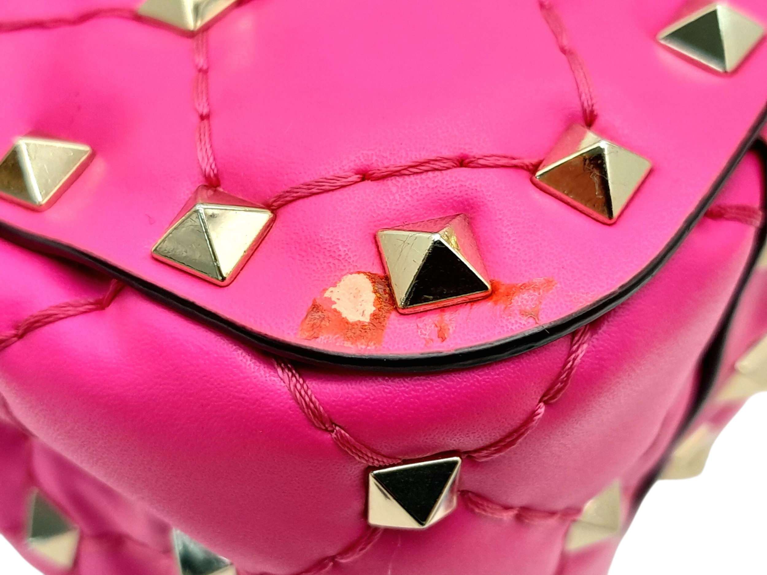 A Valentino Neon Pink Mini Rockstud Crossbody Bag. Quilted leather exterior with gold-toned hardware, studs, single handle, removeable chain strap and twist lock closure. Black leather interior with an open side pocket. Comes with dust cover and care booklet. Approximately 17cm length x 10cm height. A few stains to exterior but in good condition overall - please see photos or request a condition report. Ref: STK023573