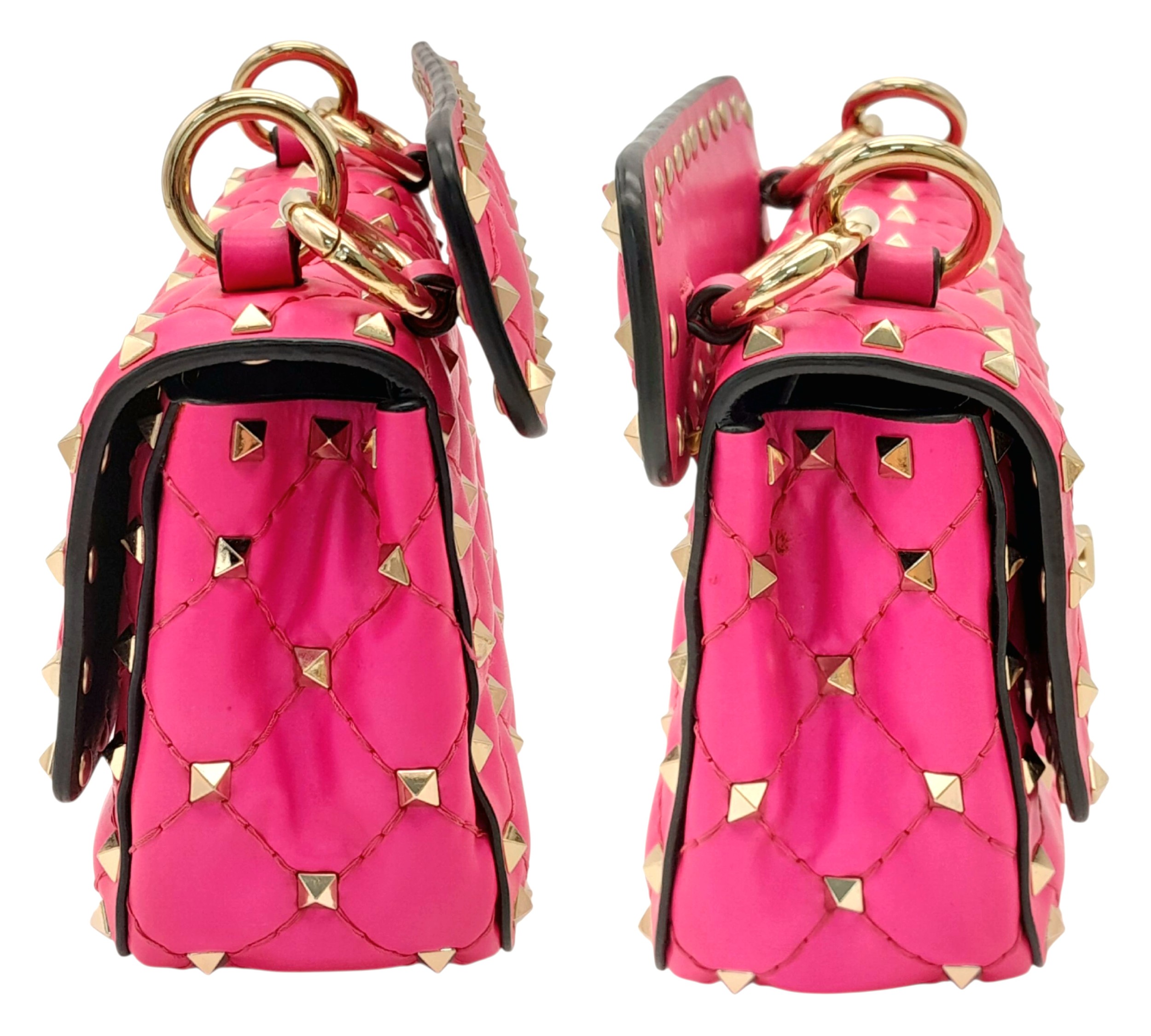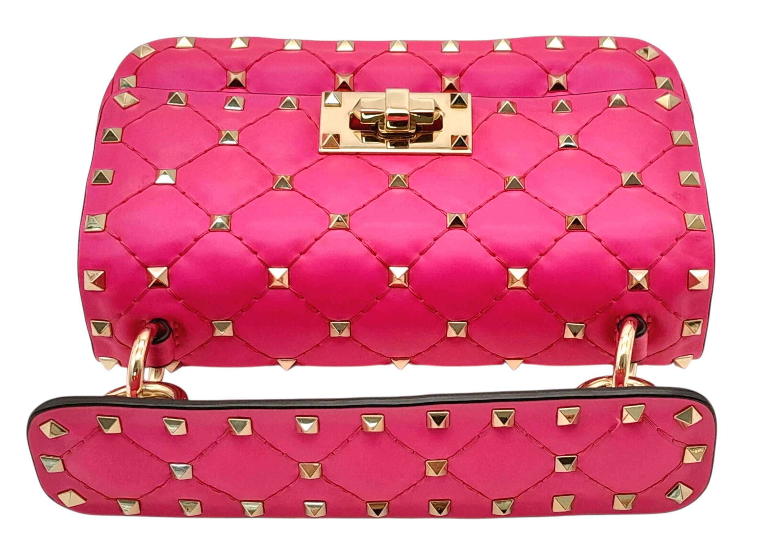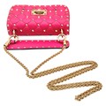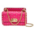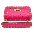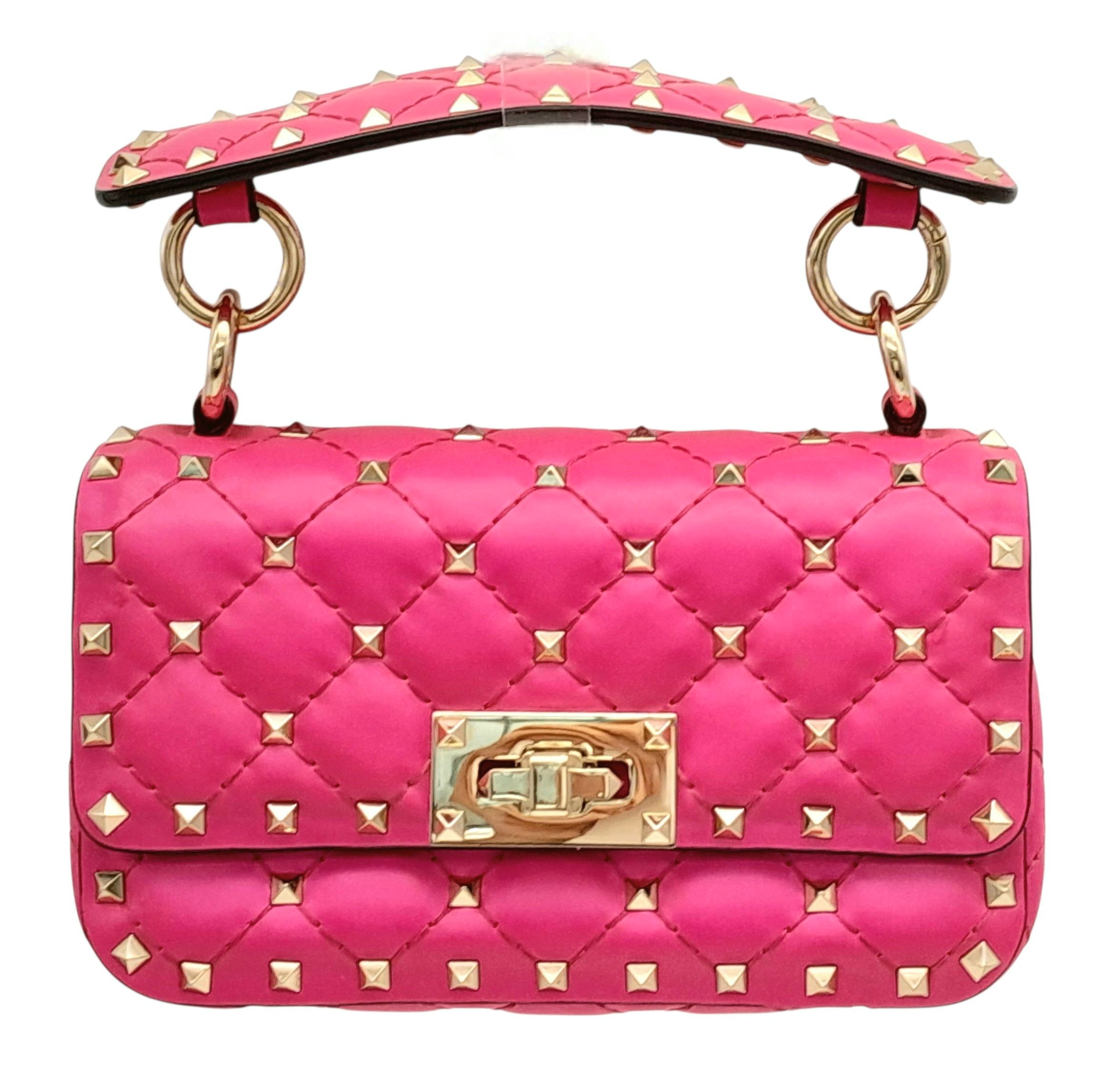 A Valentino Neon Pink Mini Rockstud Crossbody Bag. Quilted leather exterior with gold-toned hardware, studs, single handle, removeable chain strap and twist lock closure. Black leather interior with an open side pocket. Comes with dust cover and care booklet. Approximately 17cm length x 10cm height. A few stains to exterior but in good condition overall - please see photos or request a condition report. Ref: STK023573