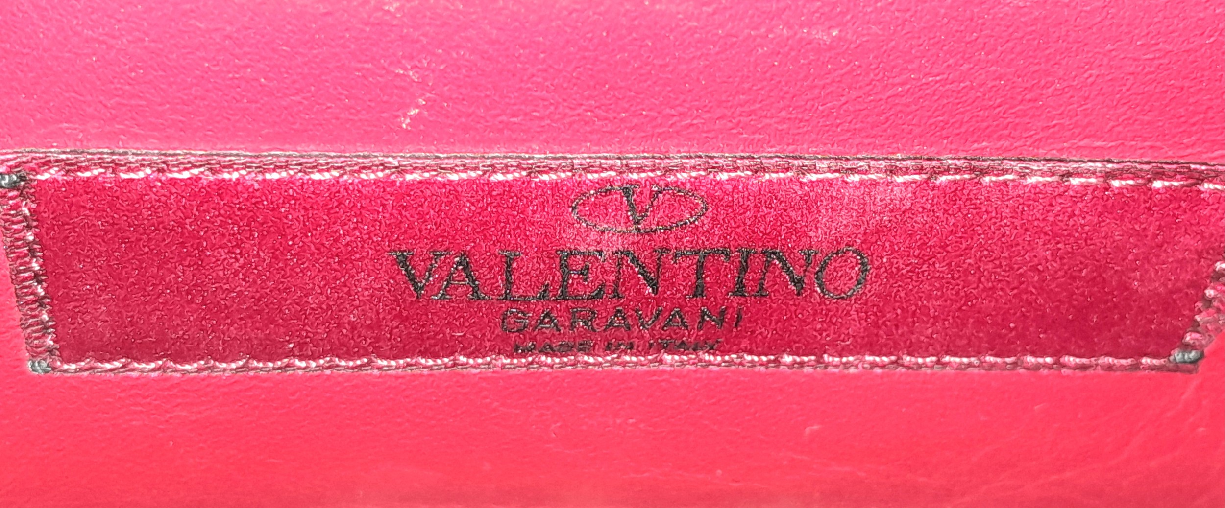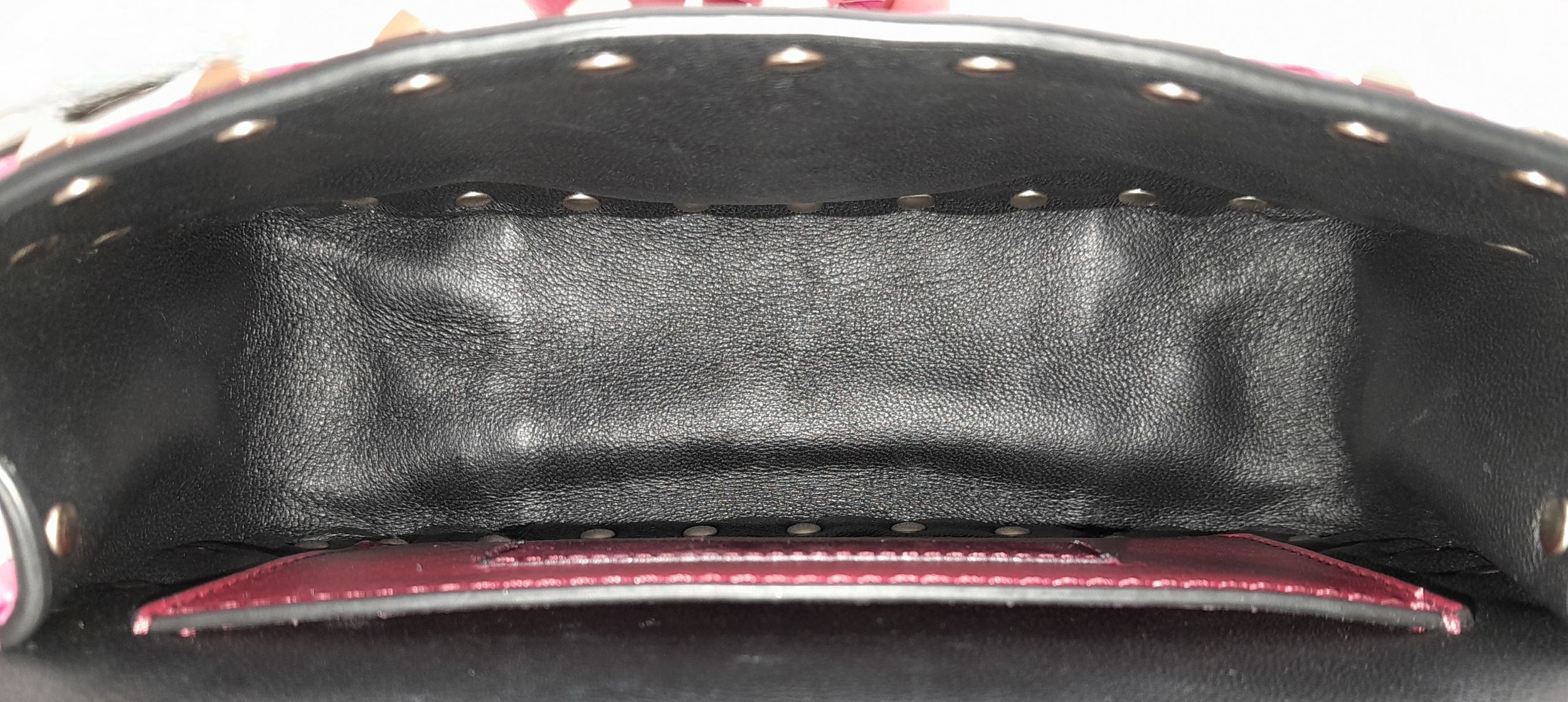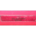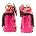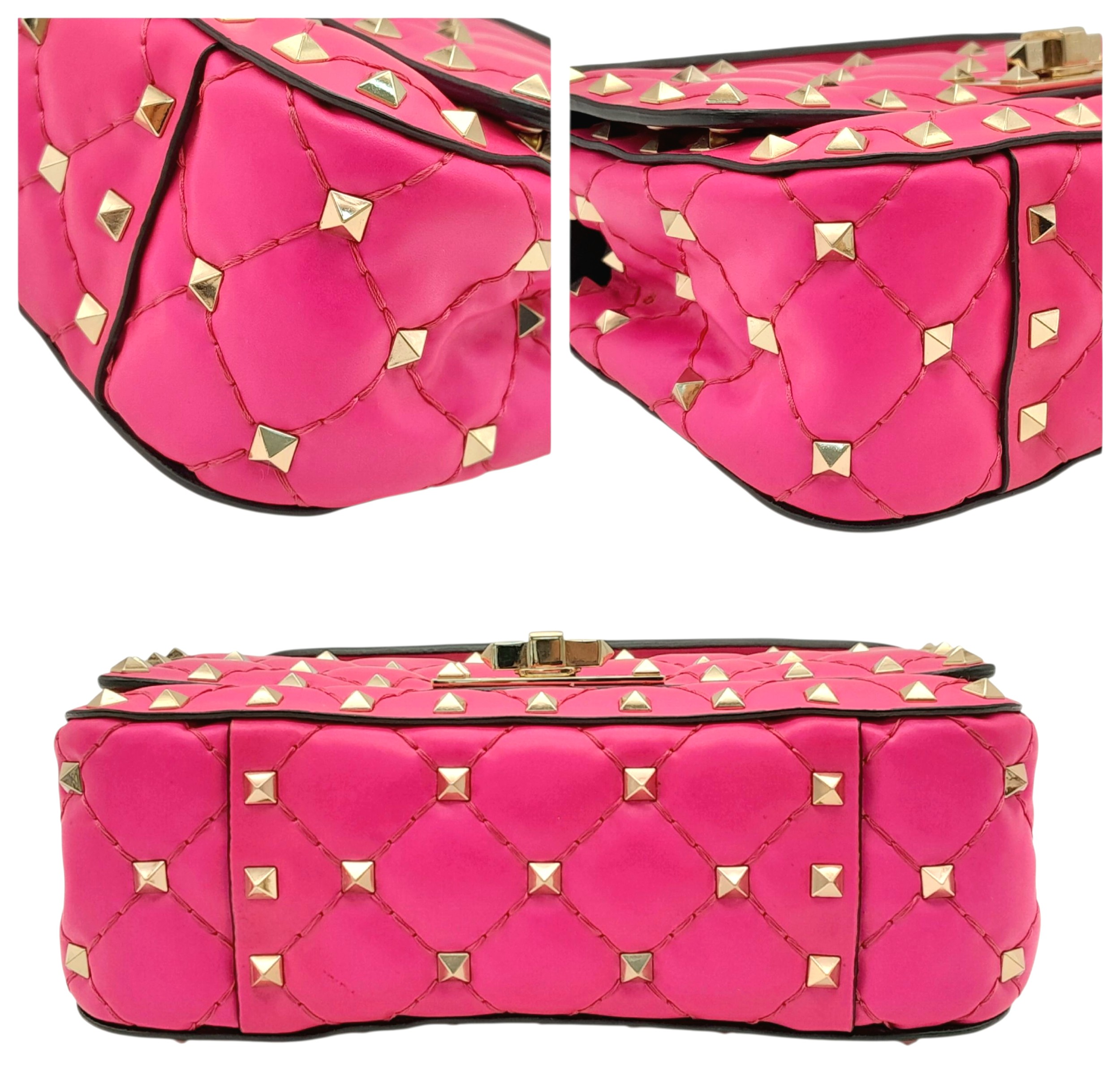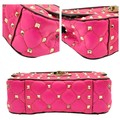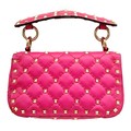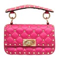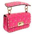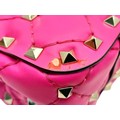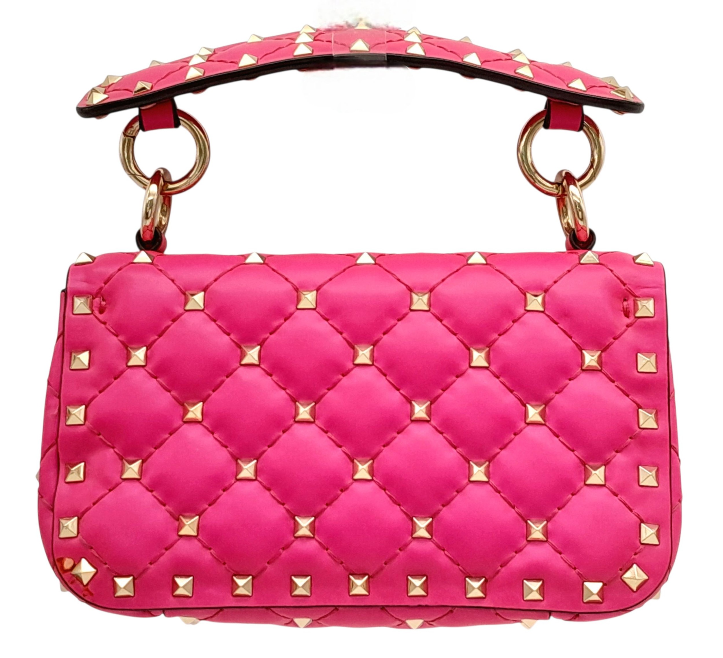 A Valentino Neon Pink Mini Rockstud Crossbody Bag. Quilted leather exterior with gold-toned hardware, studs, single handle, removeable chain strap and twist lock closure. Black leather interior with an open side pocket. Comes with dust cover and care booklet. Approximately 17cm length x 10cm height. A few stains to exterior but in good condition overall - please see photos or request a condition report. Ref: STK023573