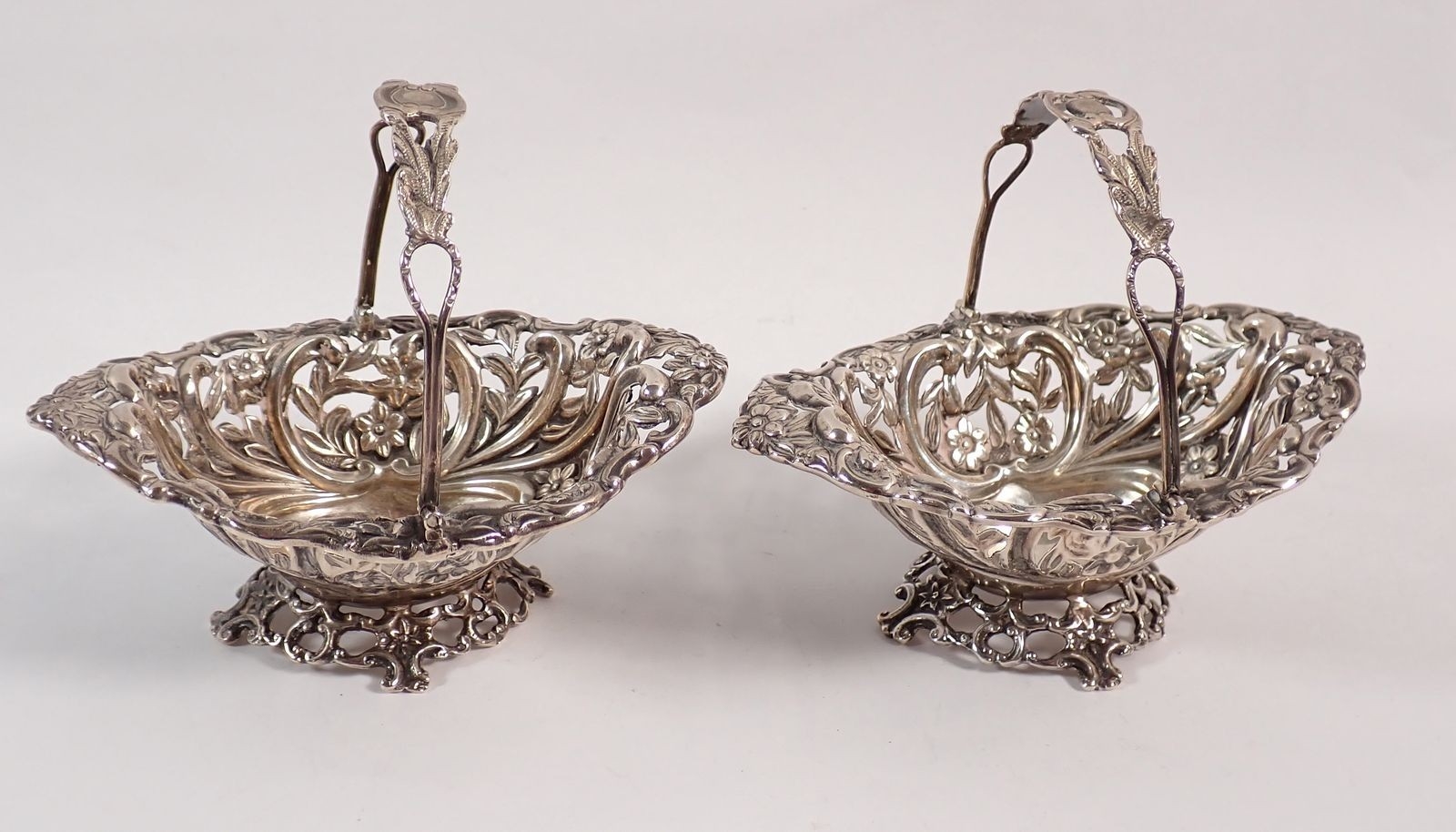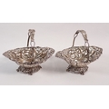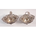 A pair of silver miniature baskets with embossed and pierced floral decoration by Henry Matthews, Birmingham 1894, 10cm wide, 101g