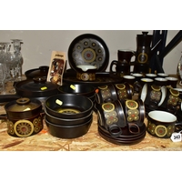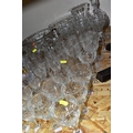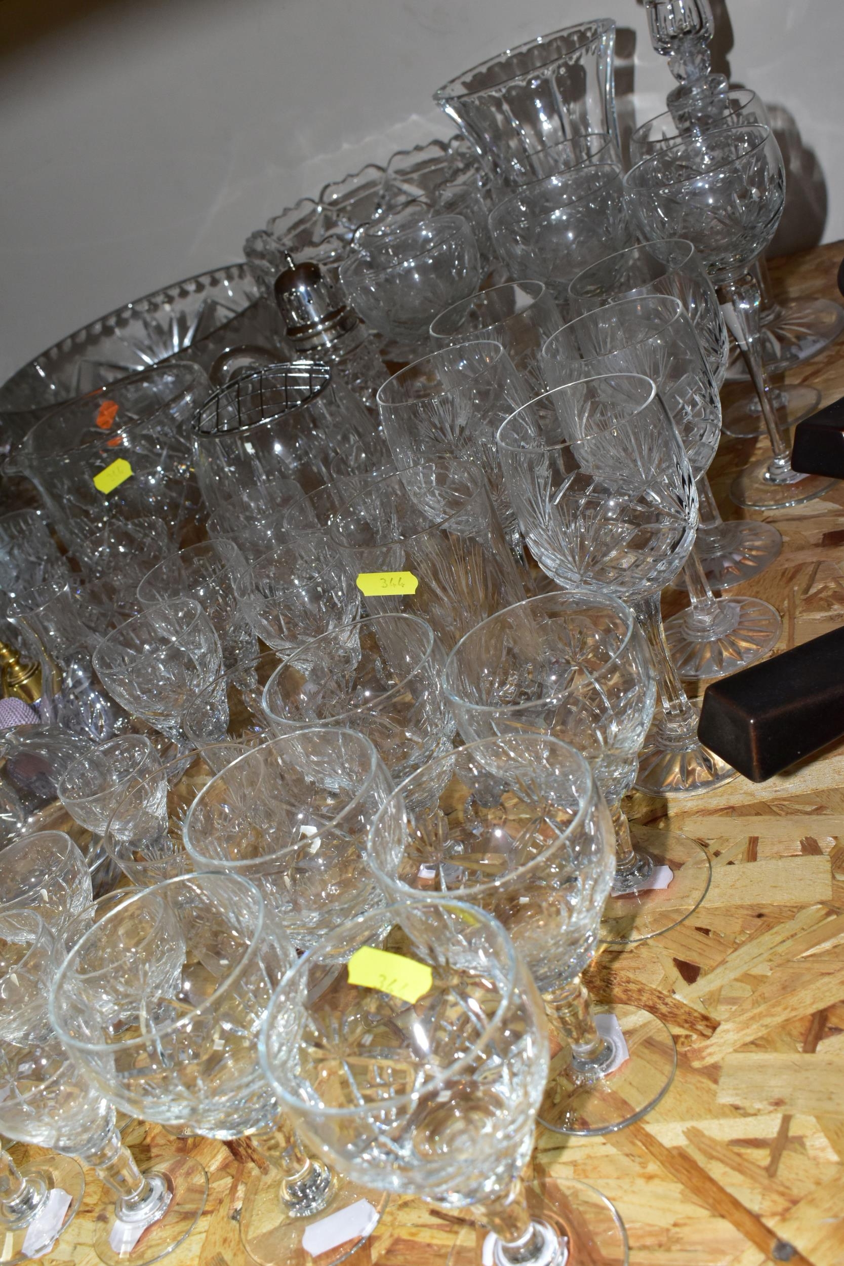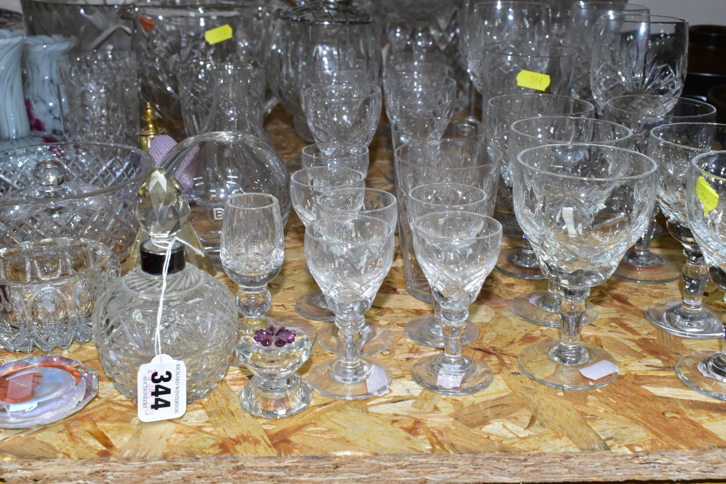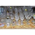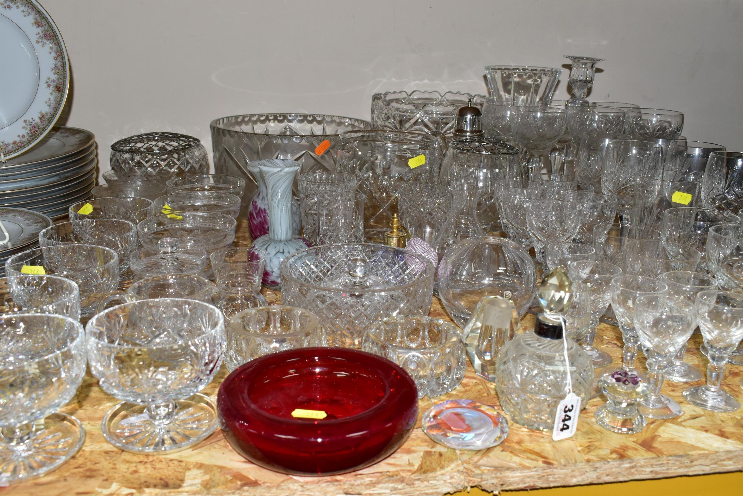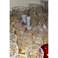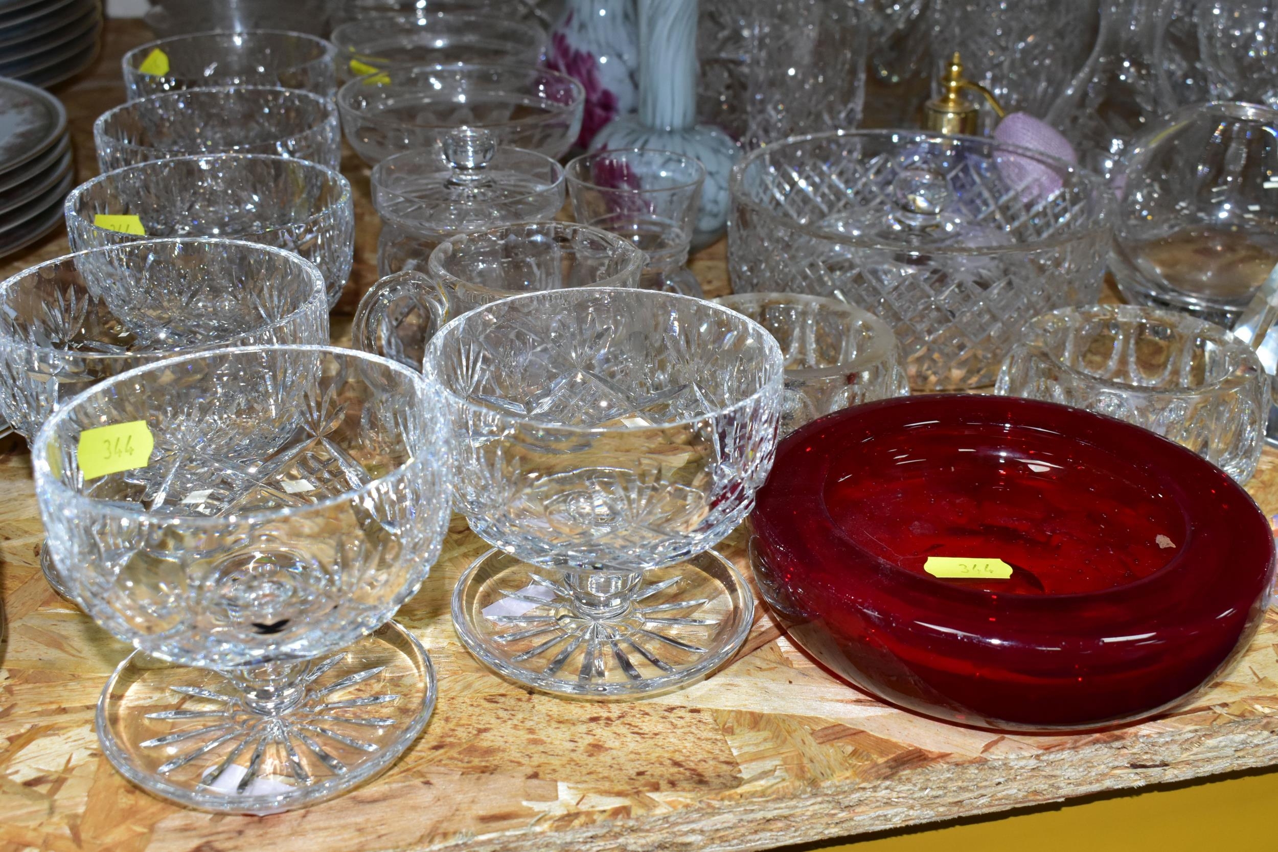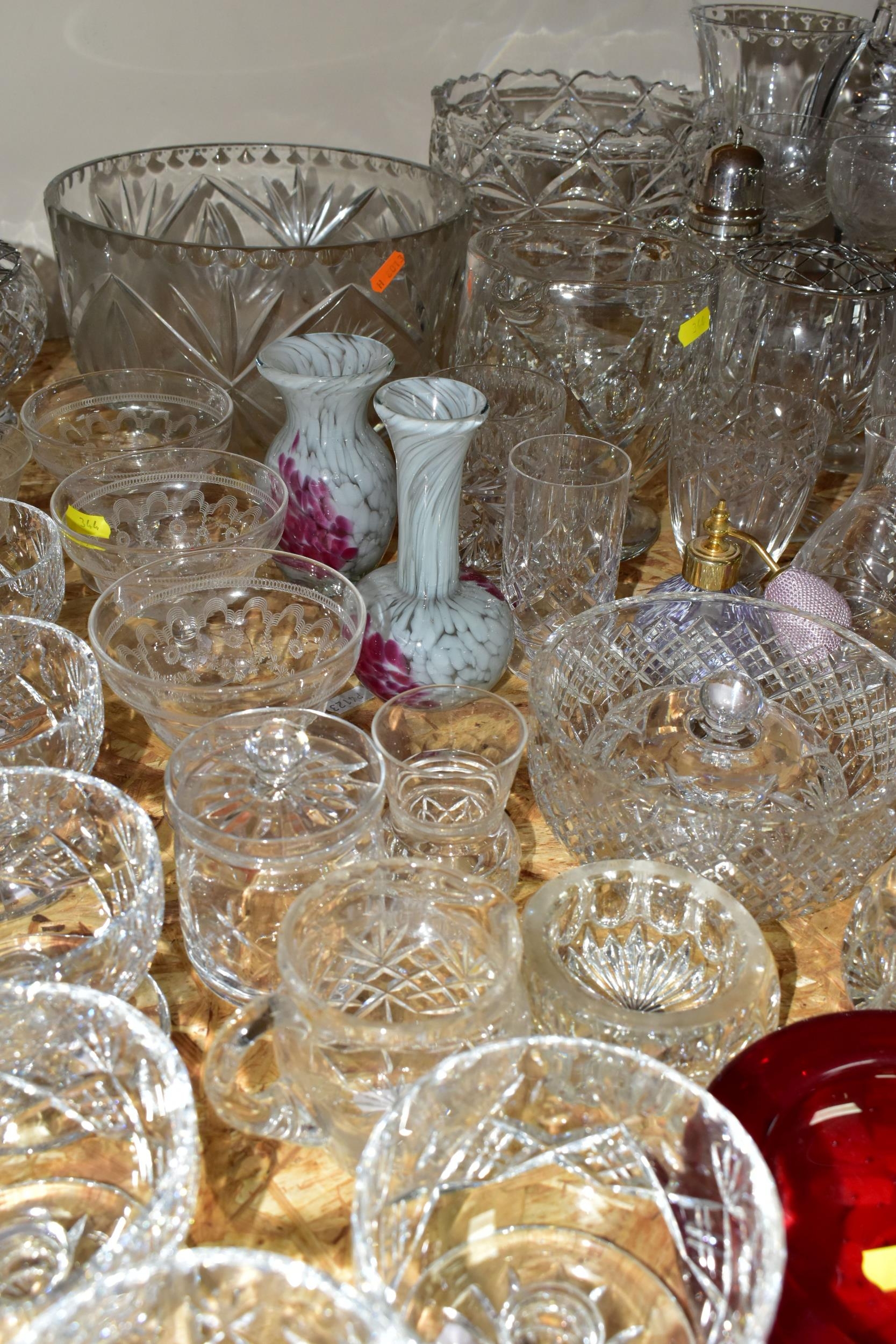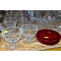 A QUANTITY OF CUT CRYSTAL, to include a Dartington Crystal bulbous bud vase, a set of six sundae dishes, two Brierly Crystal rose bowls, sugar sifter, a set of six Brierly Crystal hock glasses, pitcher, wine glasses, fruit bowls, two pink and white mottled Mdina bud vases, a perfume atomizer, a 1970's red controlled bubble dish (Qty) (Condition Report: no obvious damage)