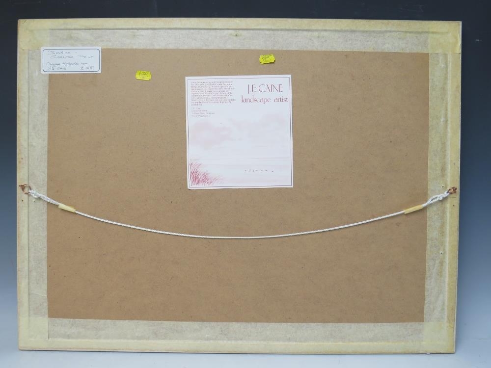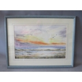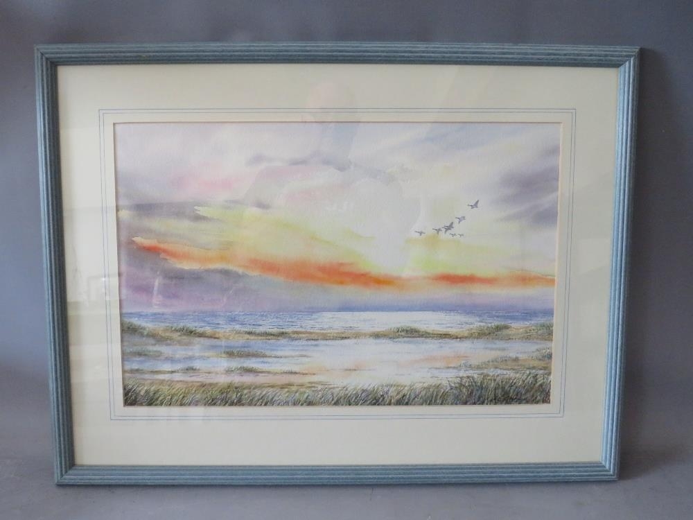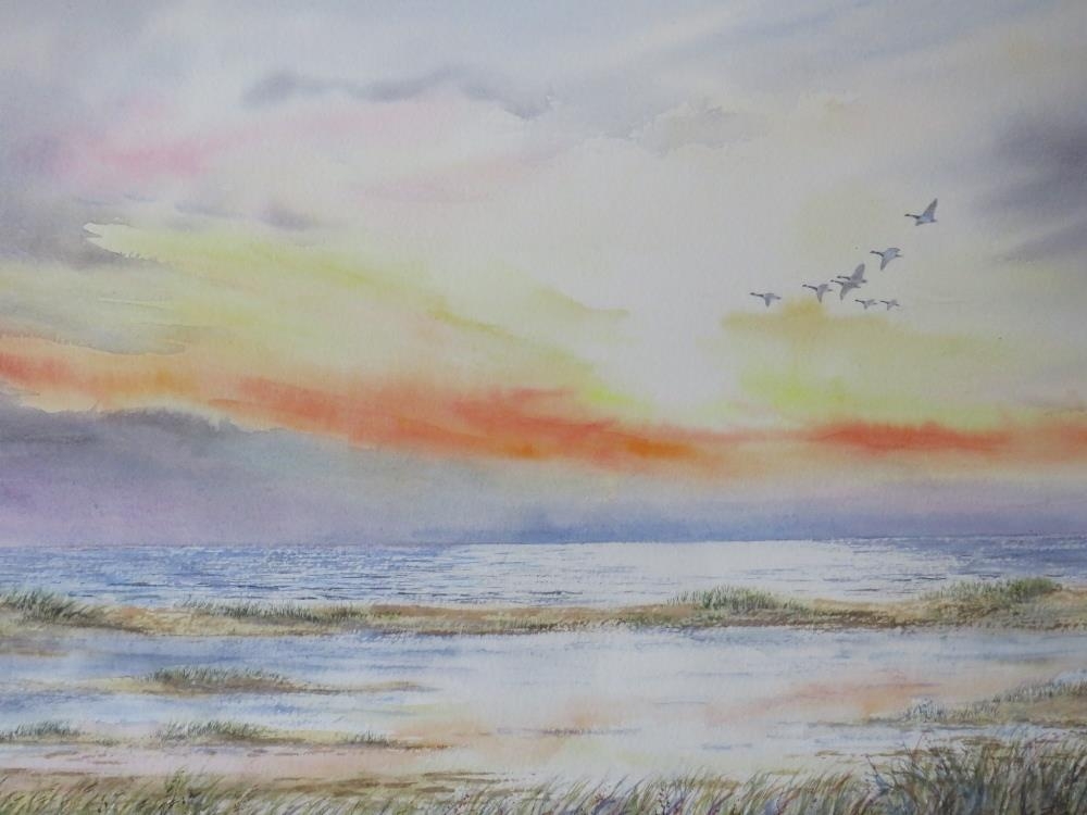 JENNY E. CAINE (XX). Lincolnshire artist, 'Sunrise Gibraltar Point', with geese in flight, see verso, signed lower right, watercolour, framed and glazed 35 x 53 cm