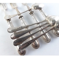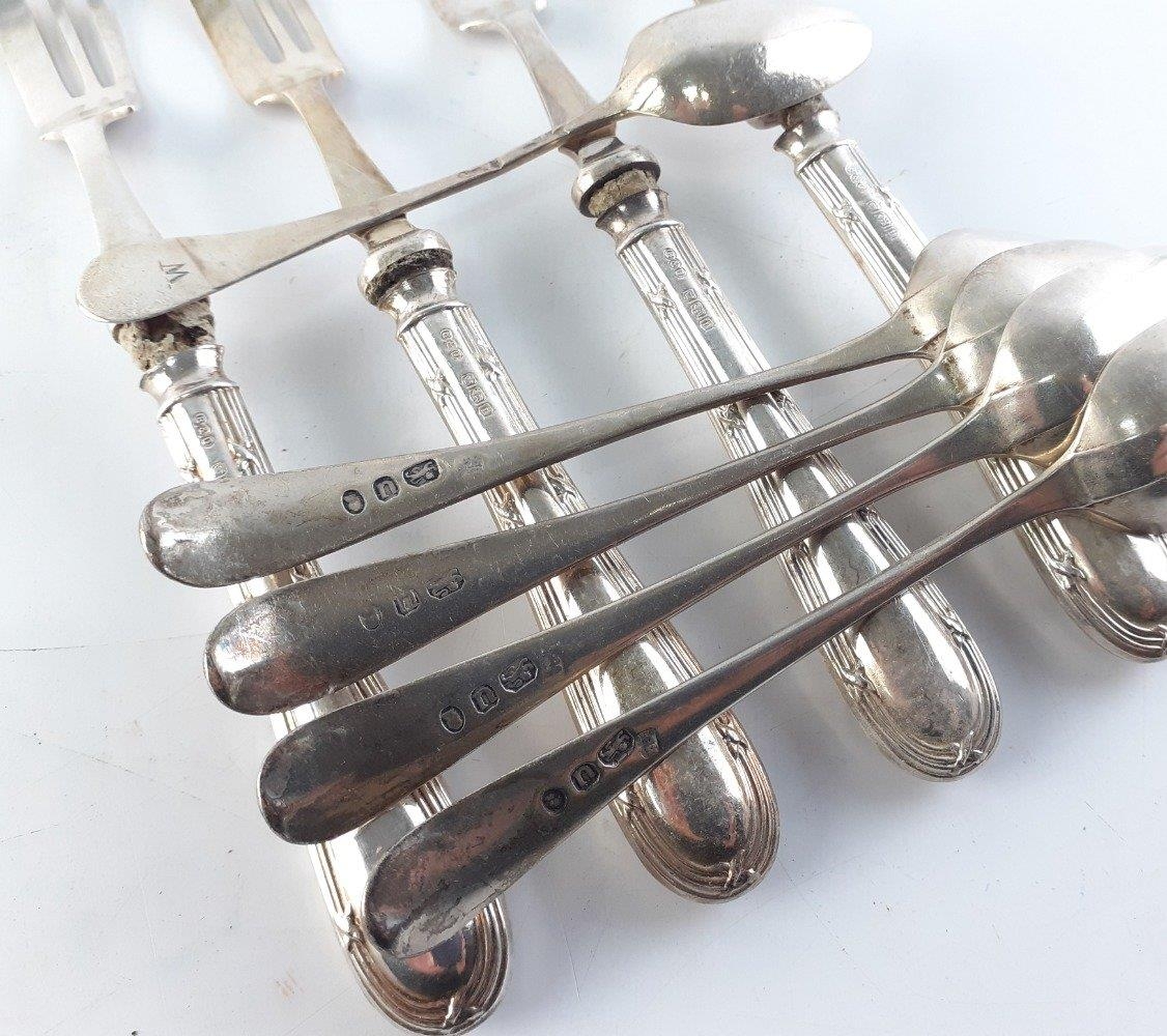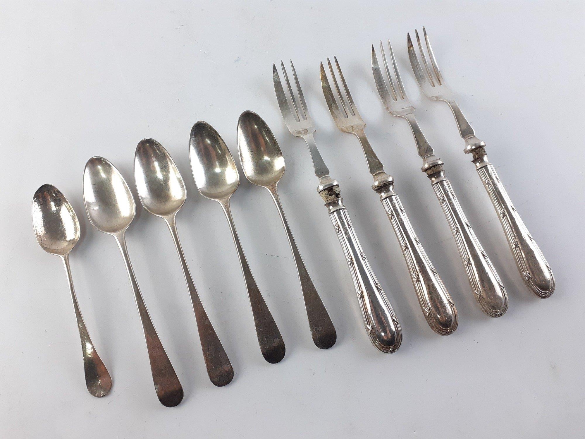 Four silver-handled antique cake forks gross weight 91g. Also five hallmarked teaspoons weighing 64g approx