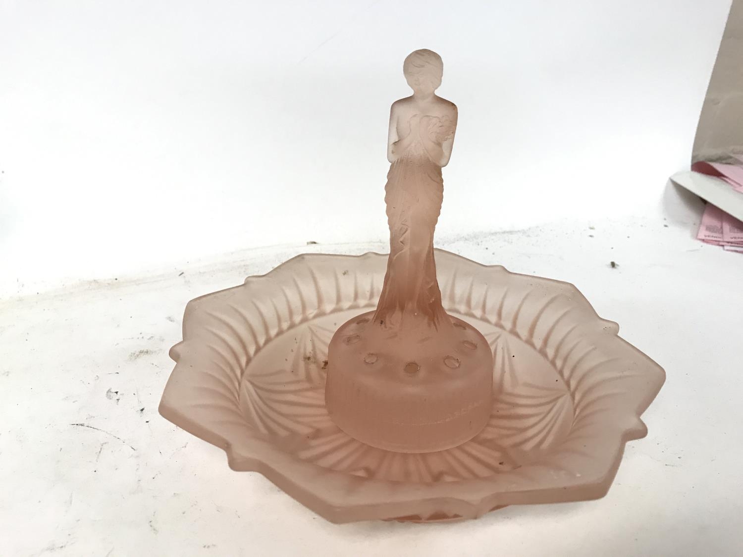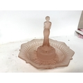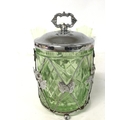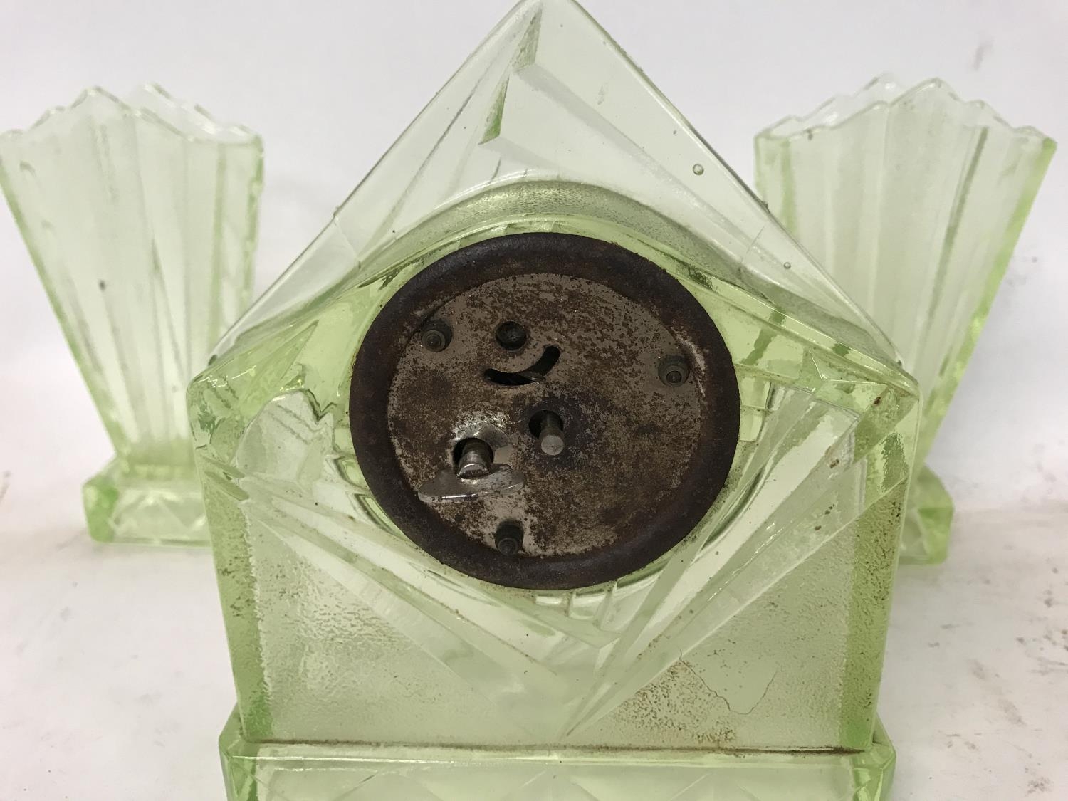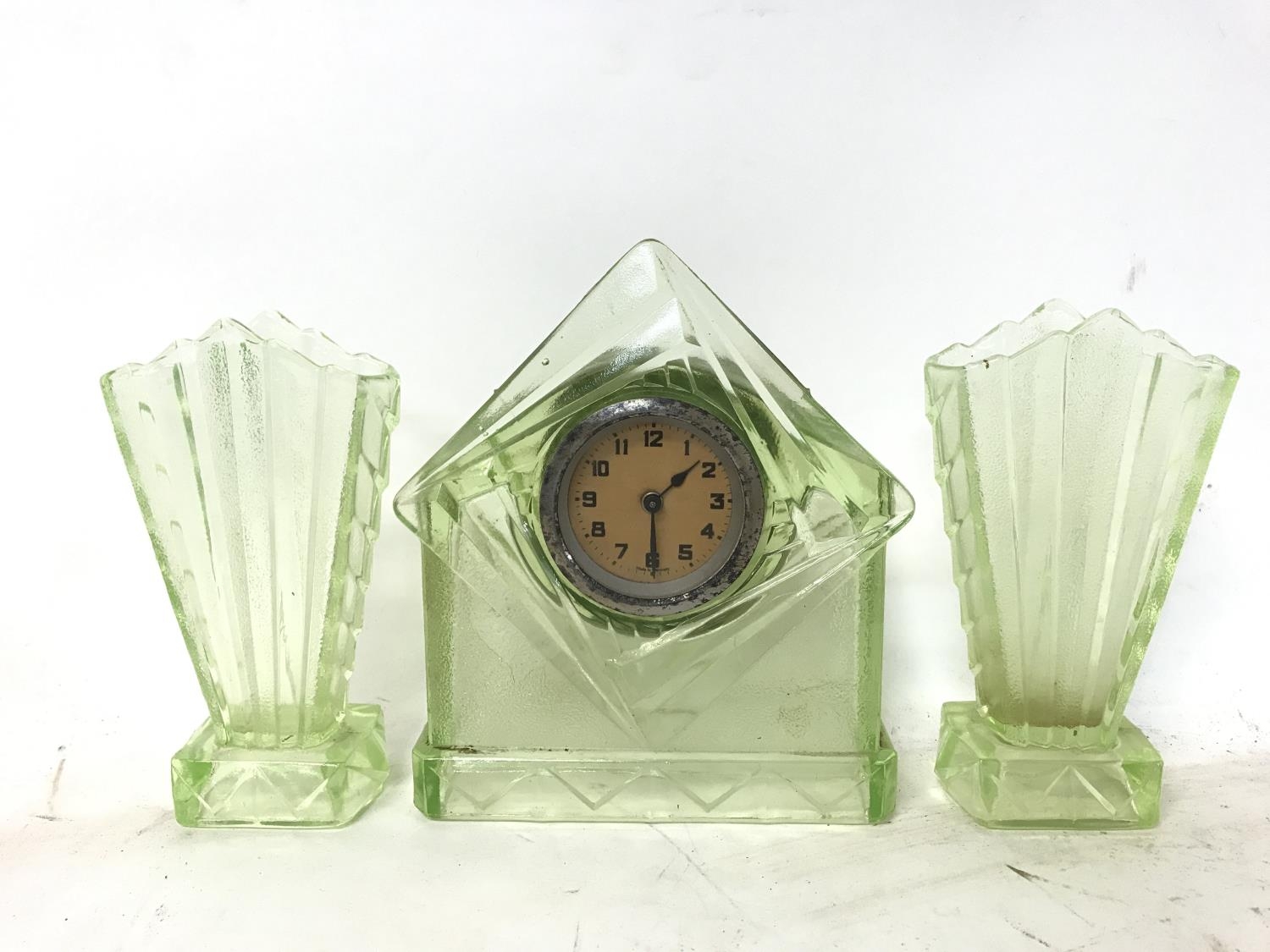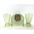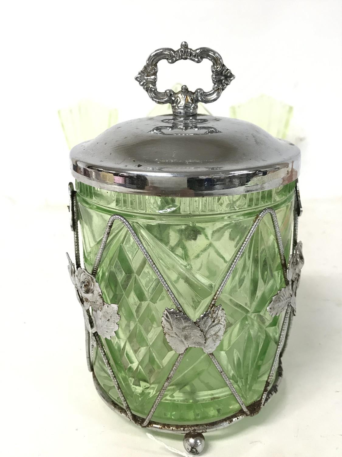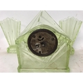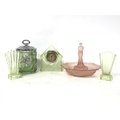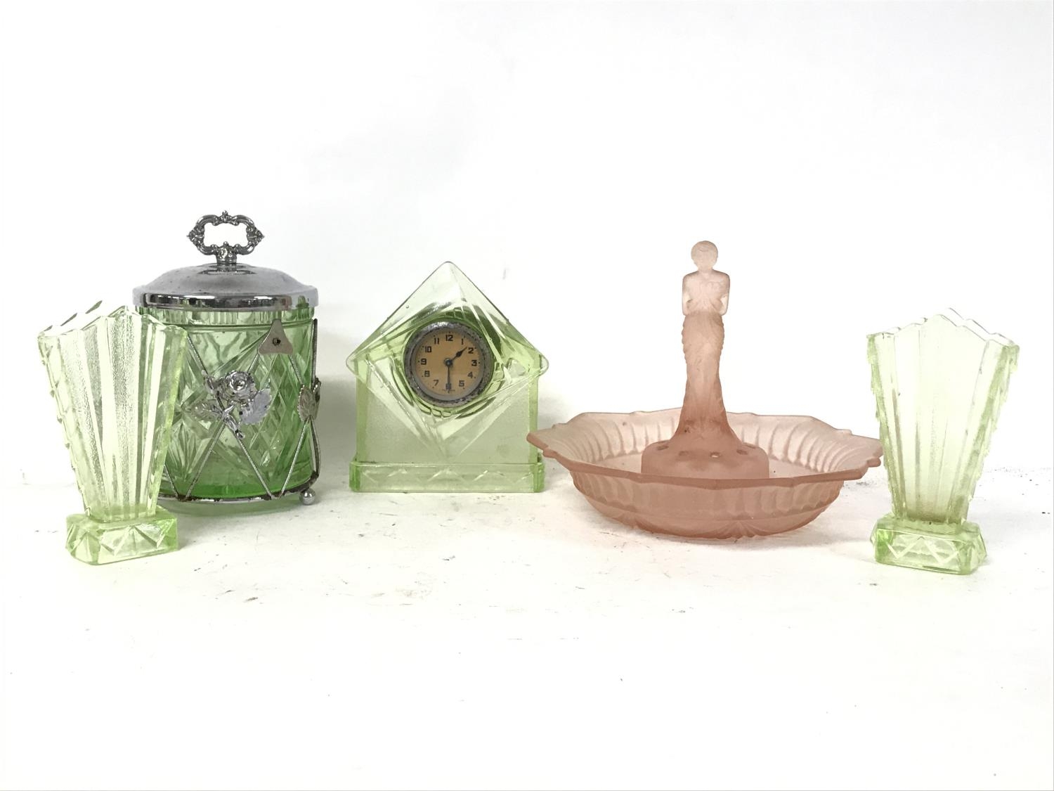 A collection of coloured glass ware including a clock, flower bowl and a biscuit barrel