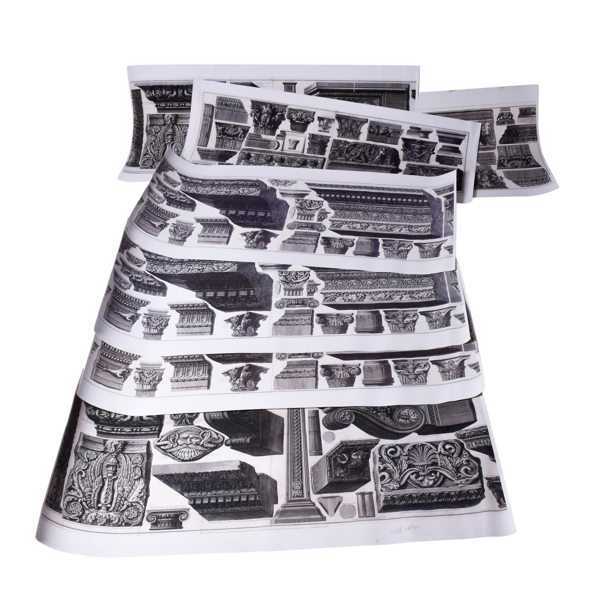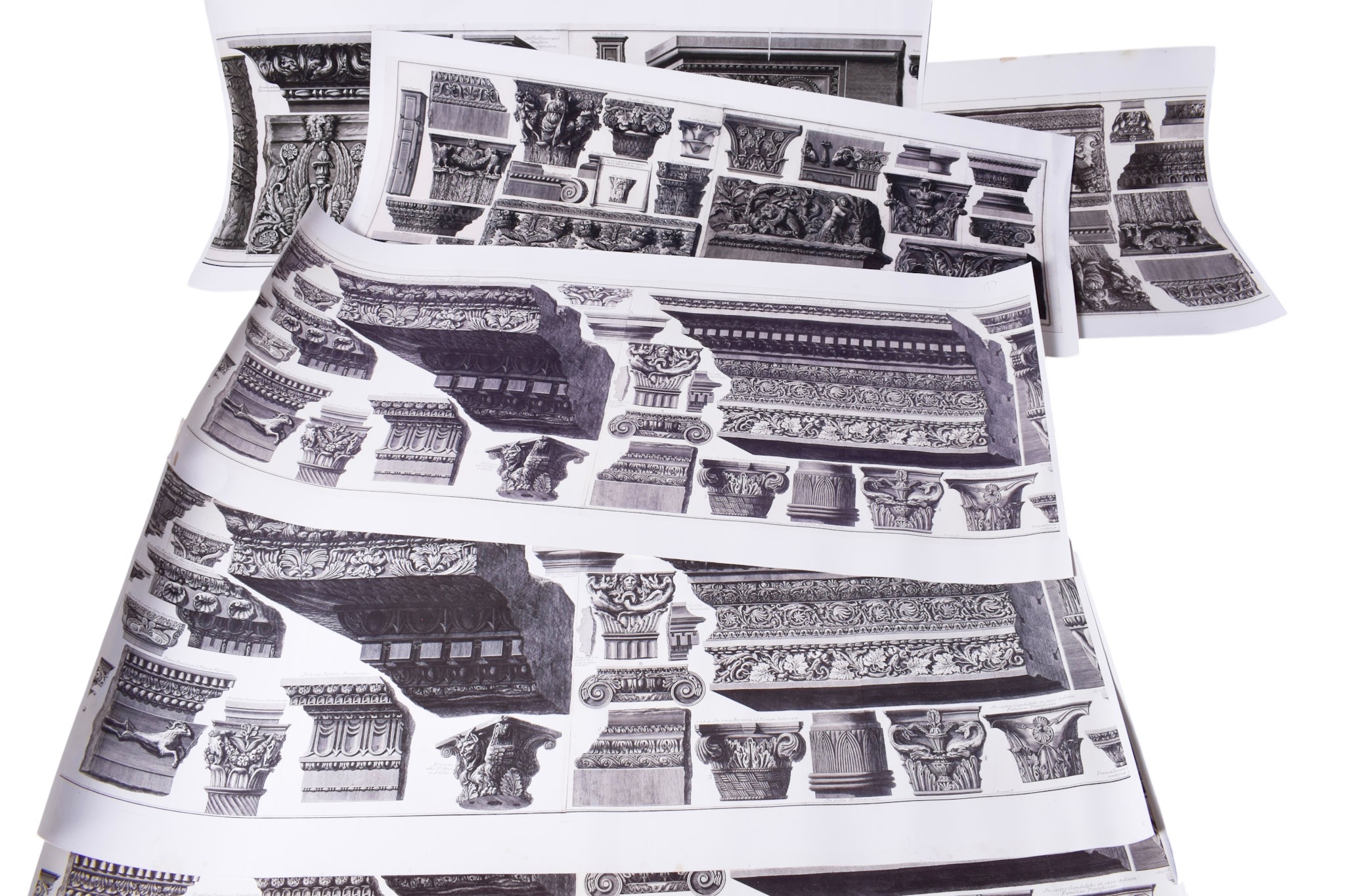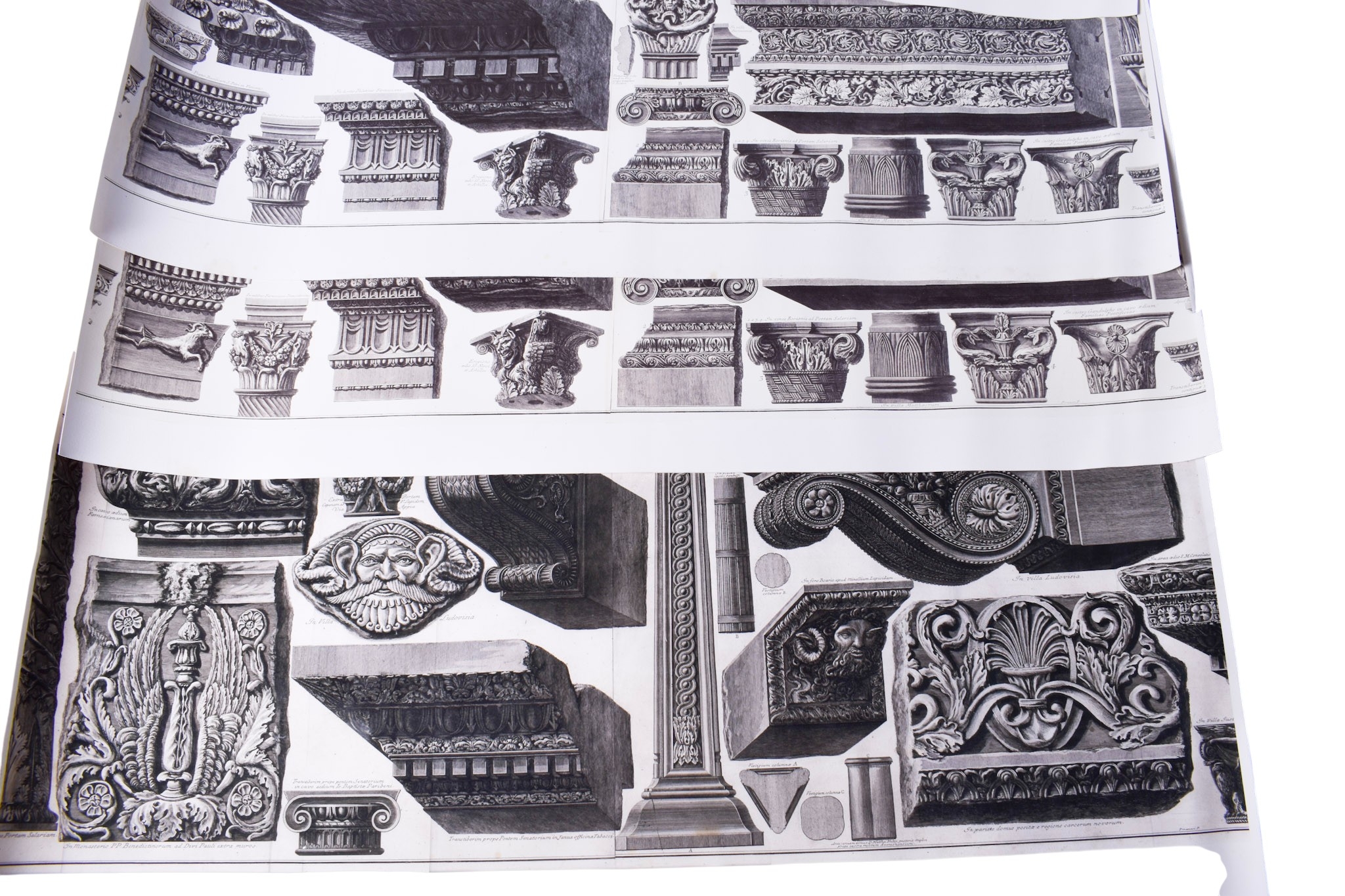A collection of prints depicting architectural components. Including columns, ancient Greek and Roman carvings, etc. some signed and designed to be joined together, 54cm x 113cm.