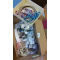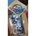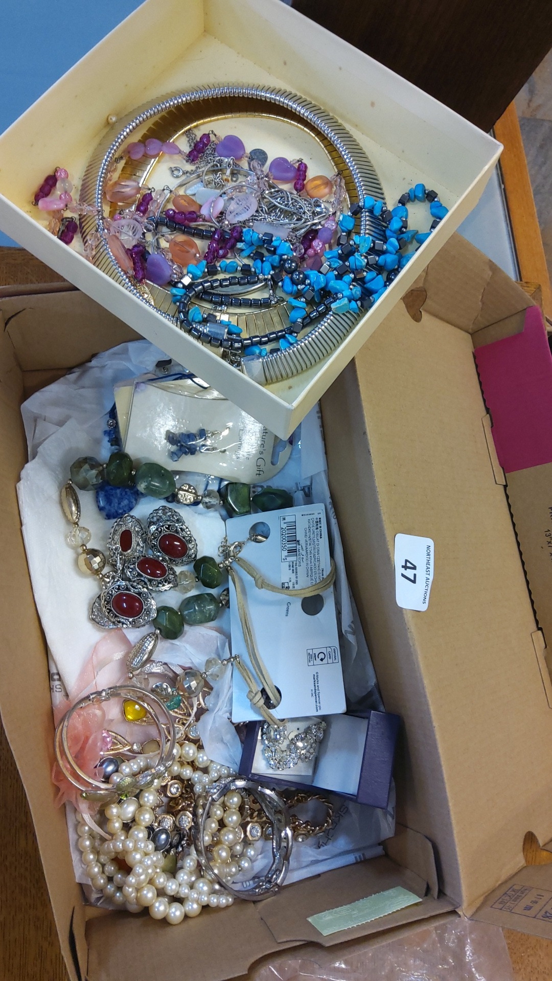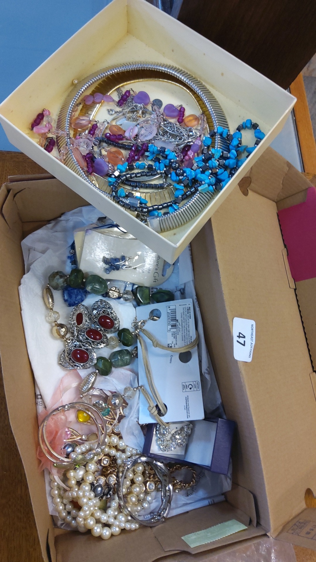 A group of costume jewellery including bead necklaces, charm and link chains, bangles, faux-pearl strands, and turquoise-coloured and hematite-style beadwork, together with assorted pendant elements, presented loose within two boxes.