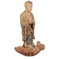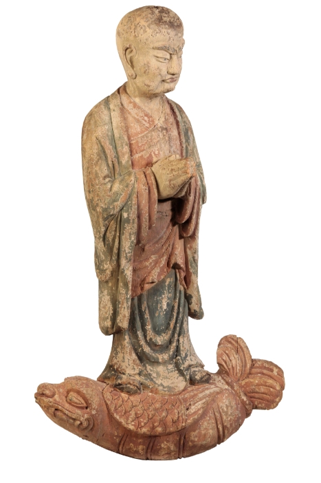 A CHINESE CARVED WOOD AND POLYCHROME LOHAN, PROBABLY LATE MING, modelled riding on the back of a fish, 82cm high