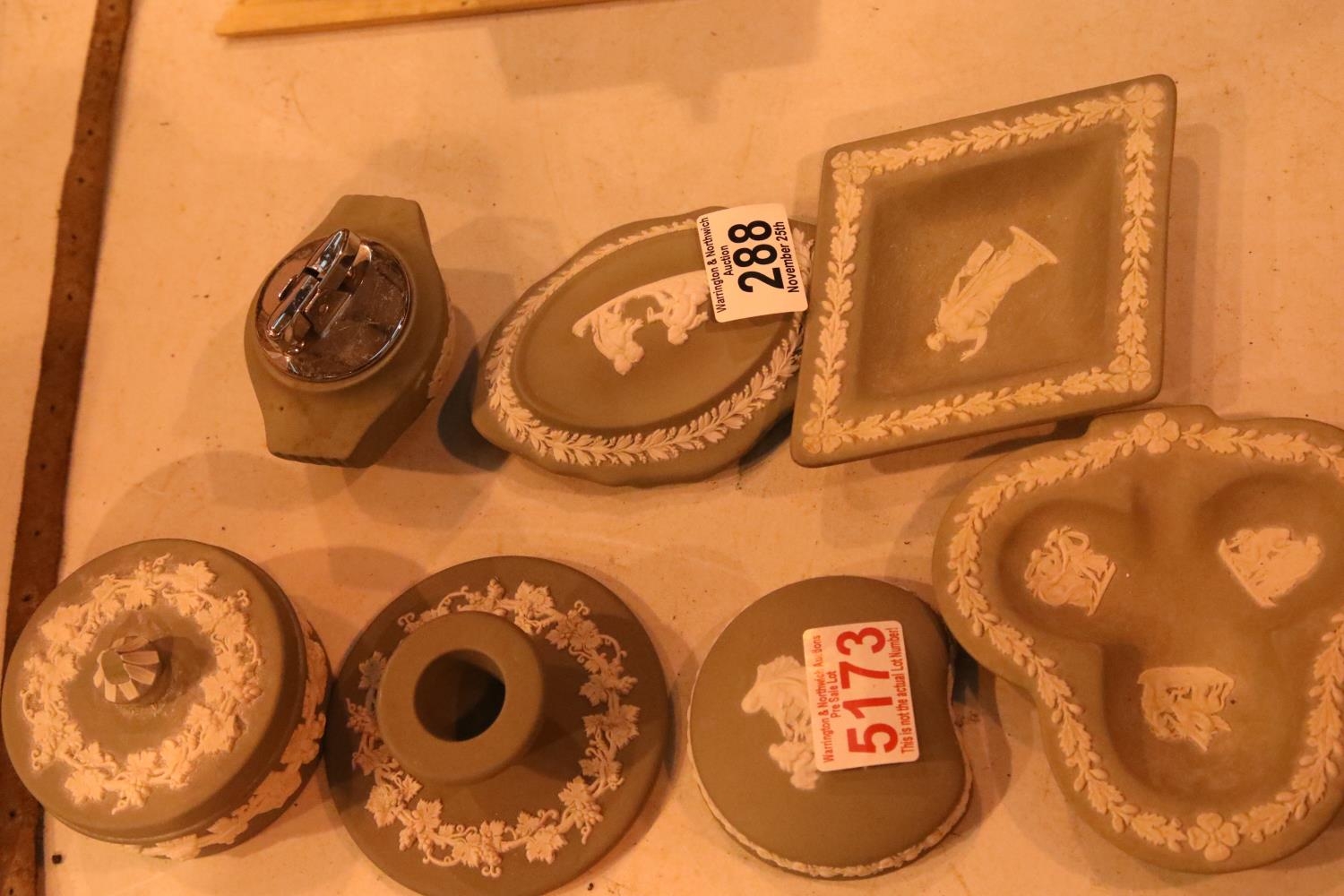 Wedgwood green jasperware table lighter, two pin dishes, lidded box and an oval tray. Not available for in-house P&P