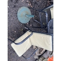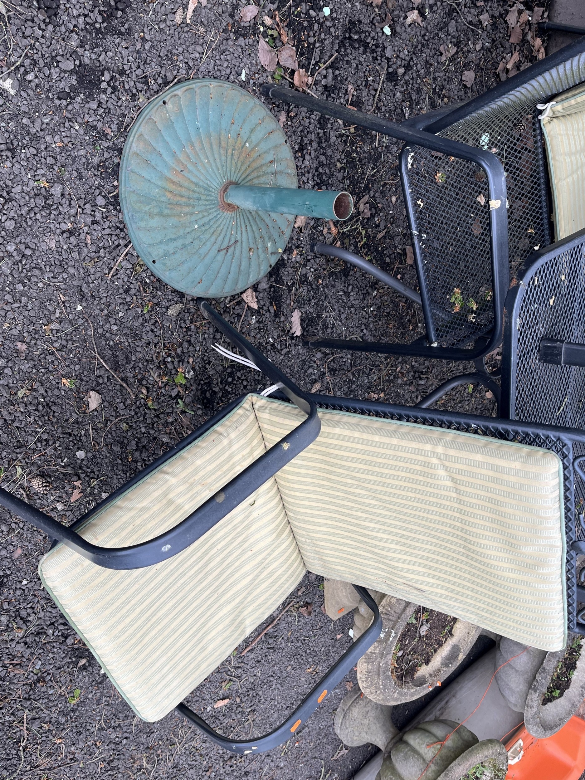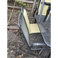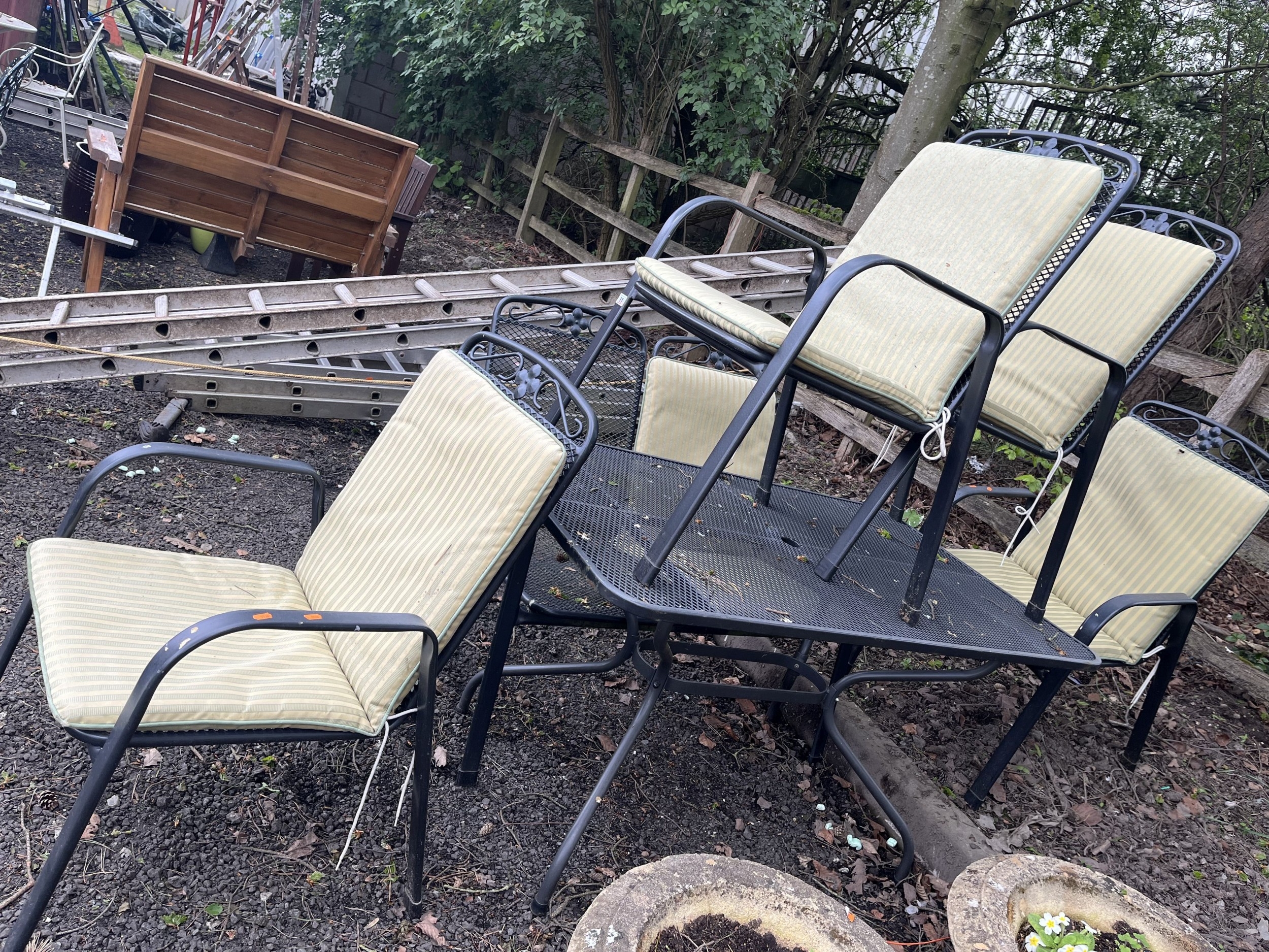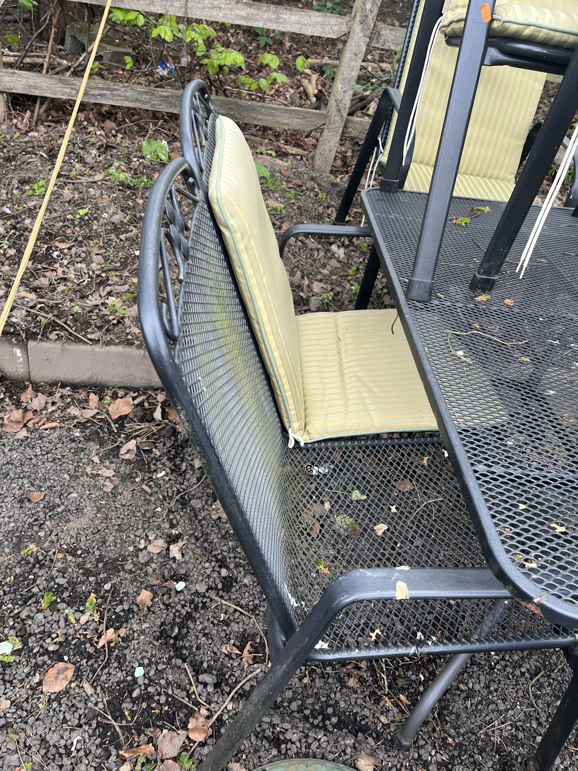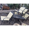 A METAL GARDEN TABLE, A BENCH AND FOUR CHAIRS with five sets of cushions, table 130cm long and 80cm wide