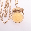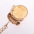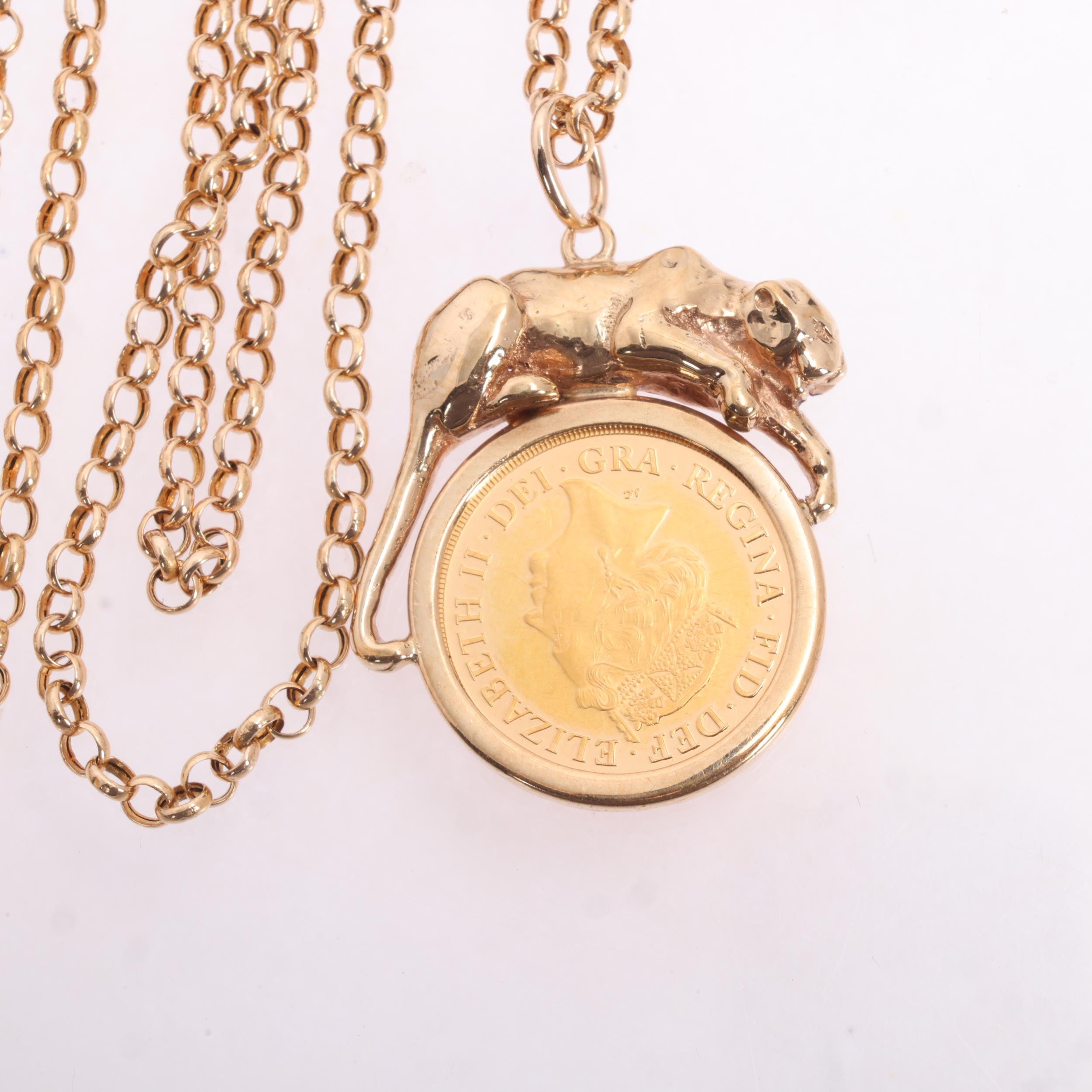 An Elizabeth II 2019 gold half sovereign coin, in 9ct gold panther pendant necklace mount, with 9ct gold belcher link chain, pendant 29.5mm, chain 62cm, 10.3g