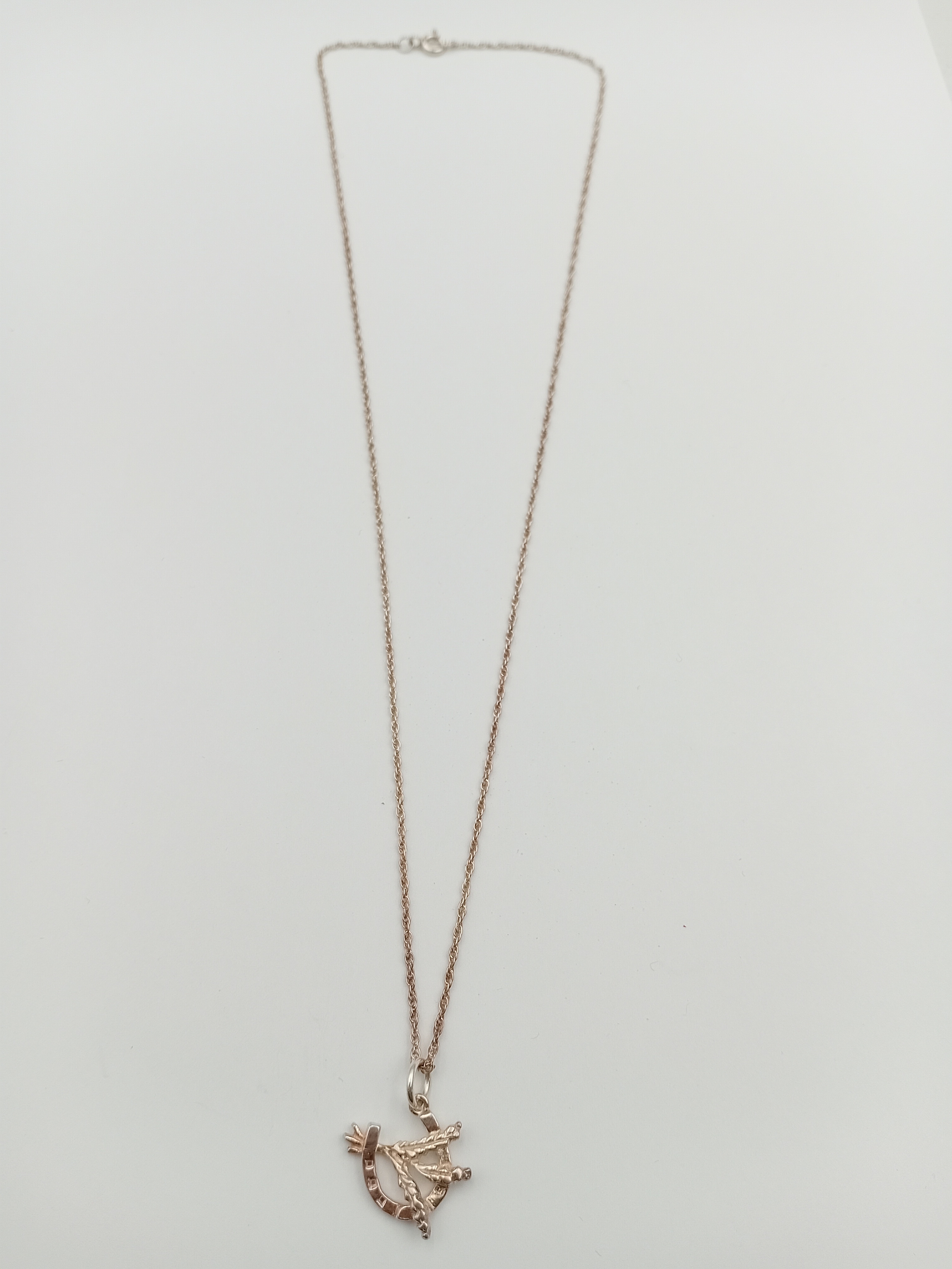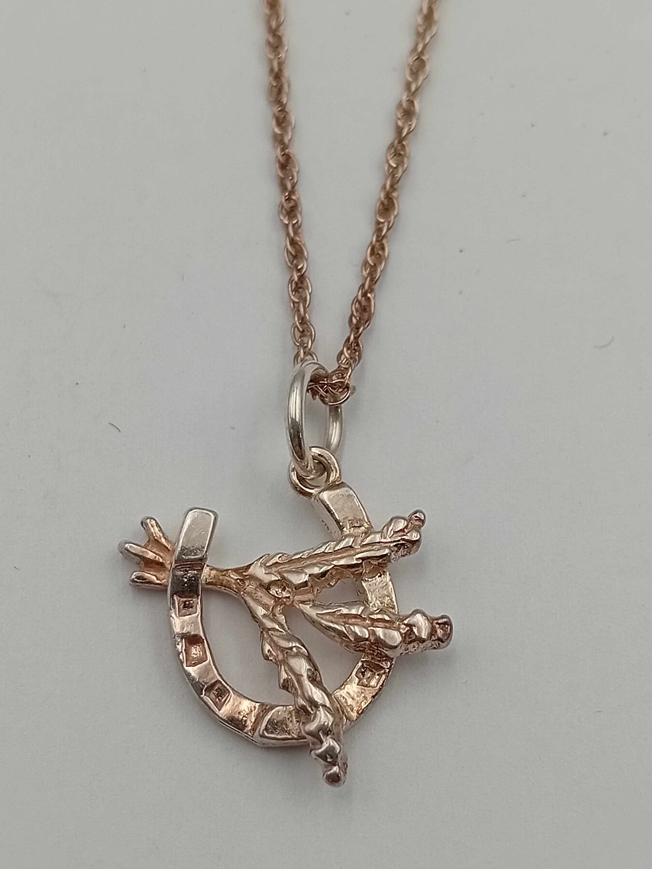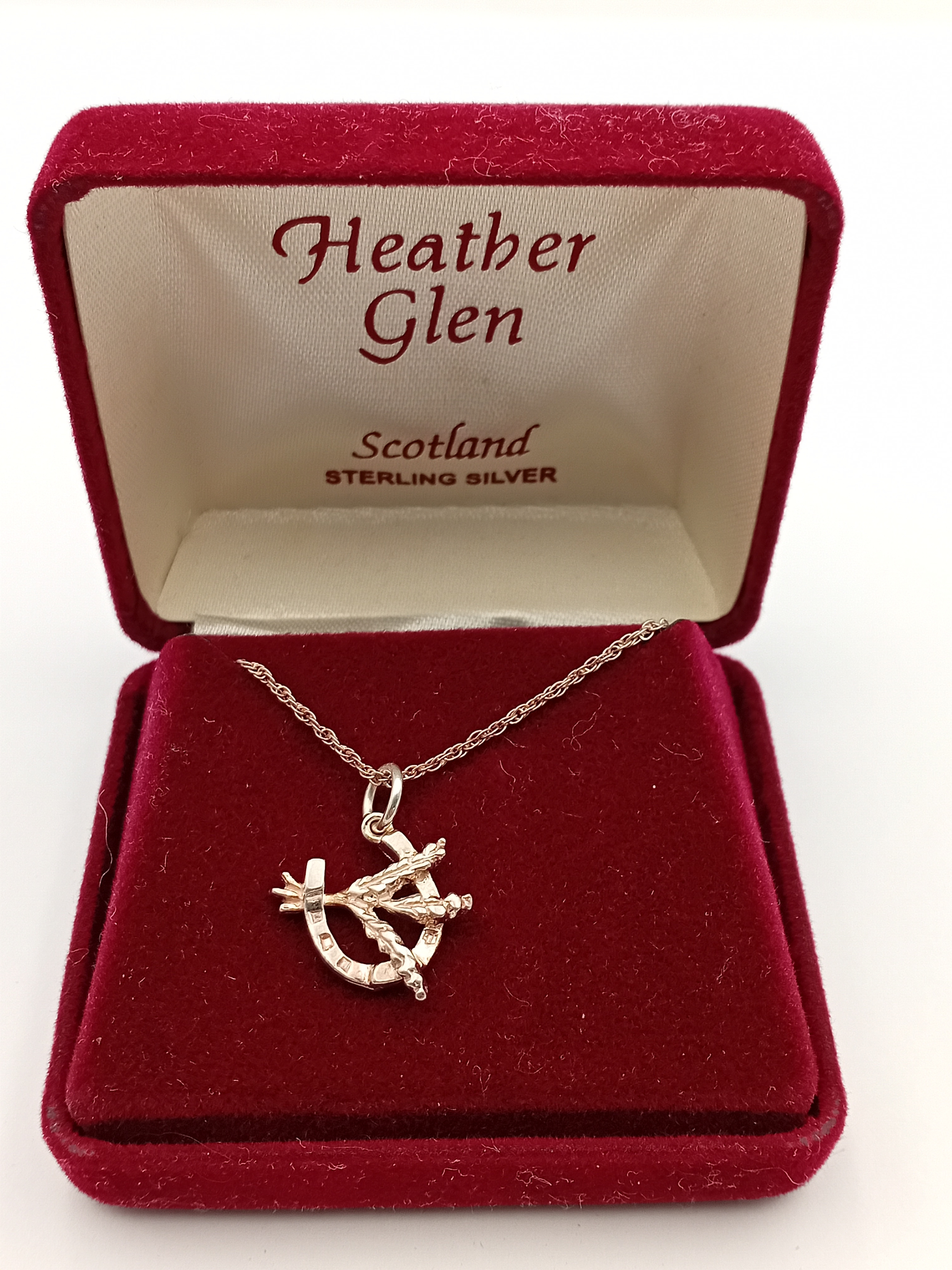 A stamped 925 silver necklace with a lucky Heather horseshoe pendant. In the original Heather Glen box.