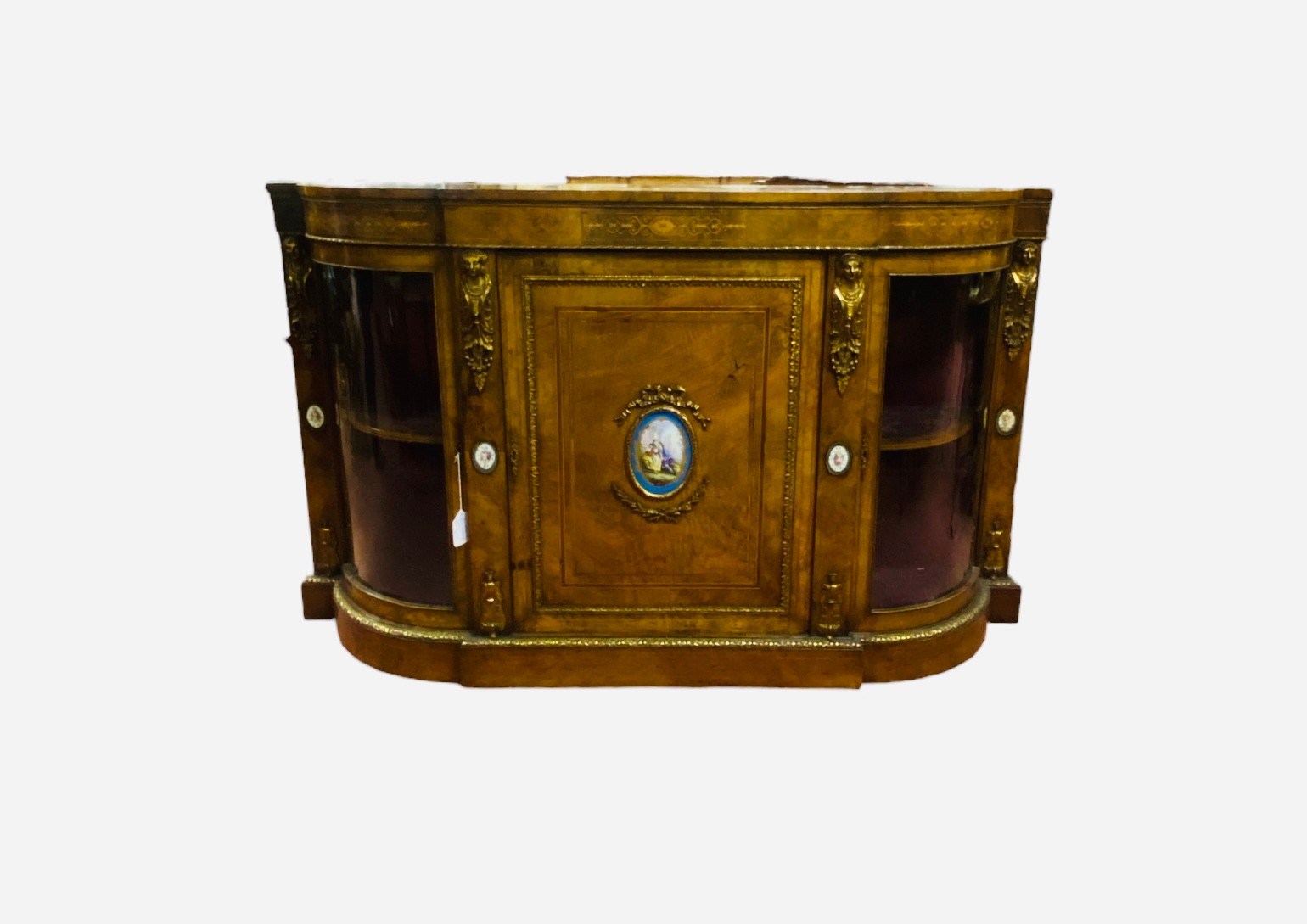 Exceptional Quality Burr Walnut Ormolu Mount Breakfront Credenza with Hand Painted Serves