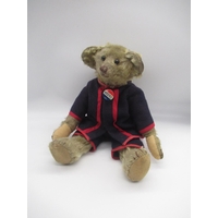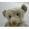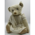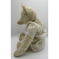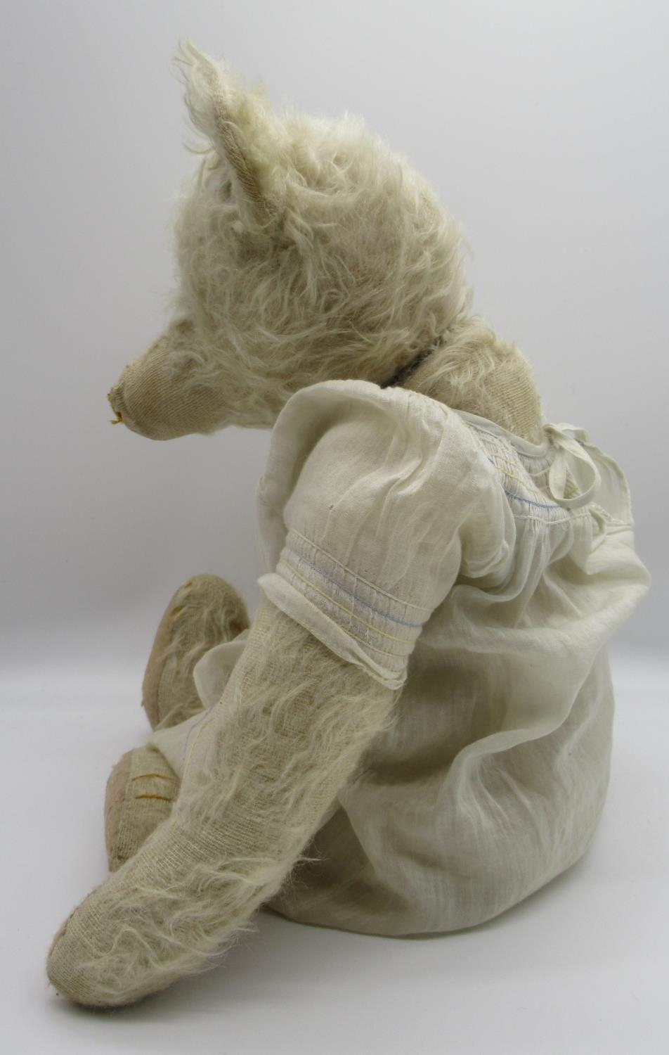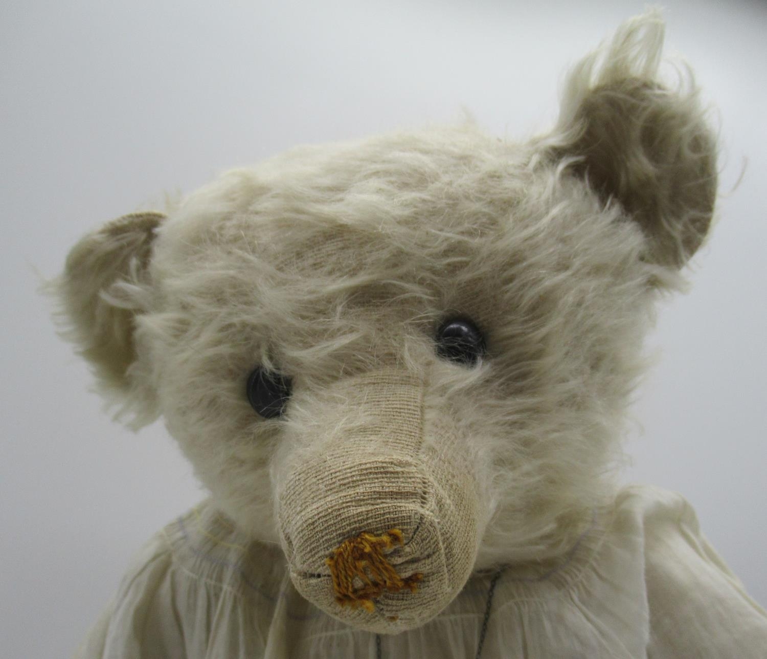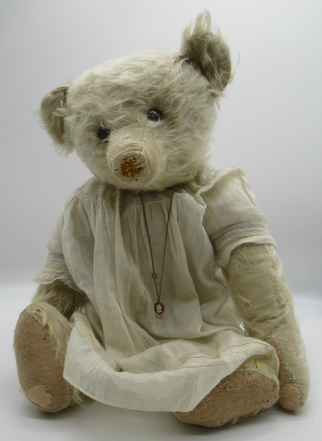 Early C20th teddy bear in long white mohair with flat button eyes shaved muzzle jointed arms and legs, swivel neck and small hump wearing a white dress and cameo necklace H45.5cm