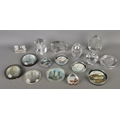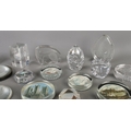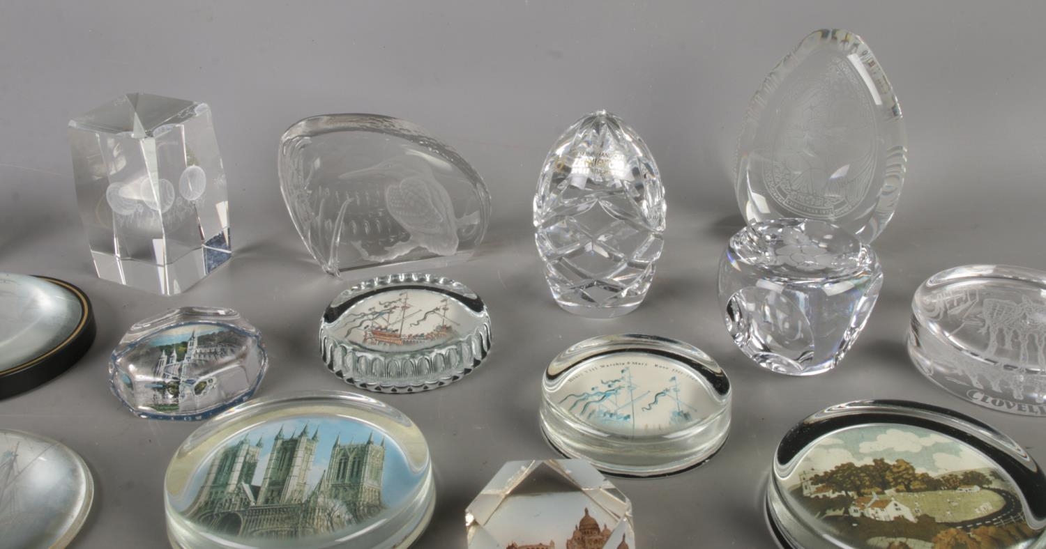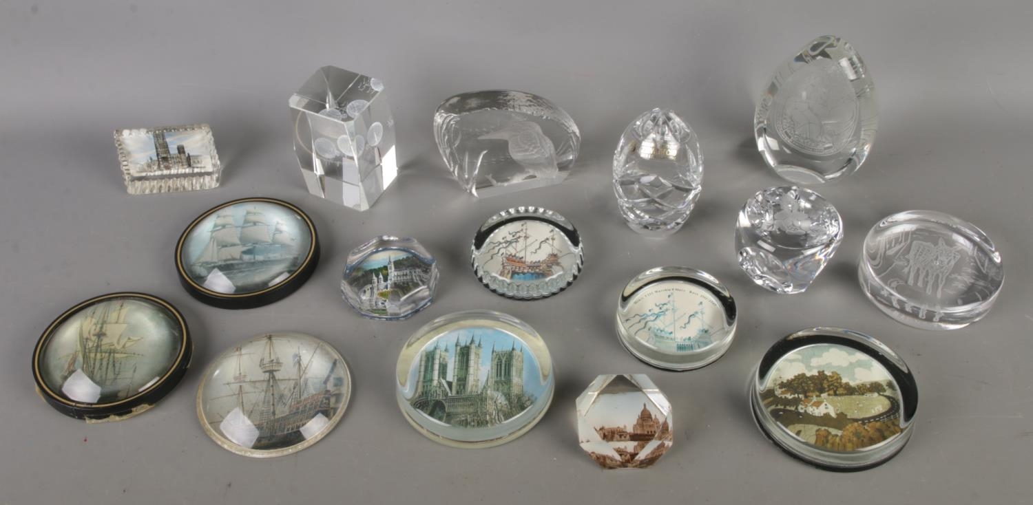 Sixteen decorative glass paperweights some featuring pictures through clear glass; Two Wedgwood examples including a Kingfisher engraved and a Christmas 1977 example, etched examples, a Zawiercie cut glass example and vintage examples depicting ships at sail and landmark buildings etc.