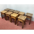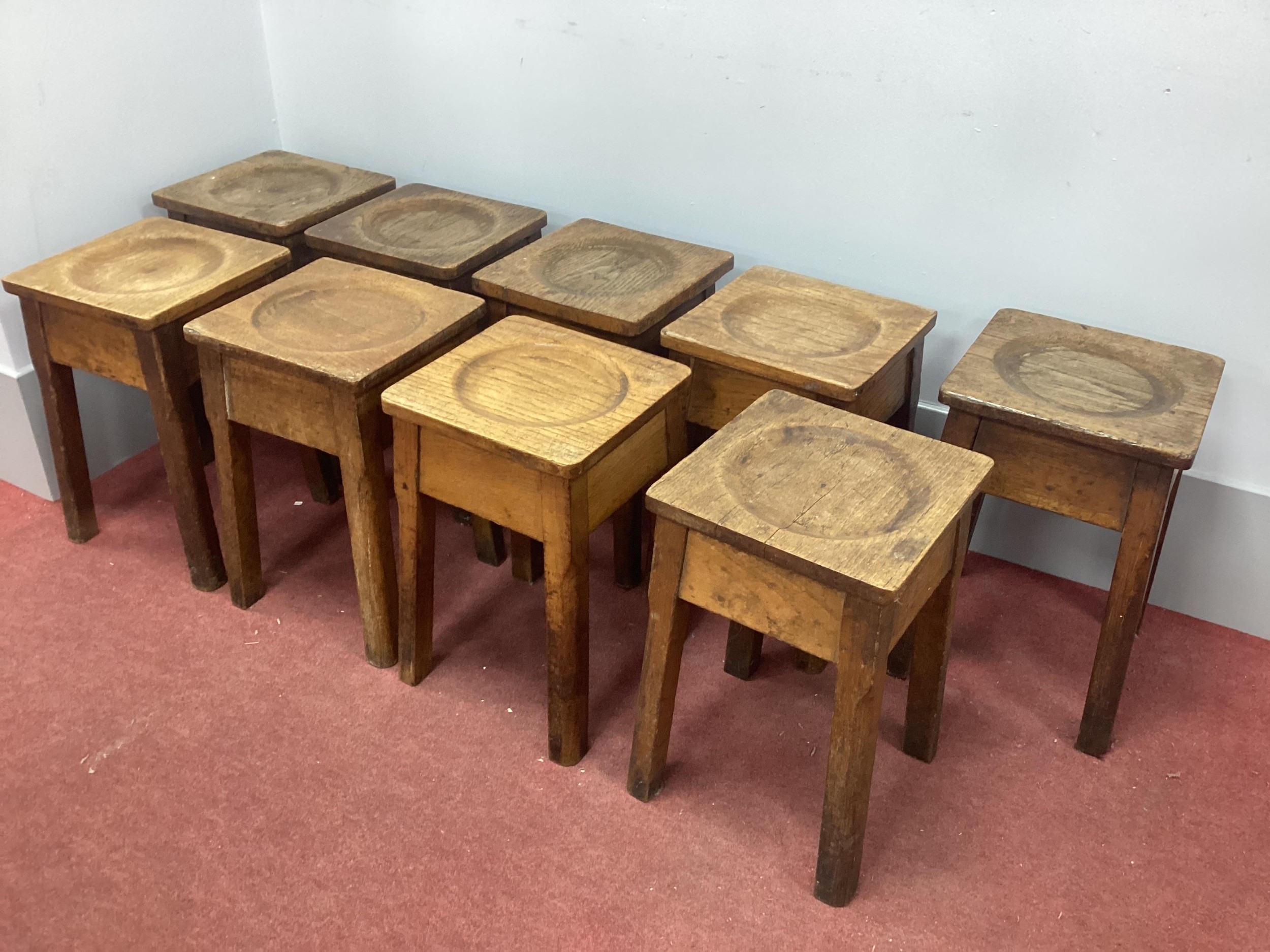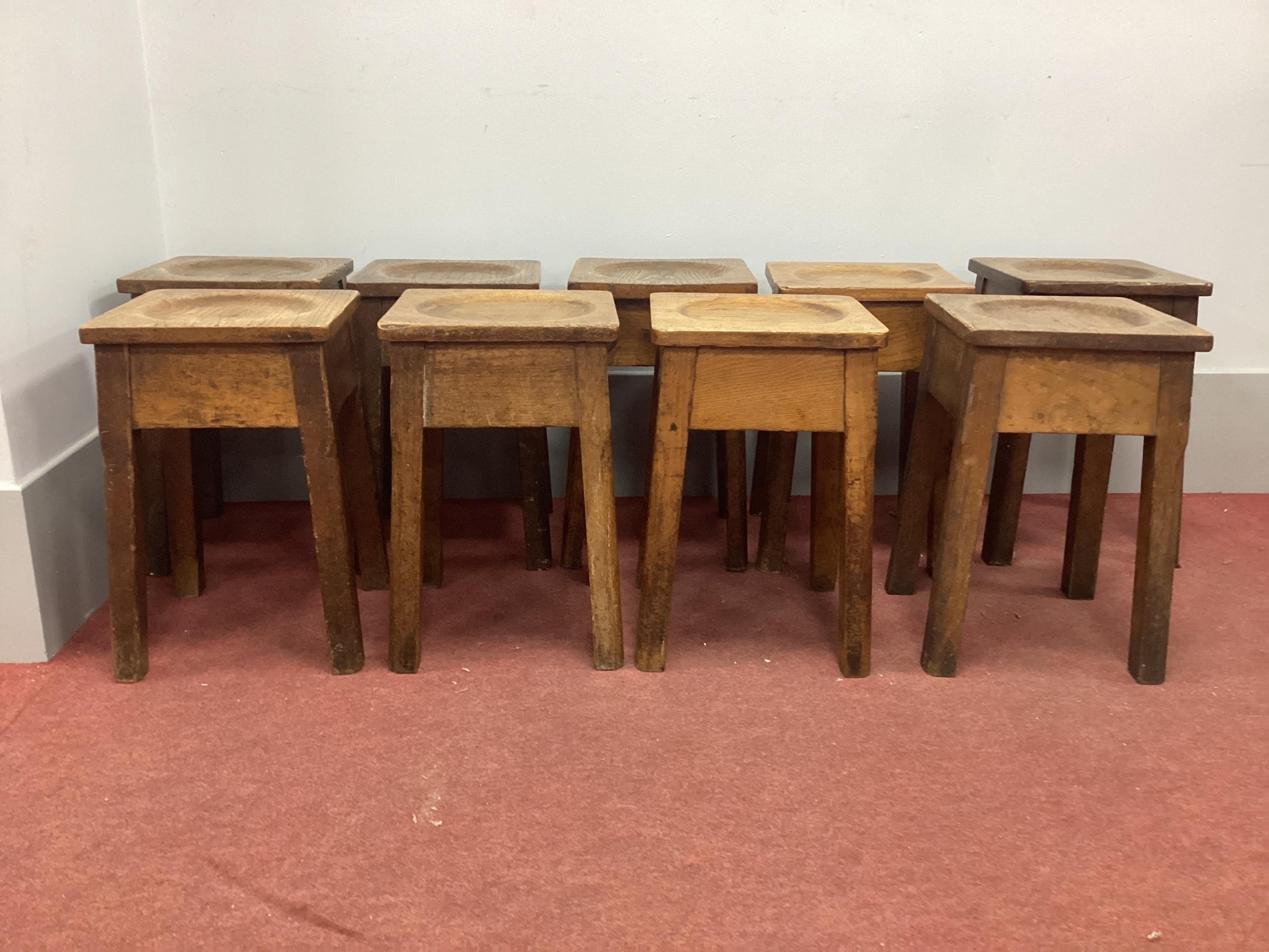 A Set of Nine Oak Stools, with square tops, dished seats on square supports.