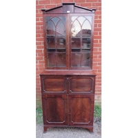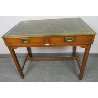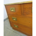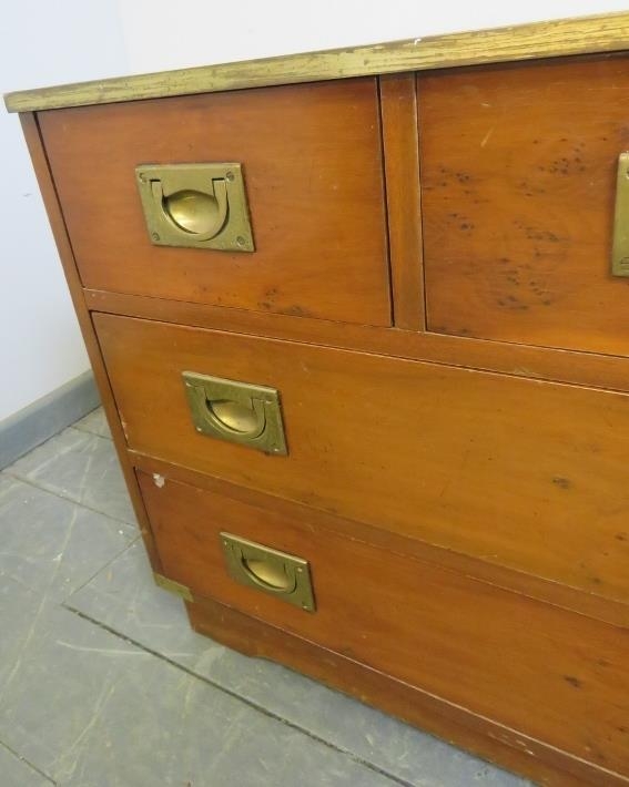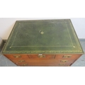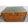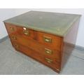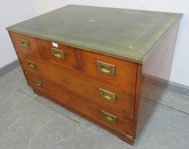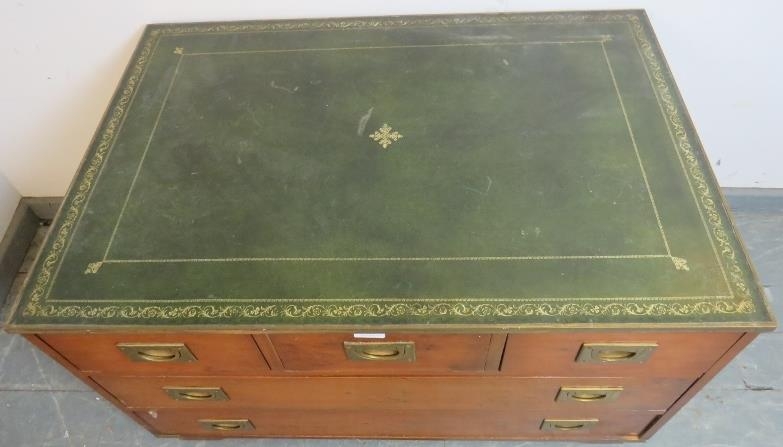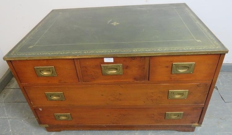 A vintage yew wood campaign style chest with inset green leather gilt tooled surface, housing three short over two long drawers with brass campaign handles, on a plinth base. H57 W92 D62 (approx).