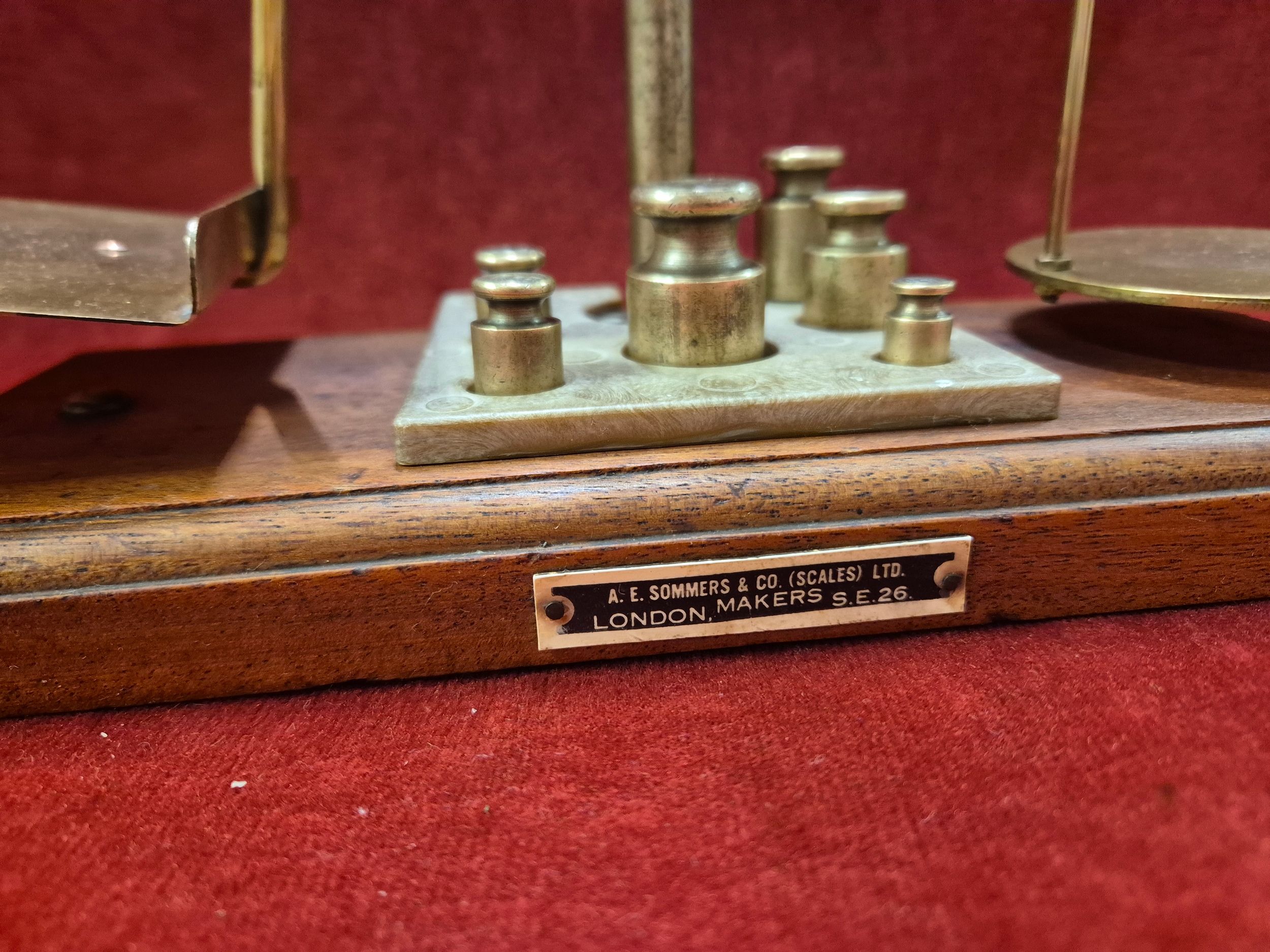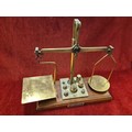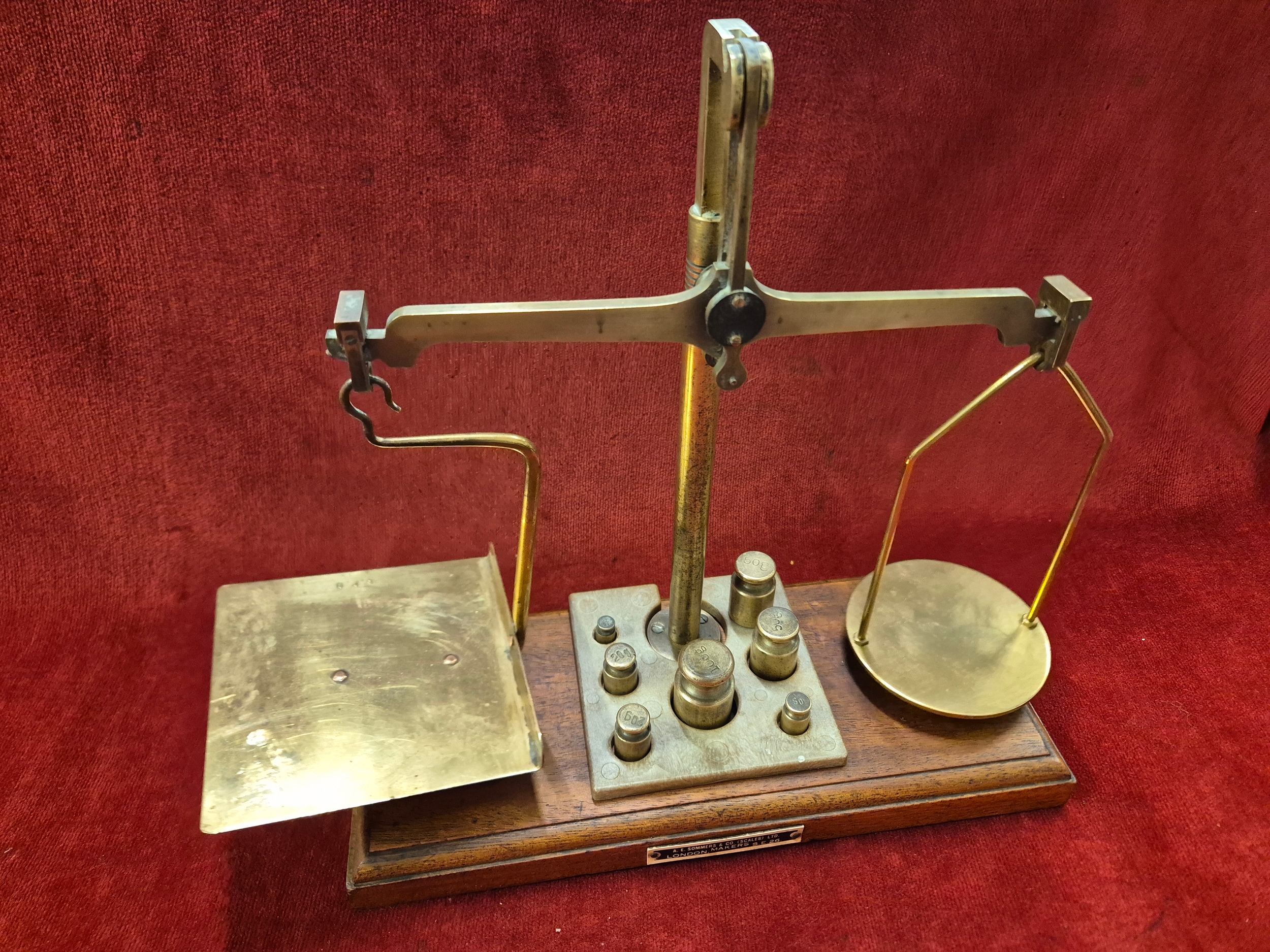 Antique brass postal scales made by A.E. Somerset & Co with brass weights