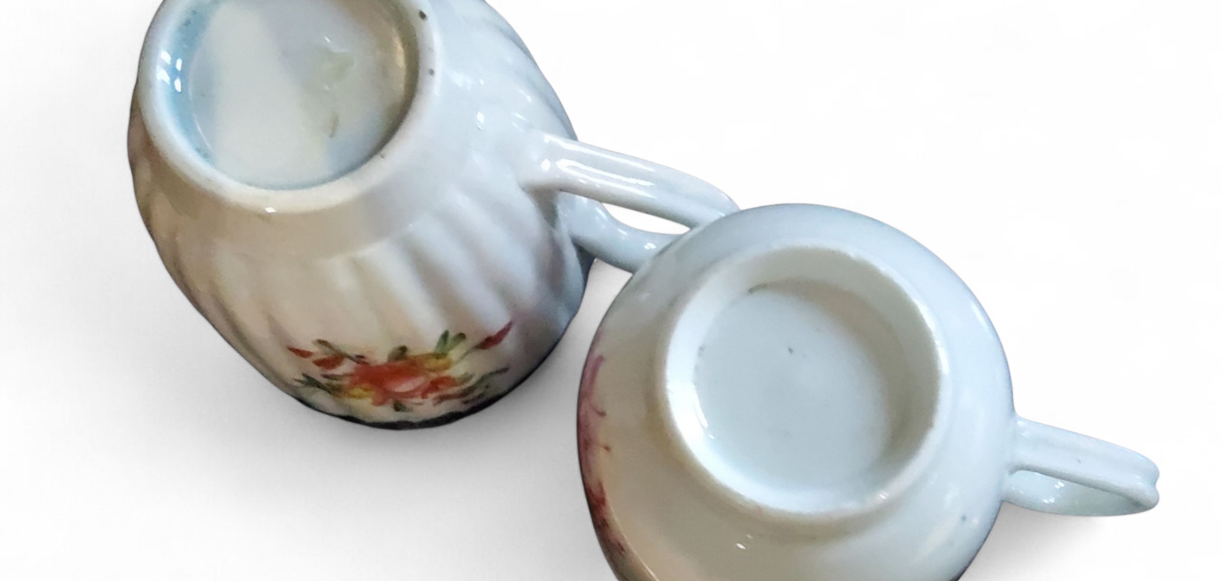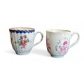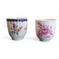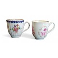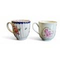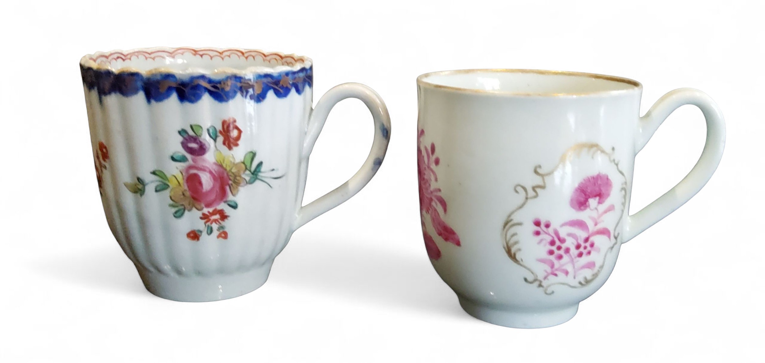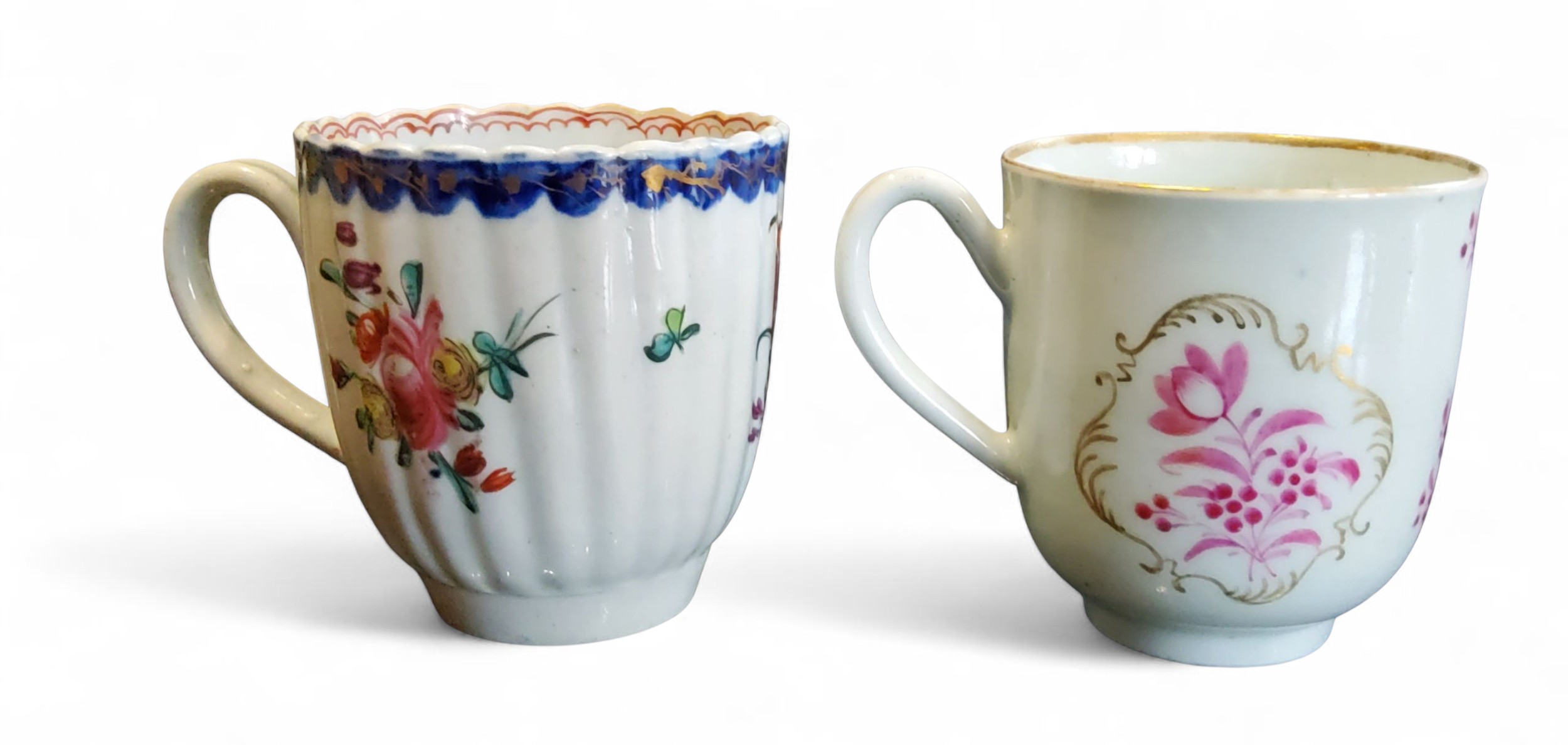 A Liverpool Pennington fluted coffee cup, decorated with polychrome floral sprays, banded cobalt blue scalloped border, the interior with band in iron red, c.1770; another, Worcester, in puce, gilt line rim, c.1770 (2)