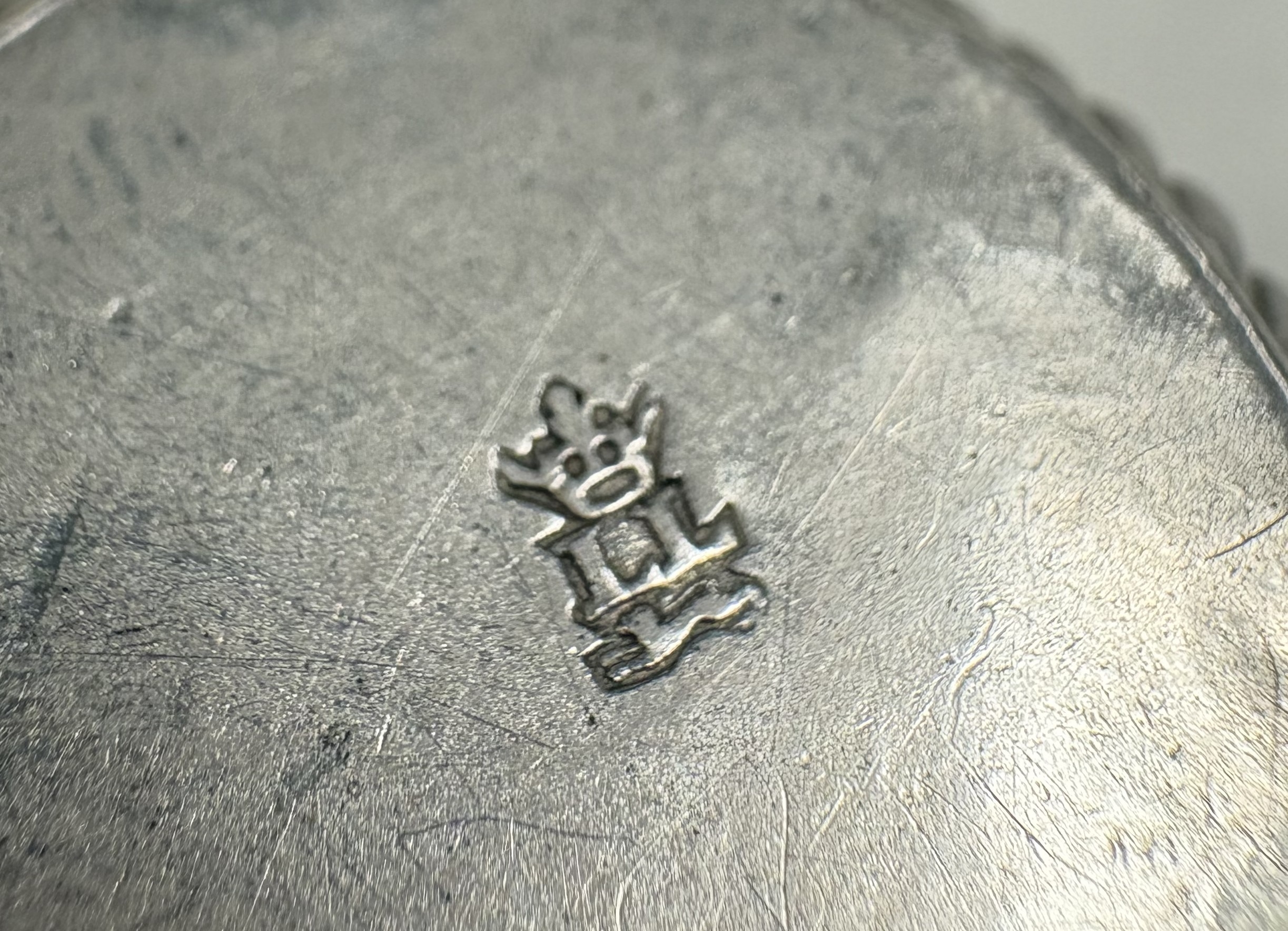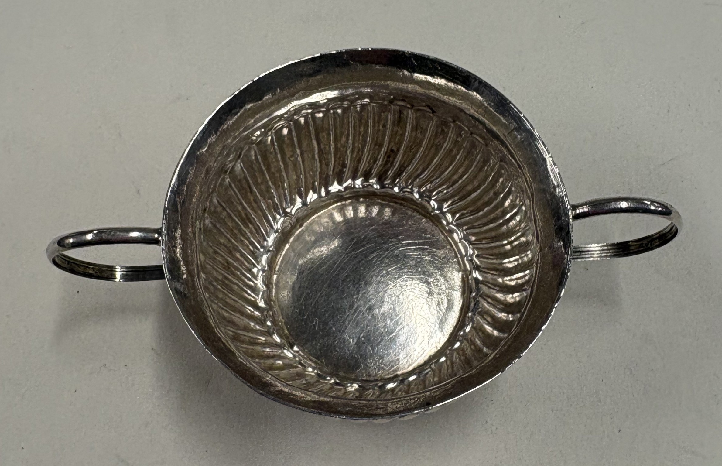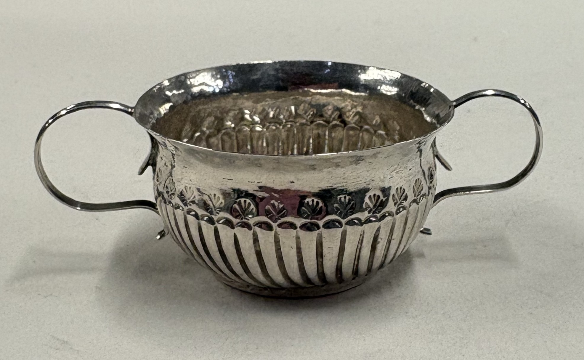 A miniature silver porringer with half-fluted decoration. London, circa 1725. By Louis Laroche. Approx. 16 grams. Est. £200 - £250.